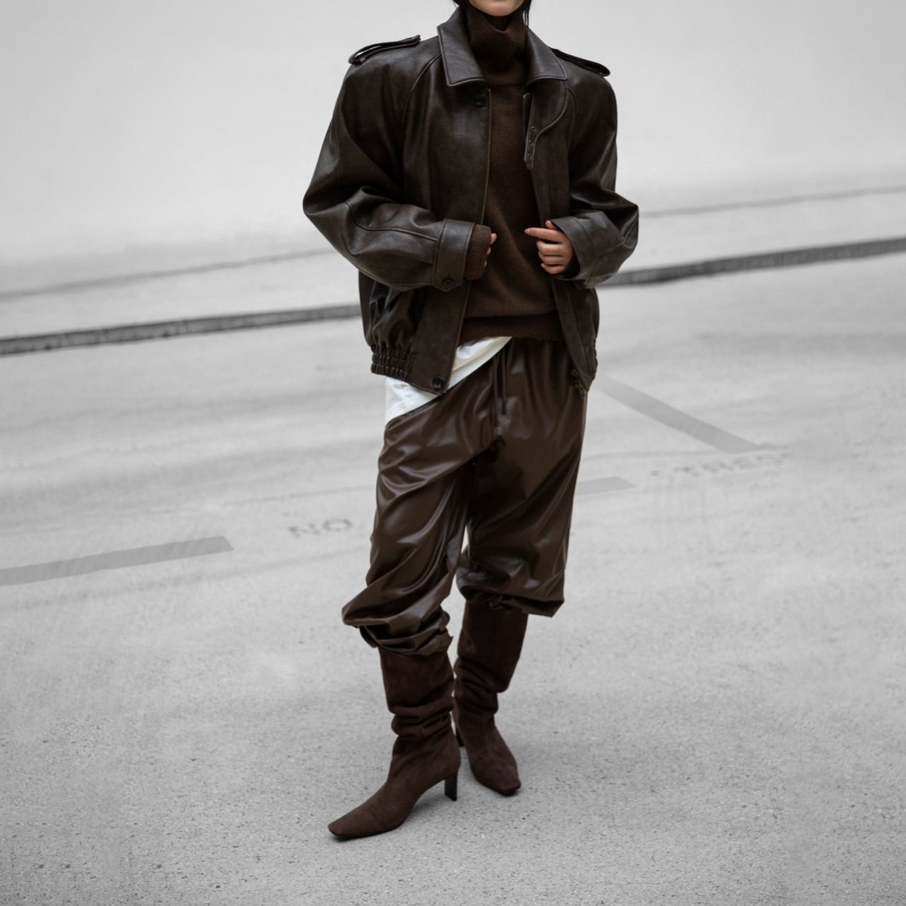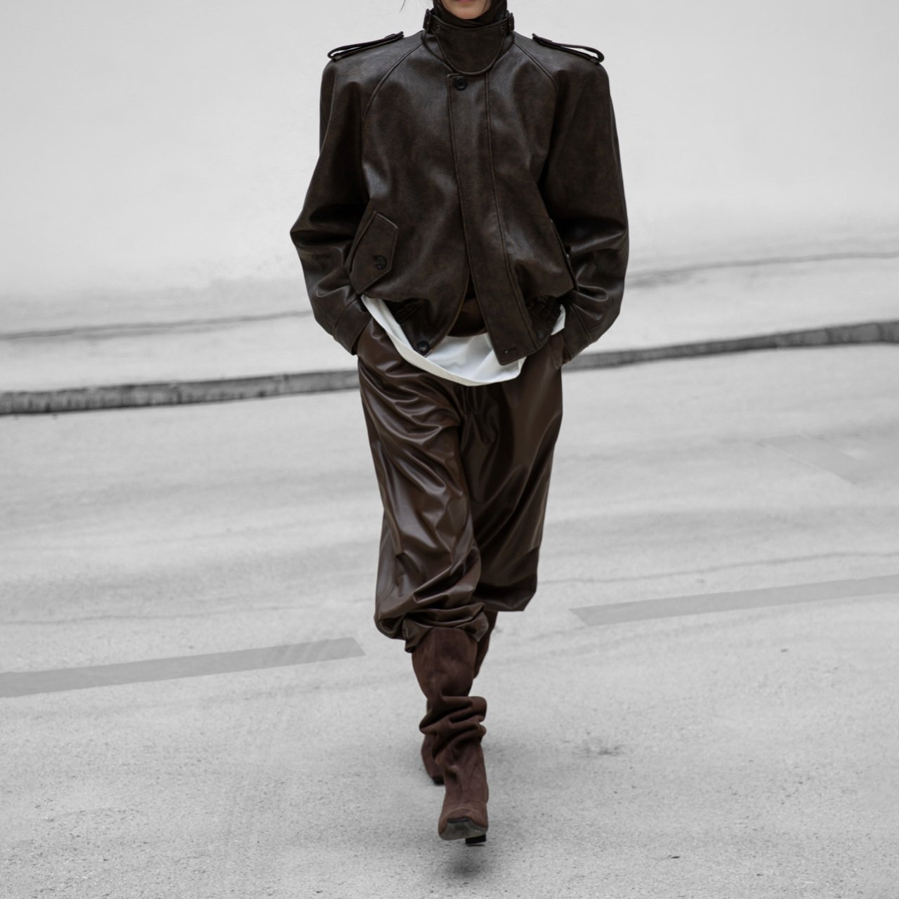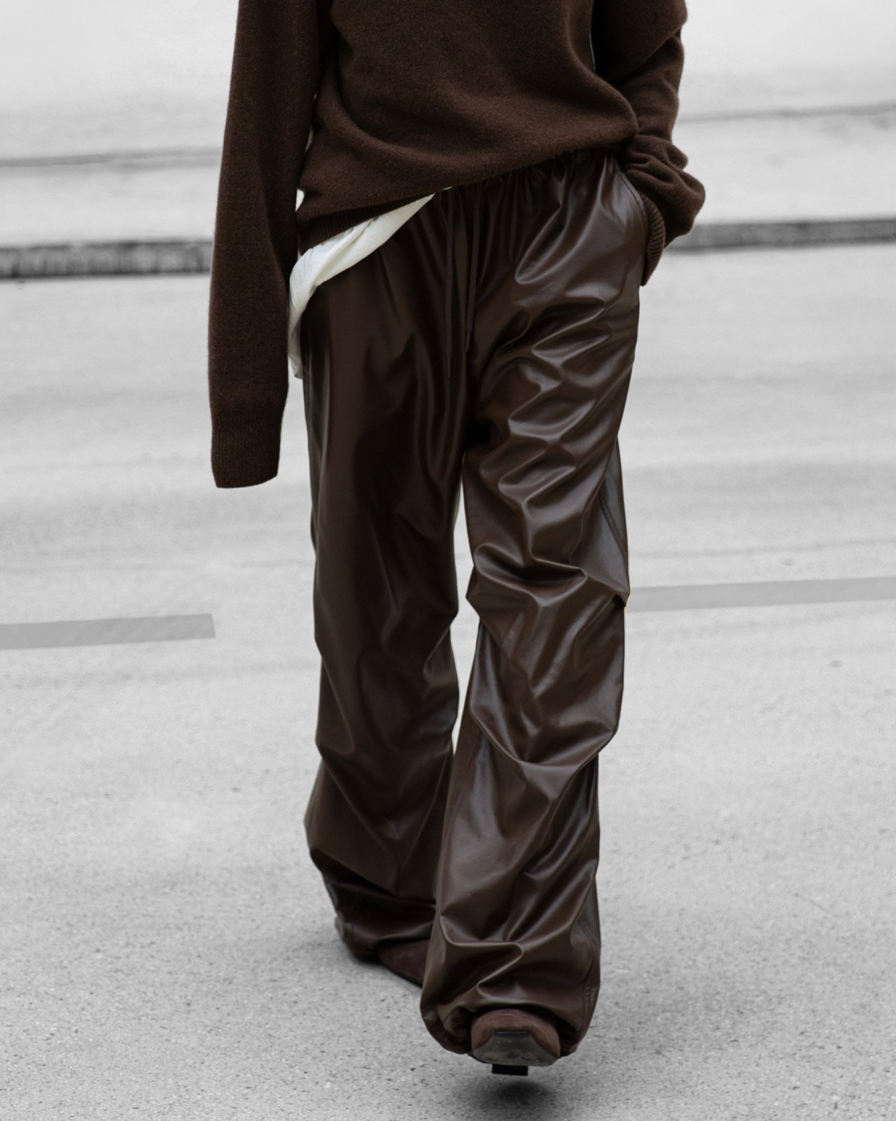 (PAPER MOON) GLOSSY LEATHER WIDE PARACHUTE PANTS_BROWN