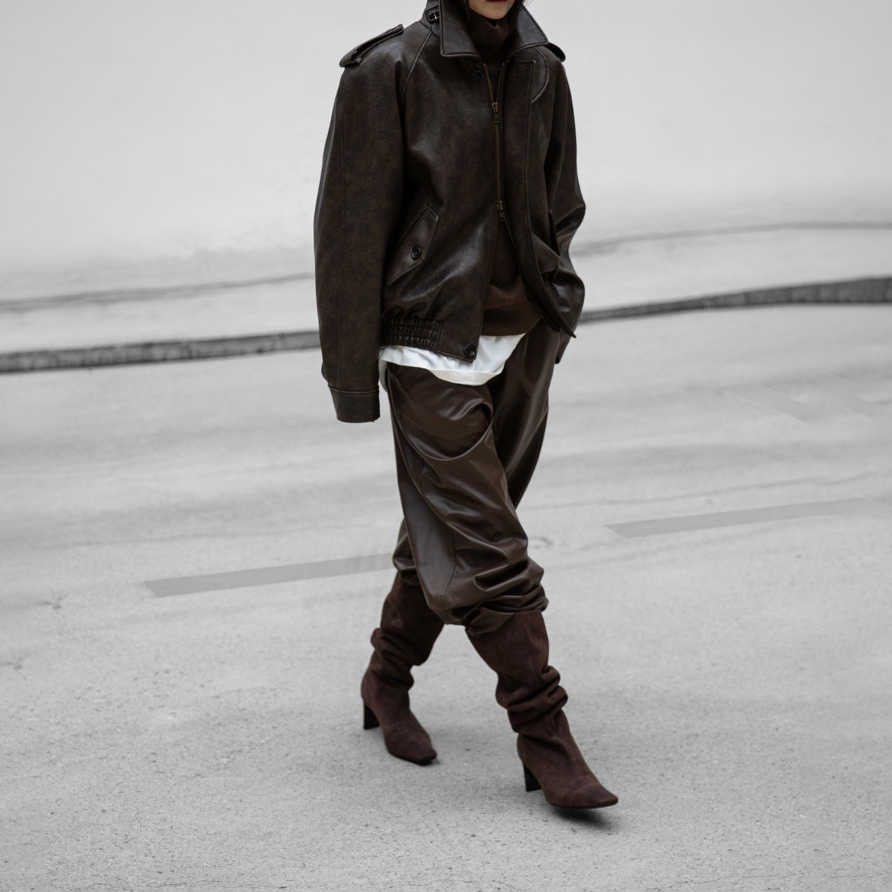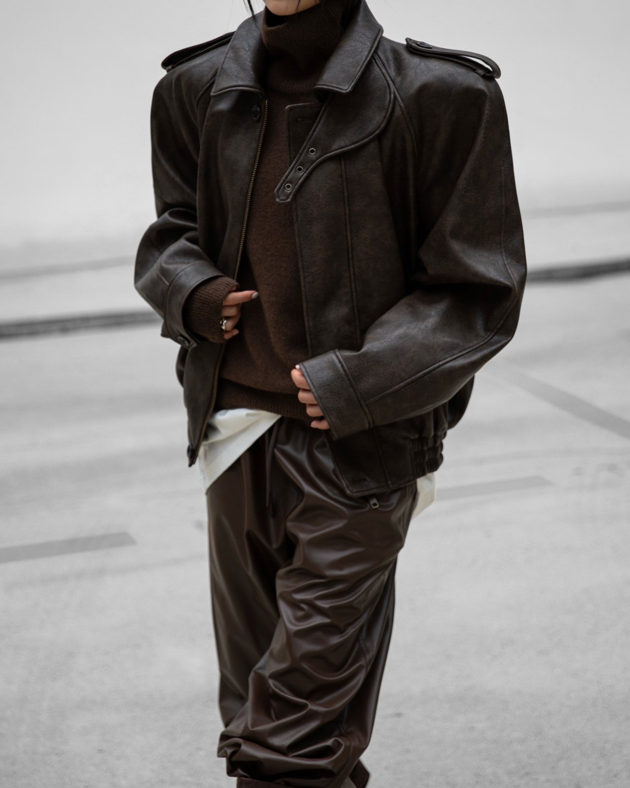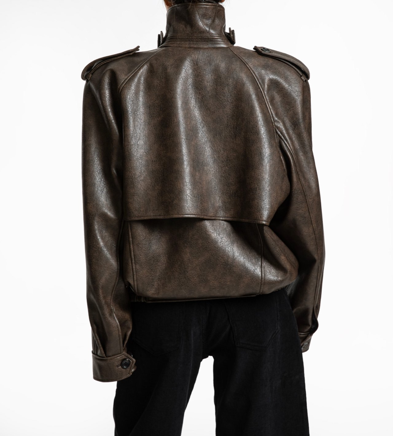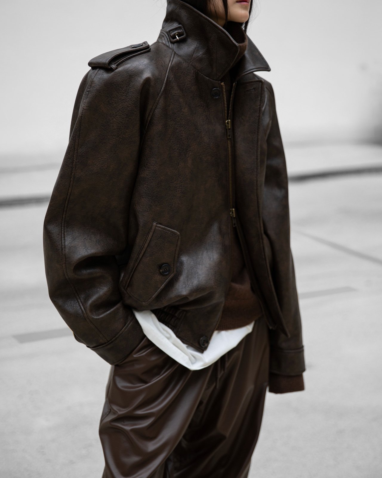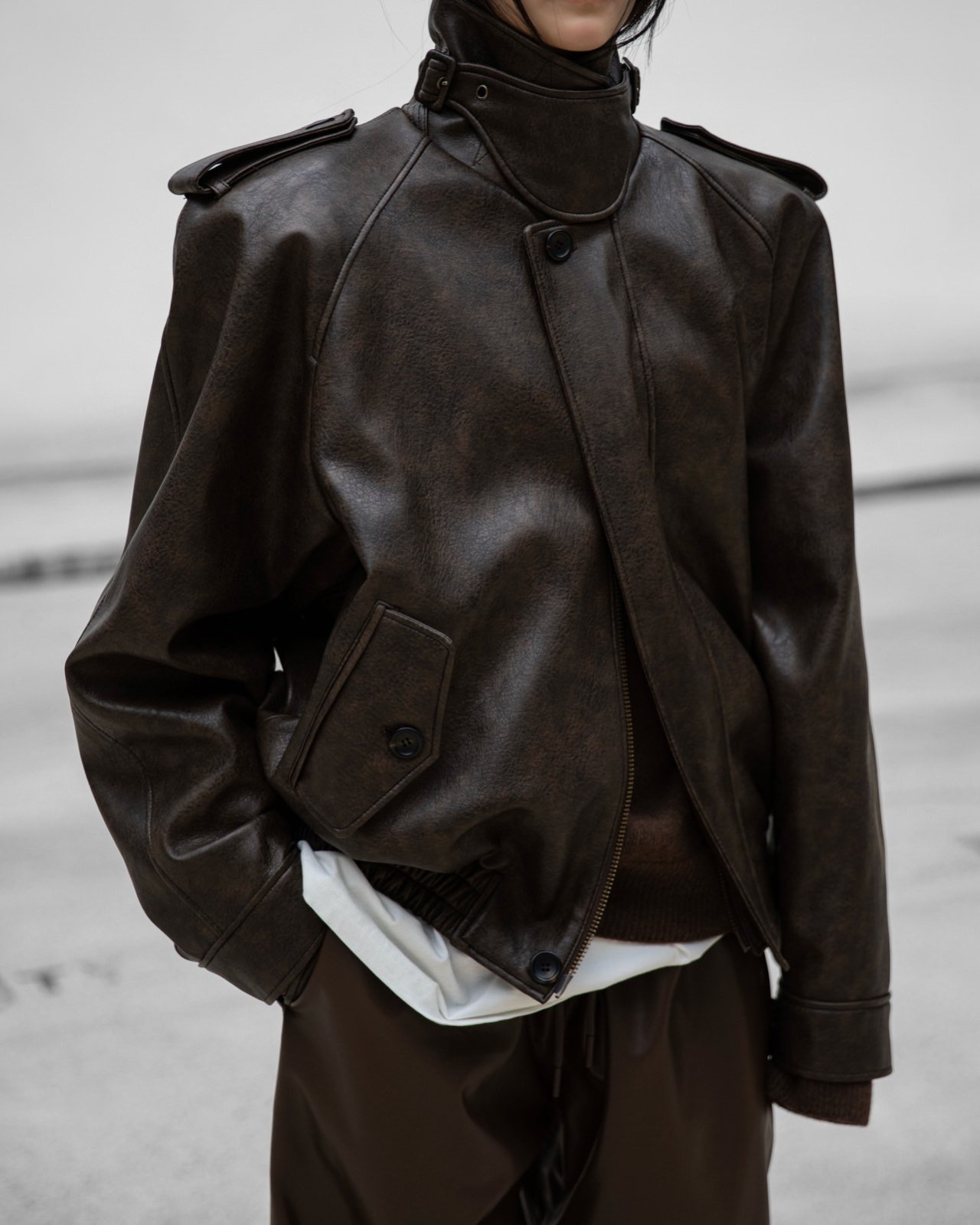 (PAPER MOON) OVERSIZIED VEGAN LEATHER BUTTON UP BOMBER JACKET_BROWN