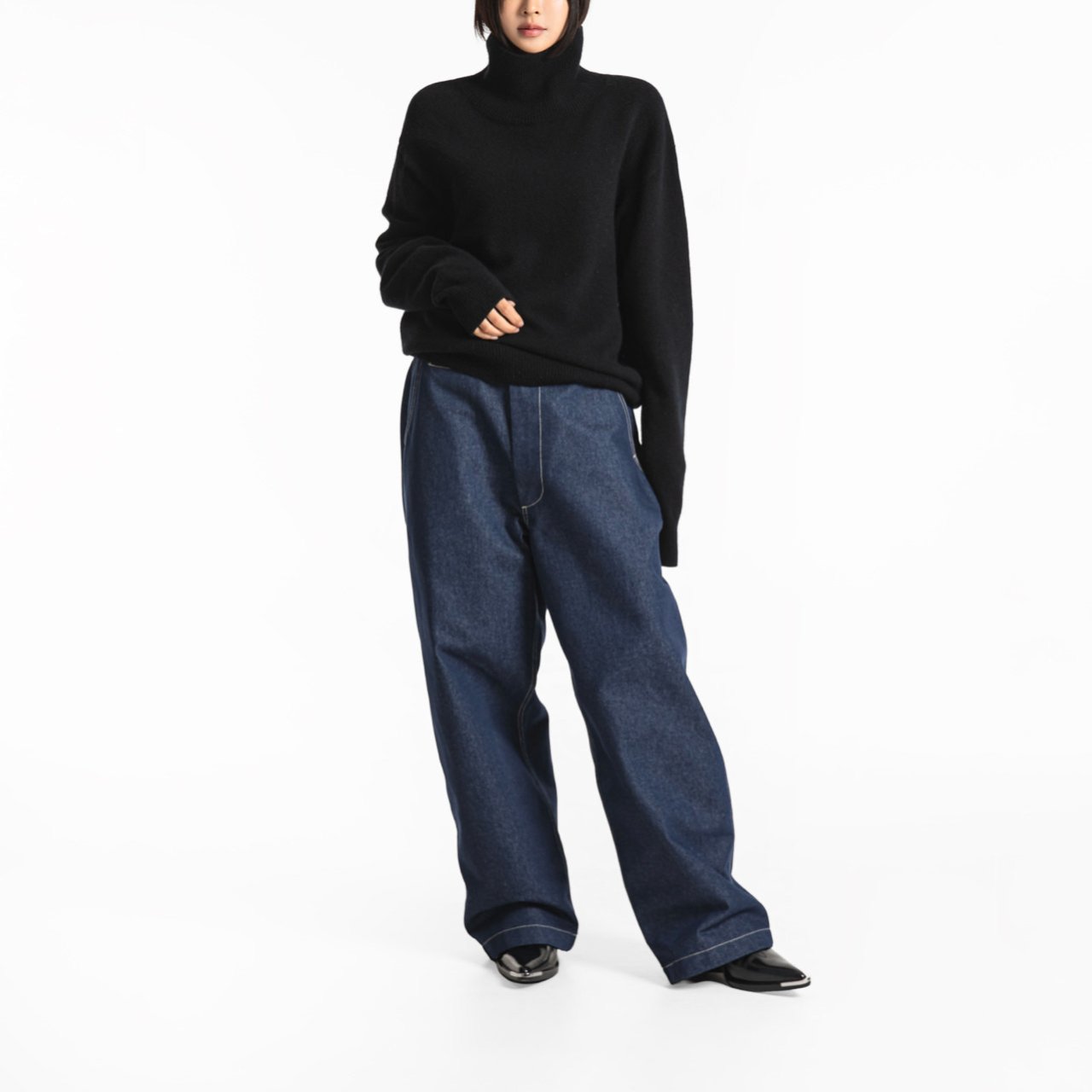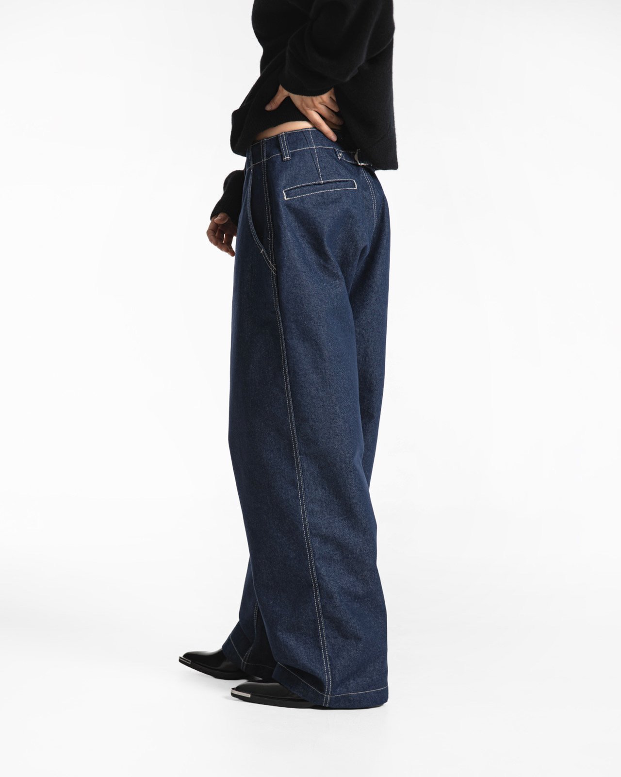 (PAPER MOON) STICHED DETAIL WIDE BAGGY DENIM PANTS : DEEP BLUE