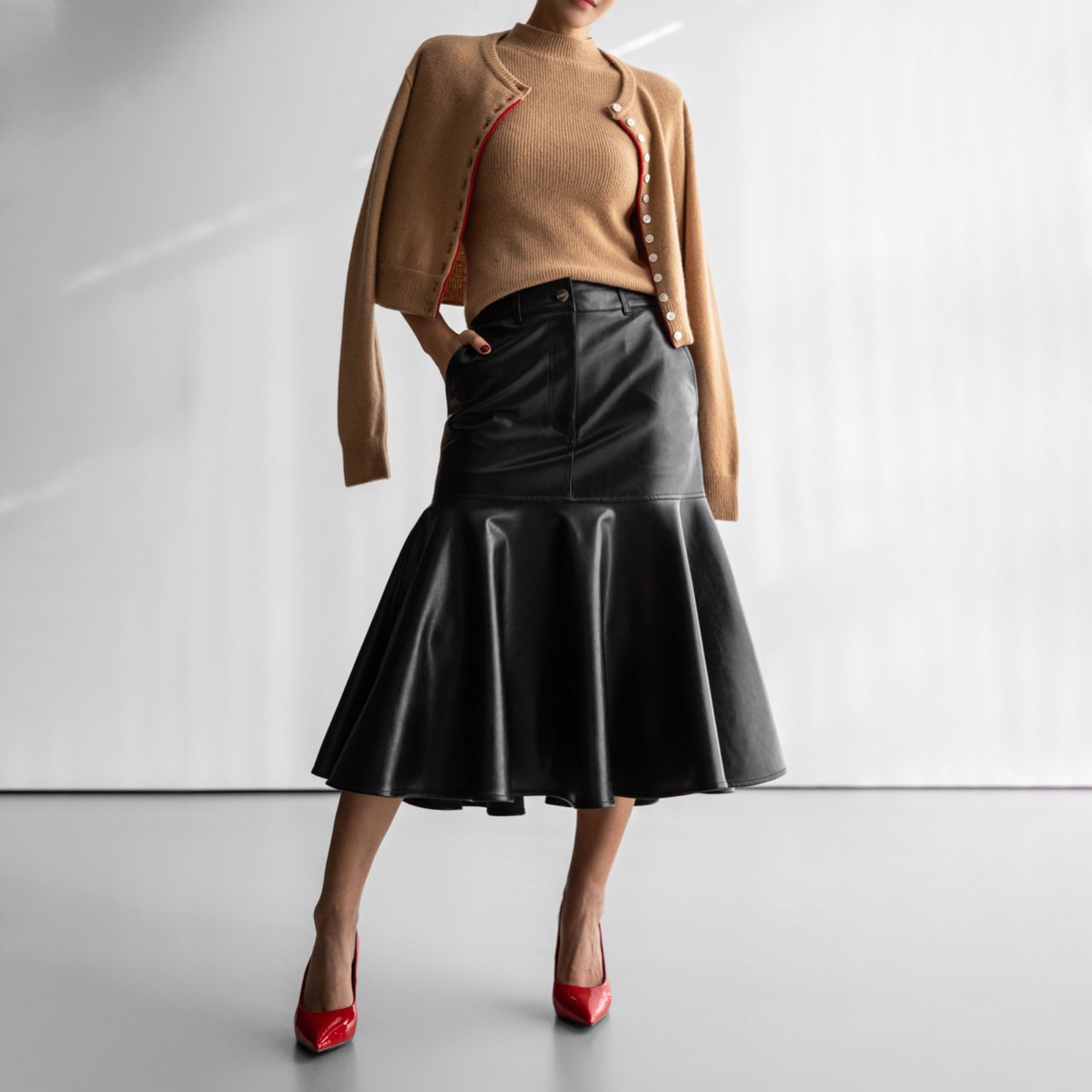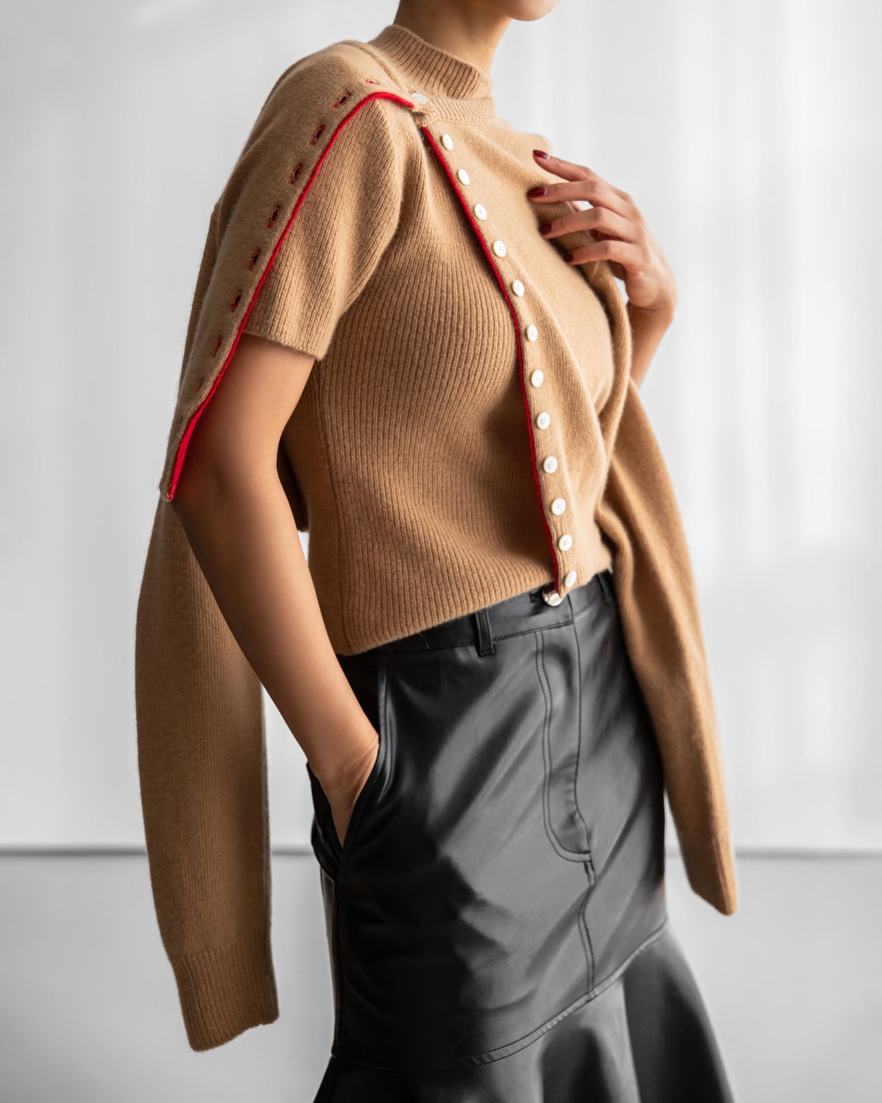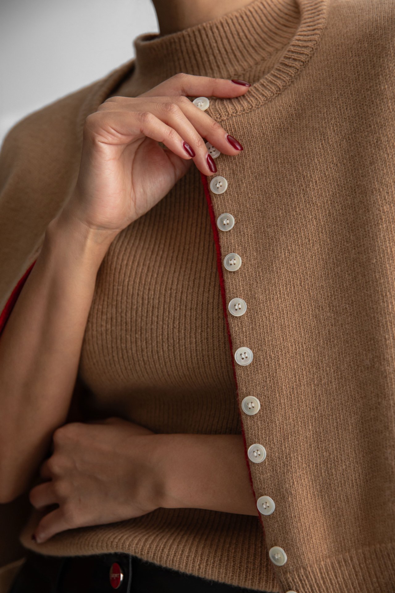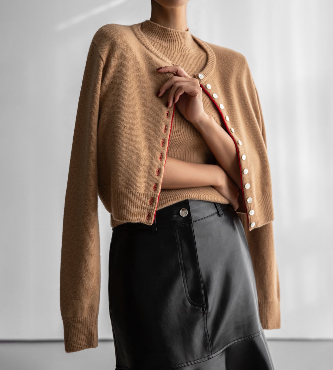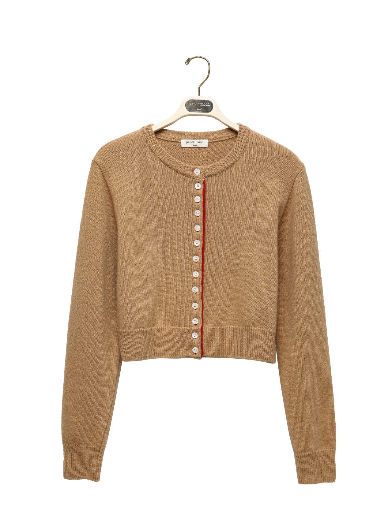 (PAPER MOON) COLOR BI - STITCHED BUTTON DETAIL CASHMERE WOOL CROPPED CARDIGAN : CAMEL BEIGE