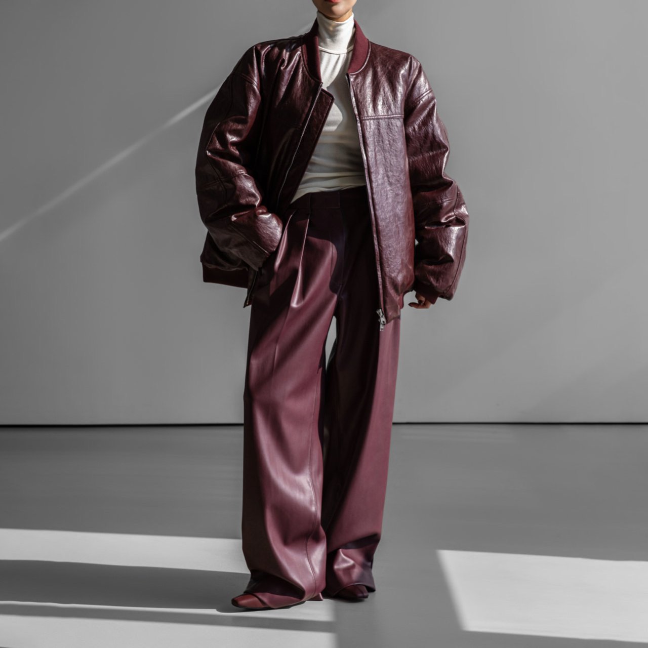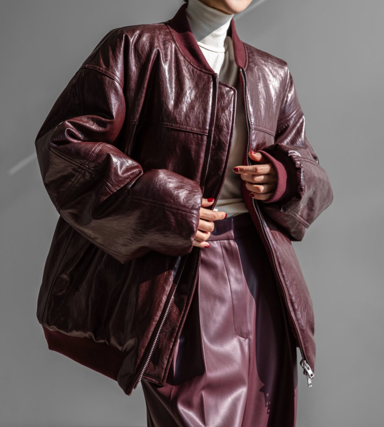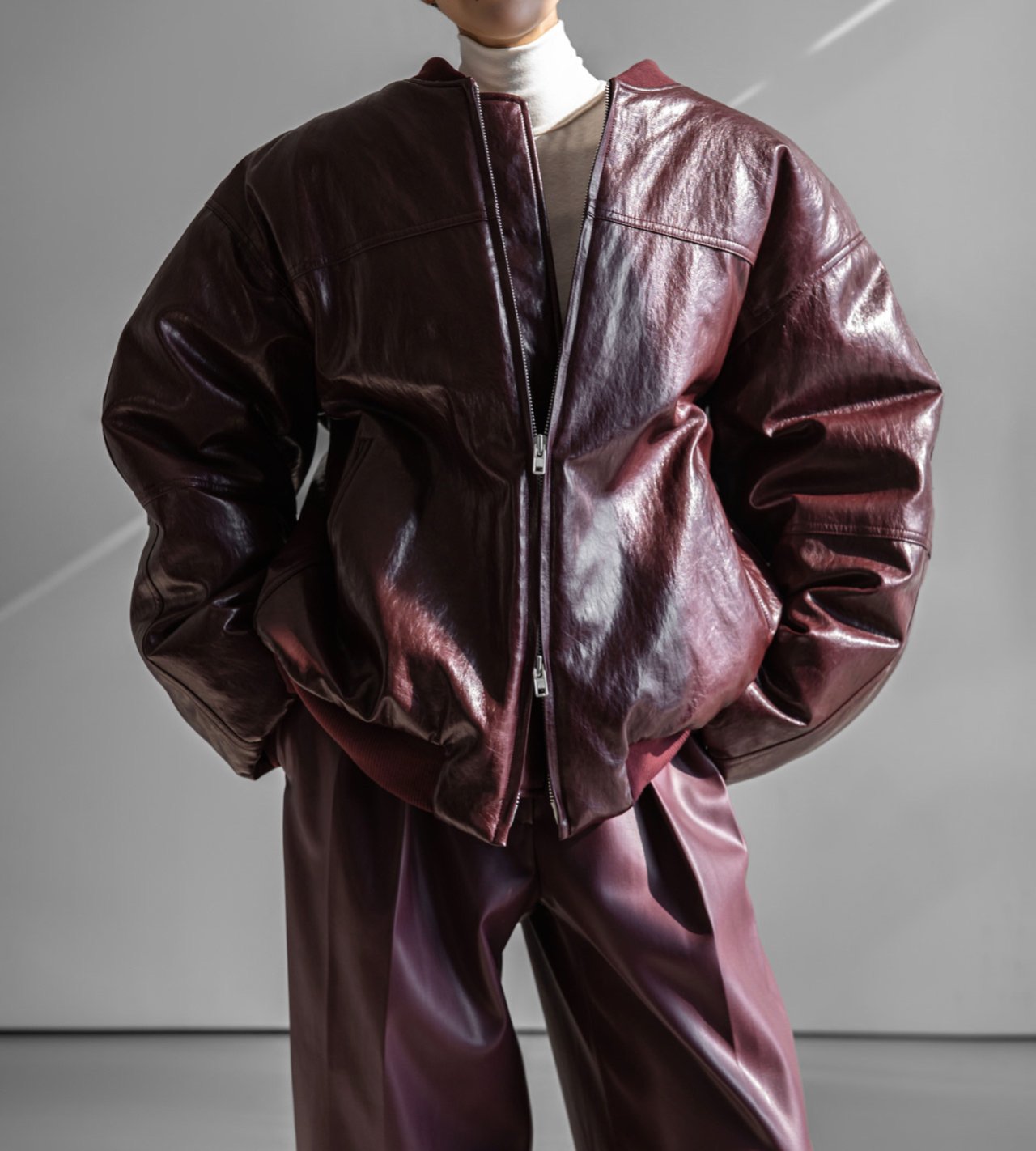 (PAPER MOON) OVERSIZED VEGAN LEATHER MA - 1 BOMBER JACKET : BURGUNDY