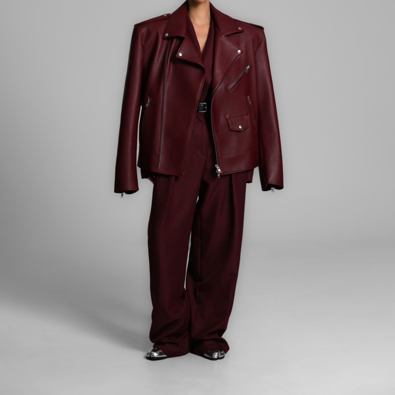 (PAPER MOON) OVERSIZED CHUNKY ZIPPED VEGAN LEATHER BIKER JACKET : BURGUNDY