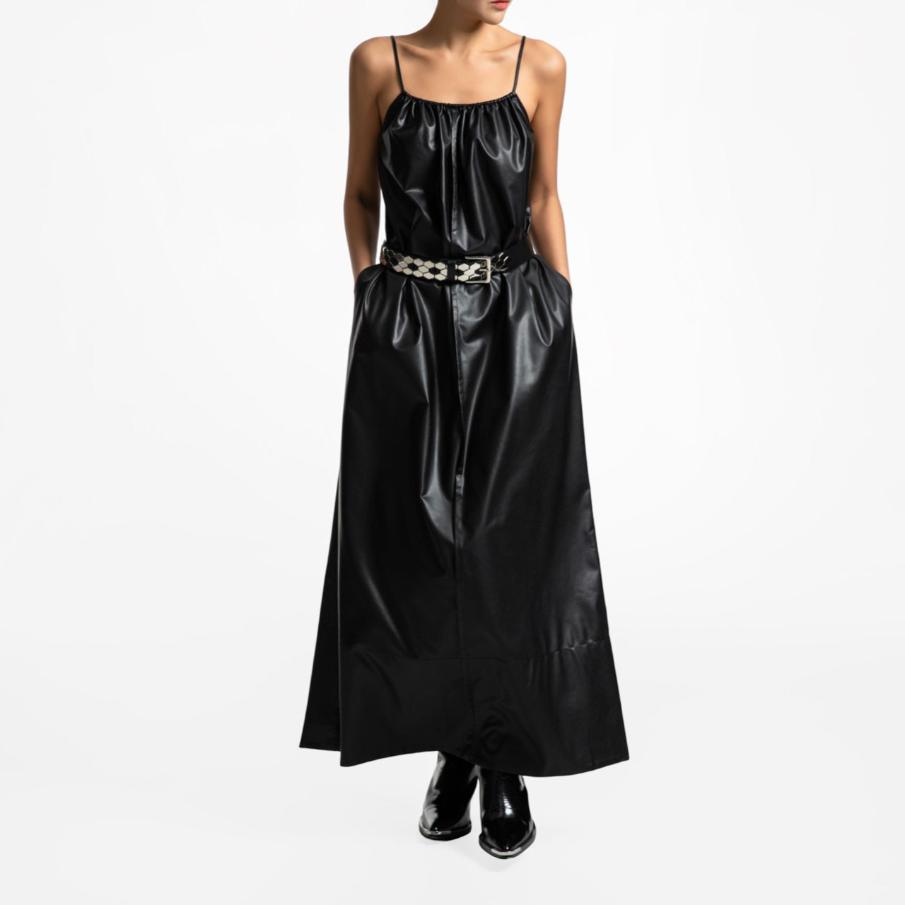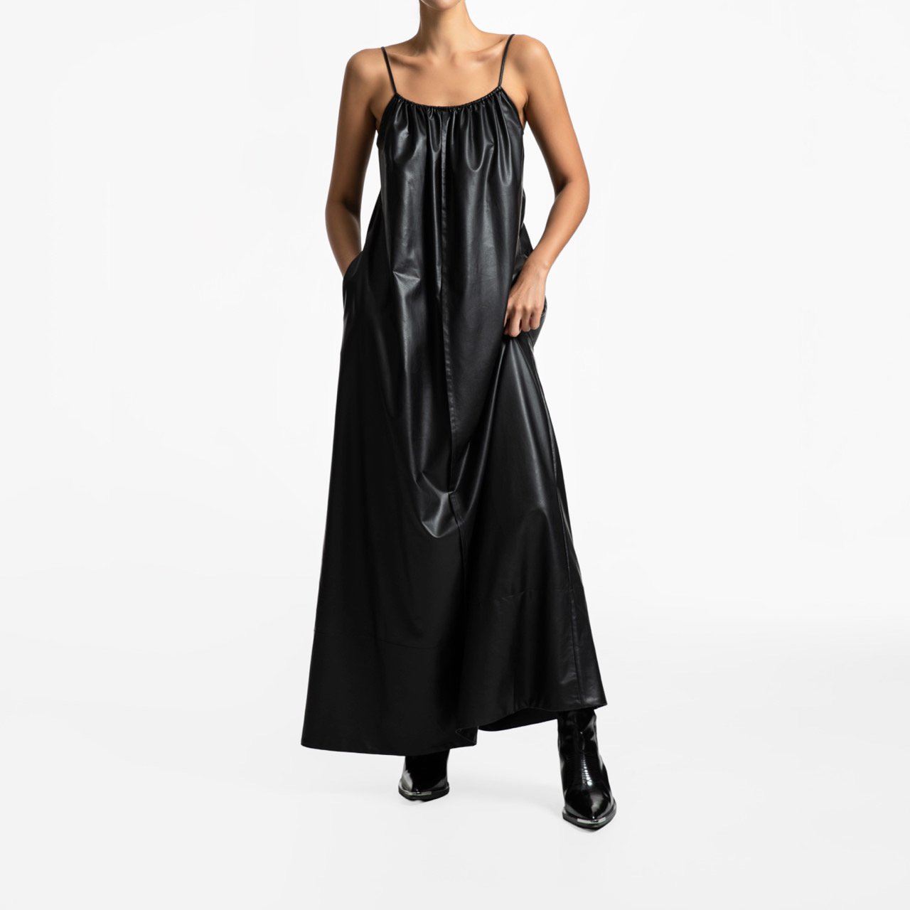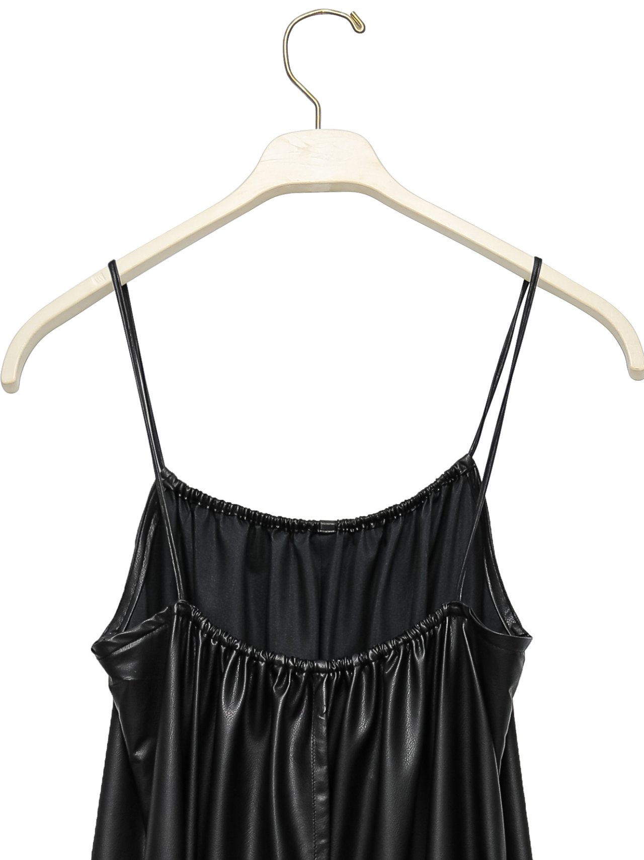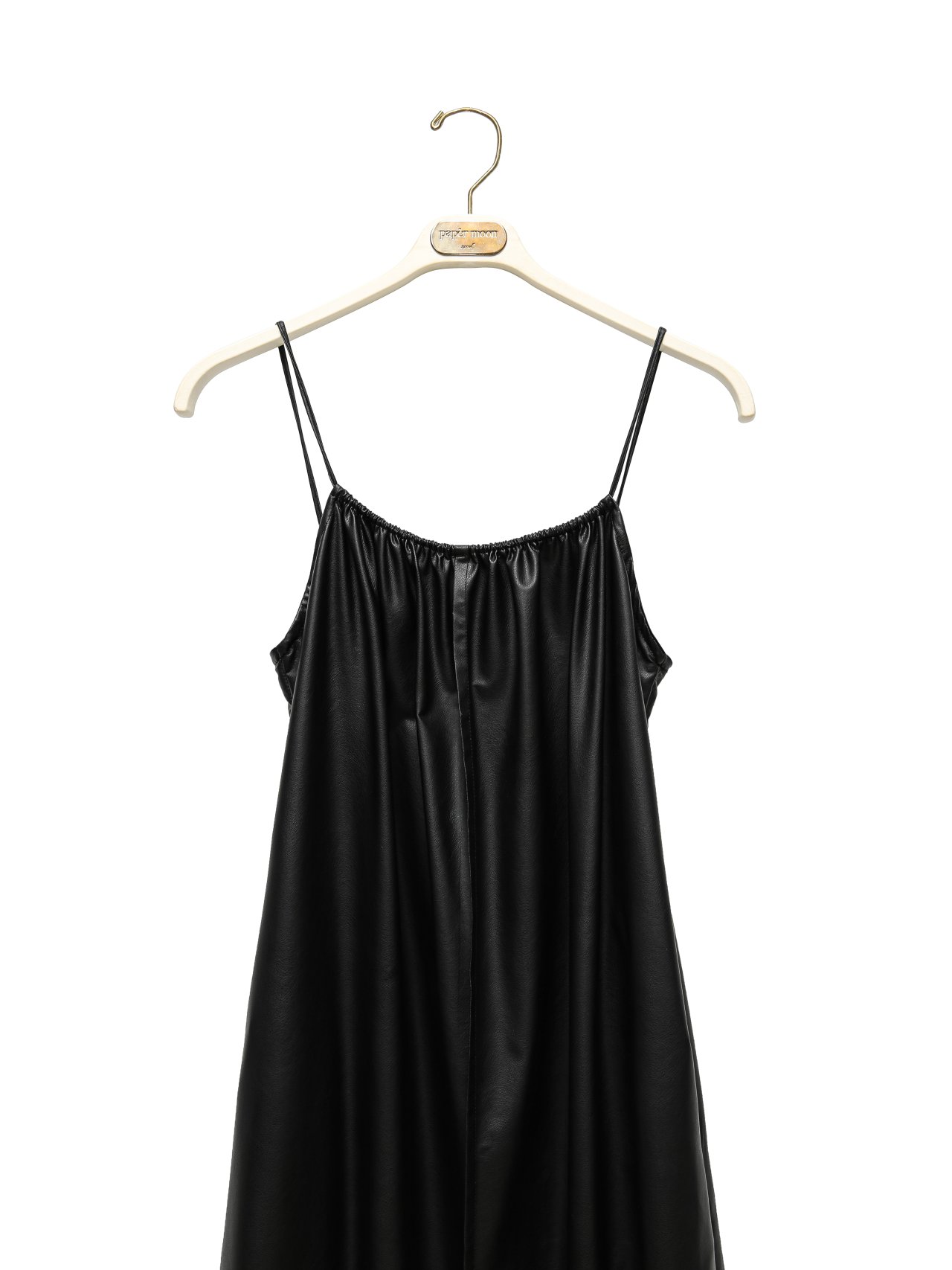 (PAPER MOON) VEGAN LEATHER STRAP SHIRRED MAXI DRESS : BLACK