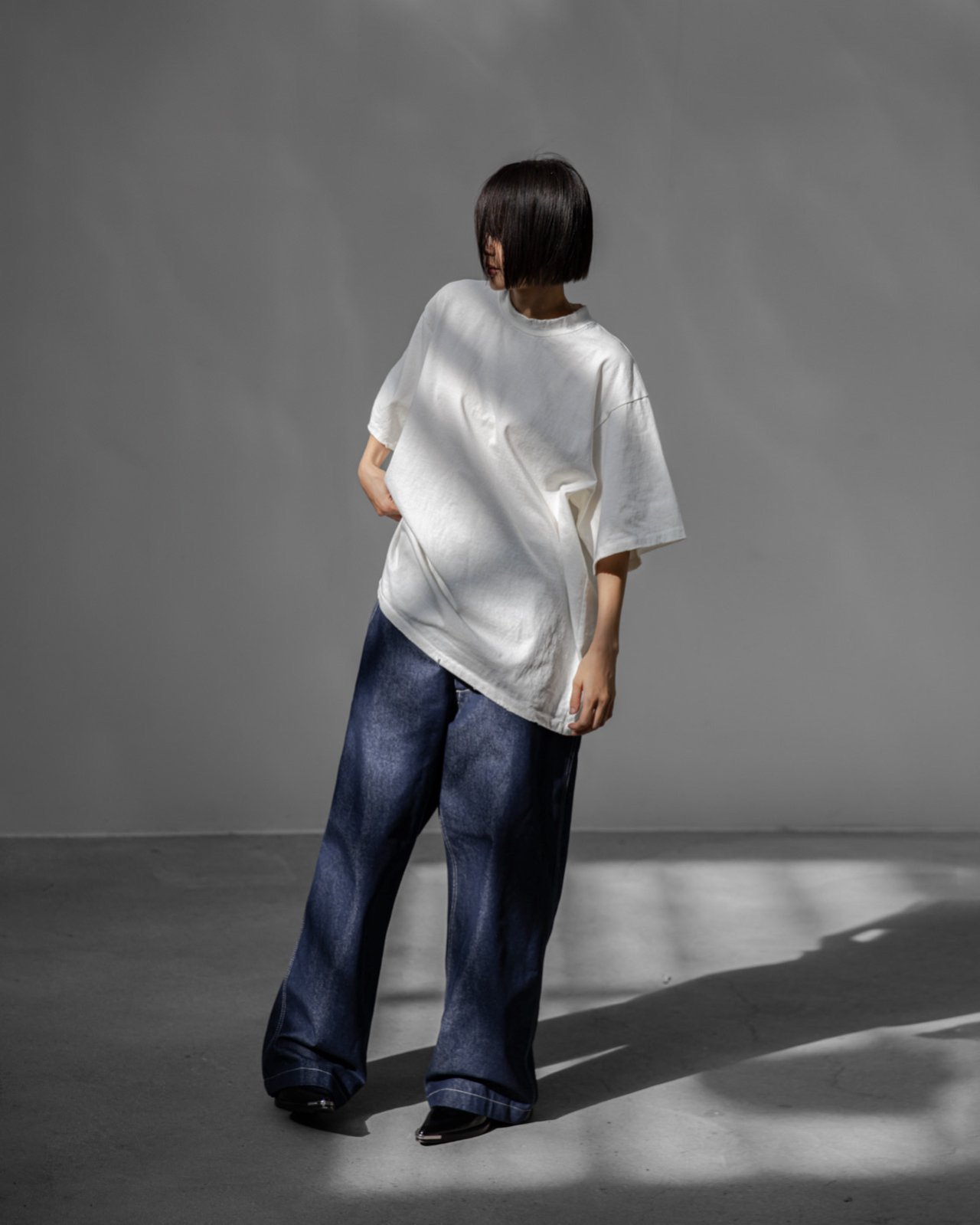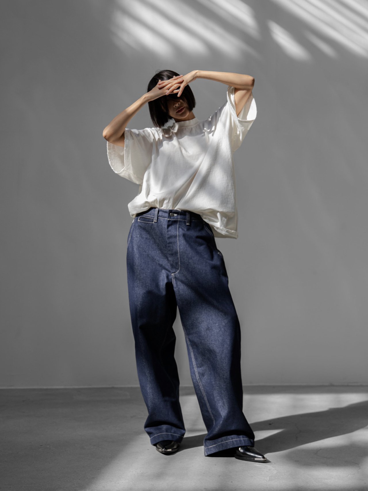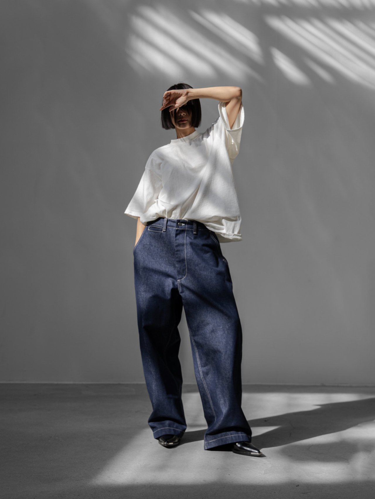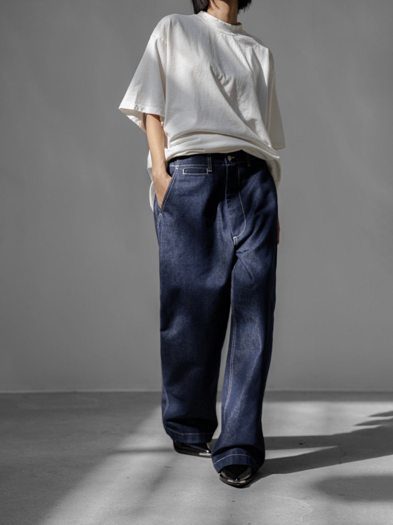 (PAPER MOON) STITCHED DETAIL WIDE BAGGY DENIM PANTS : DEEP BLUE