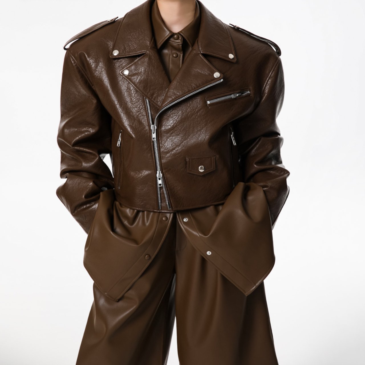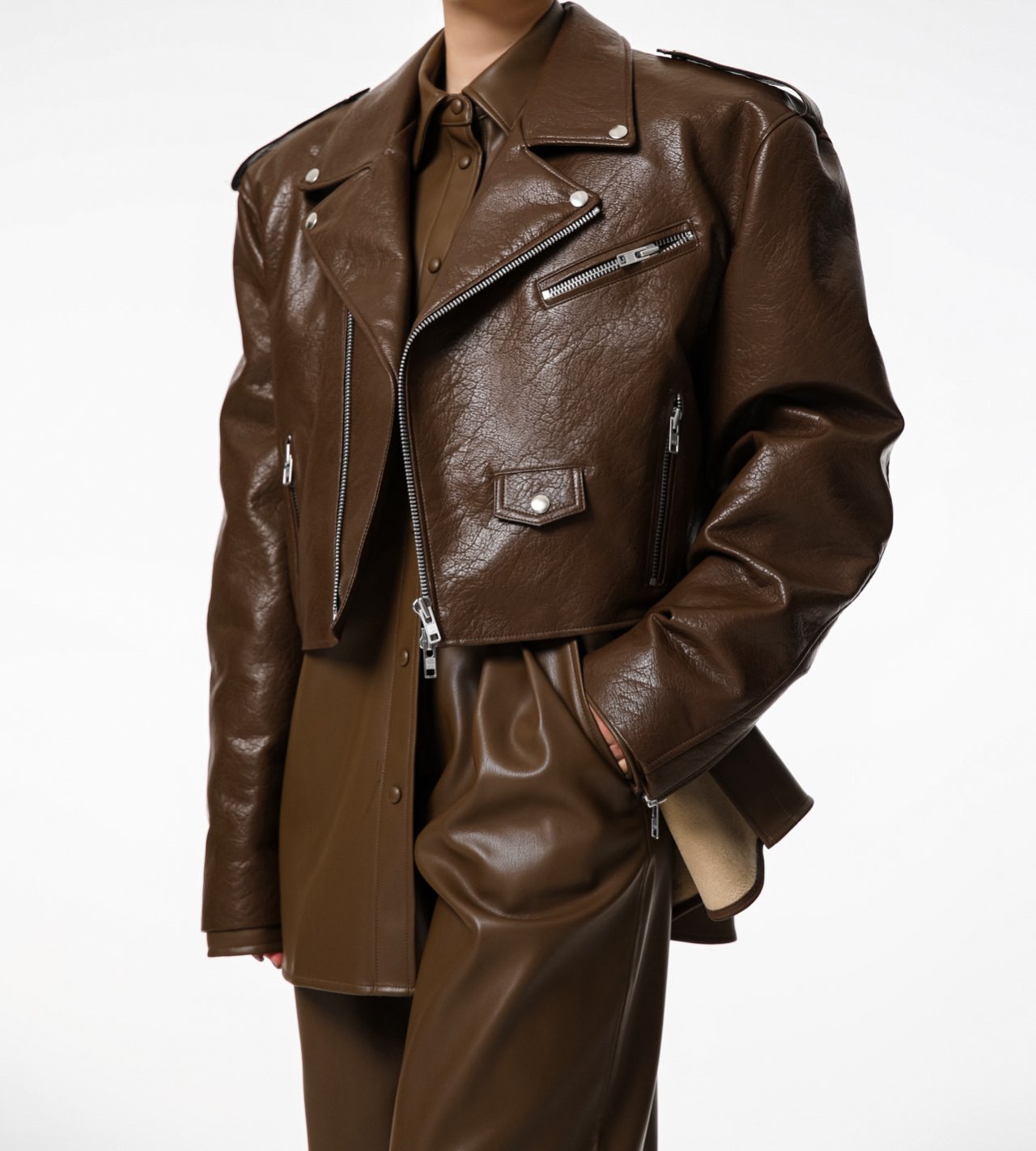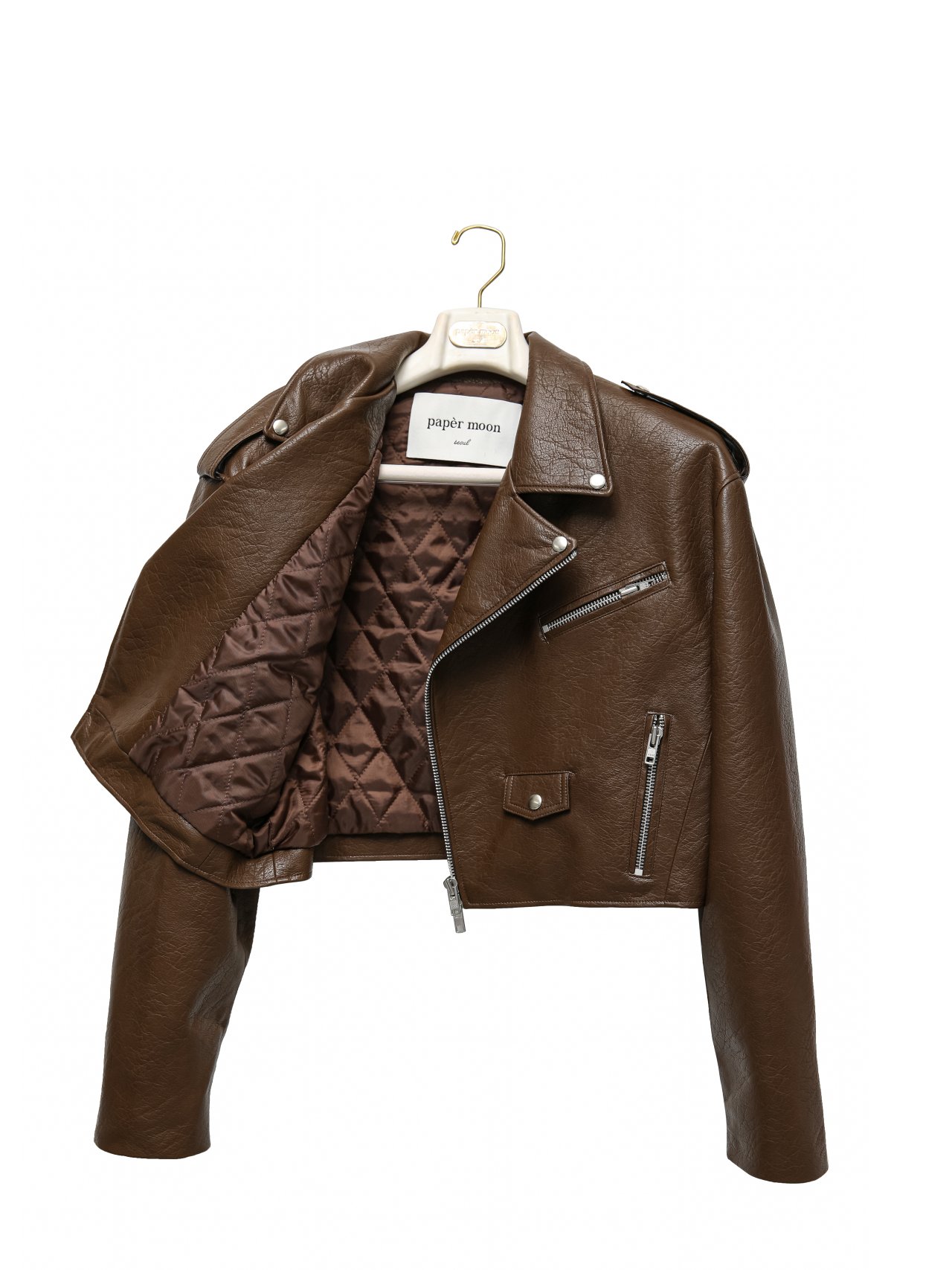 (PAPER MOON) OVERSIZED VEGAN LEATHER CROPPED CHUNKY BIKER JACKET : CAMEL BROWN