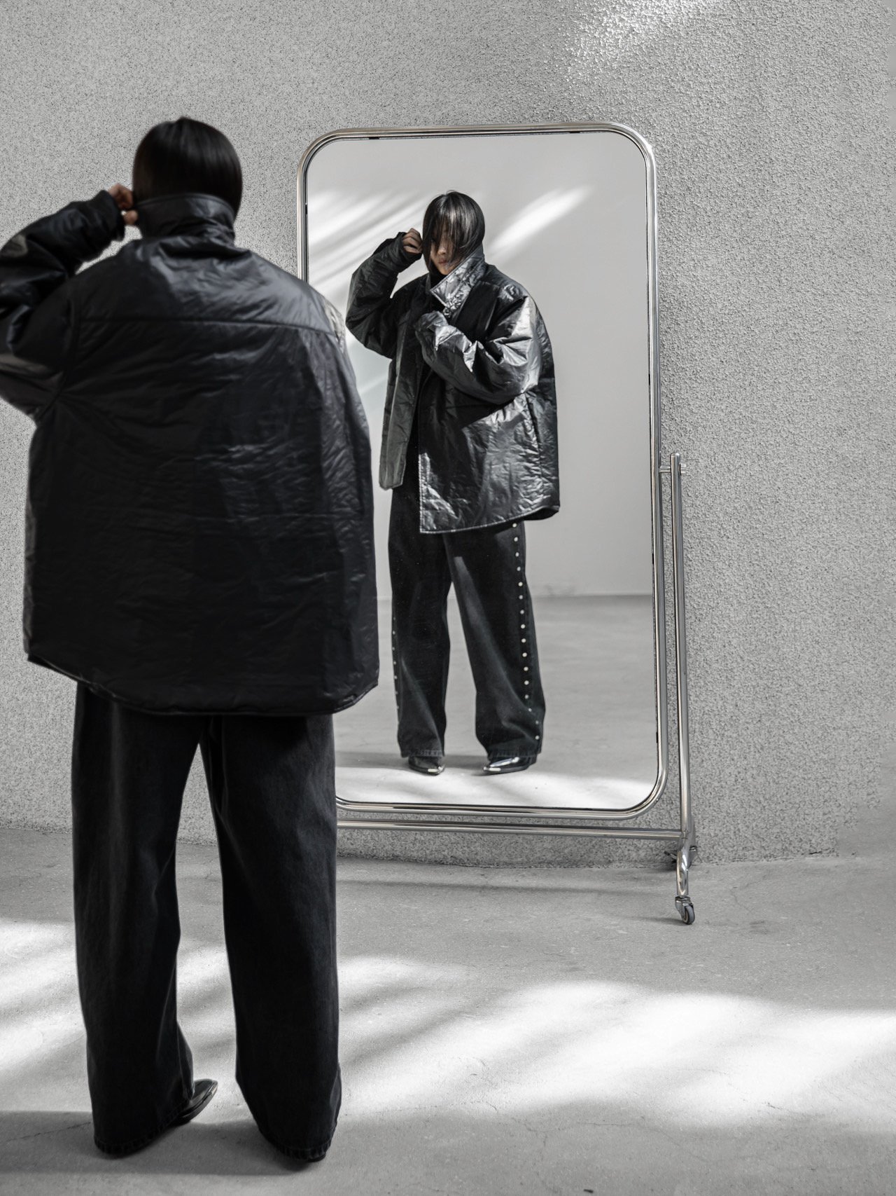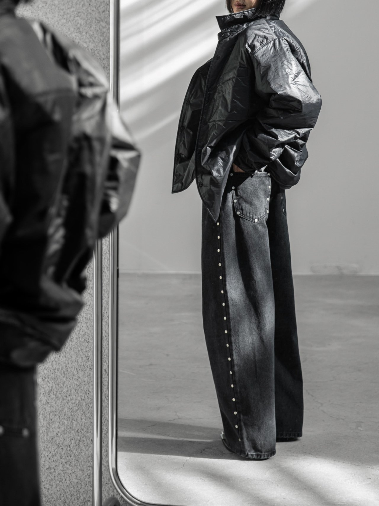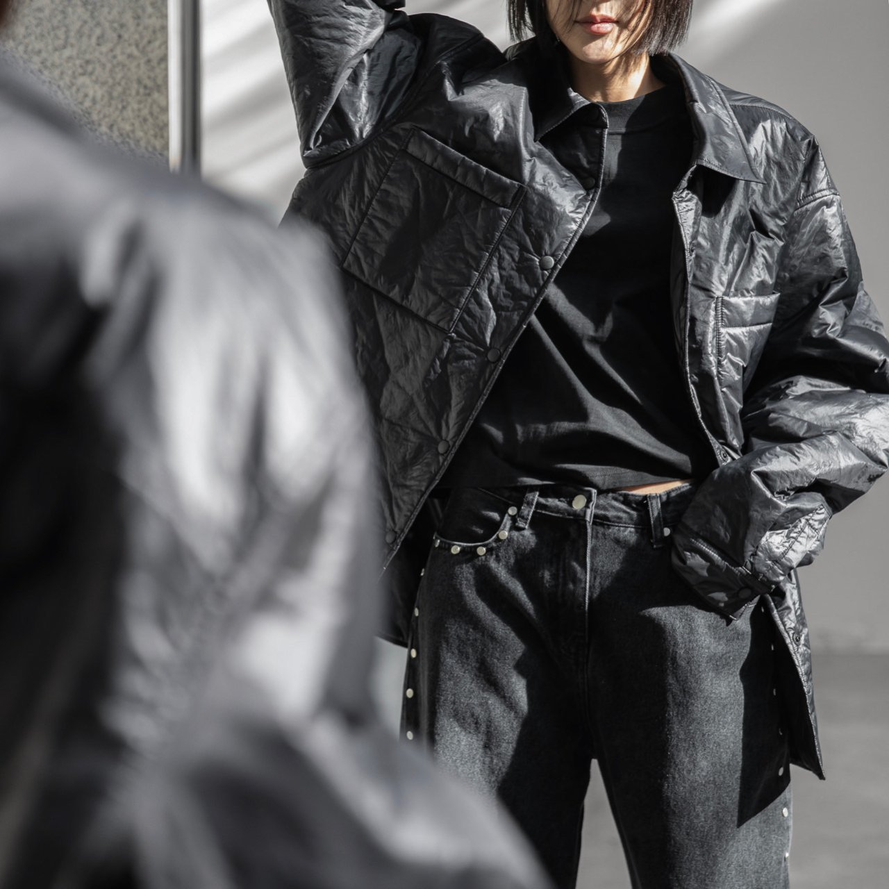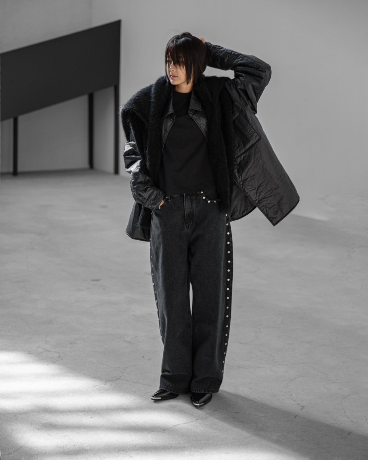 (PAPER MOON) OVERSIZED VIVID LIGHT PADDED BUTTON DOWN SHIRT : BLACK