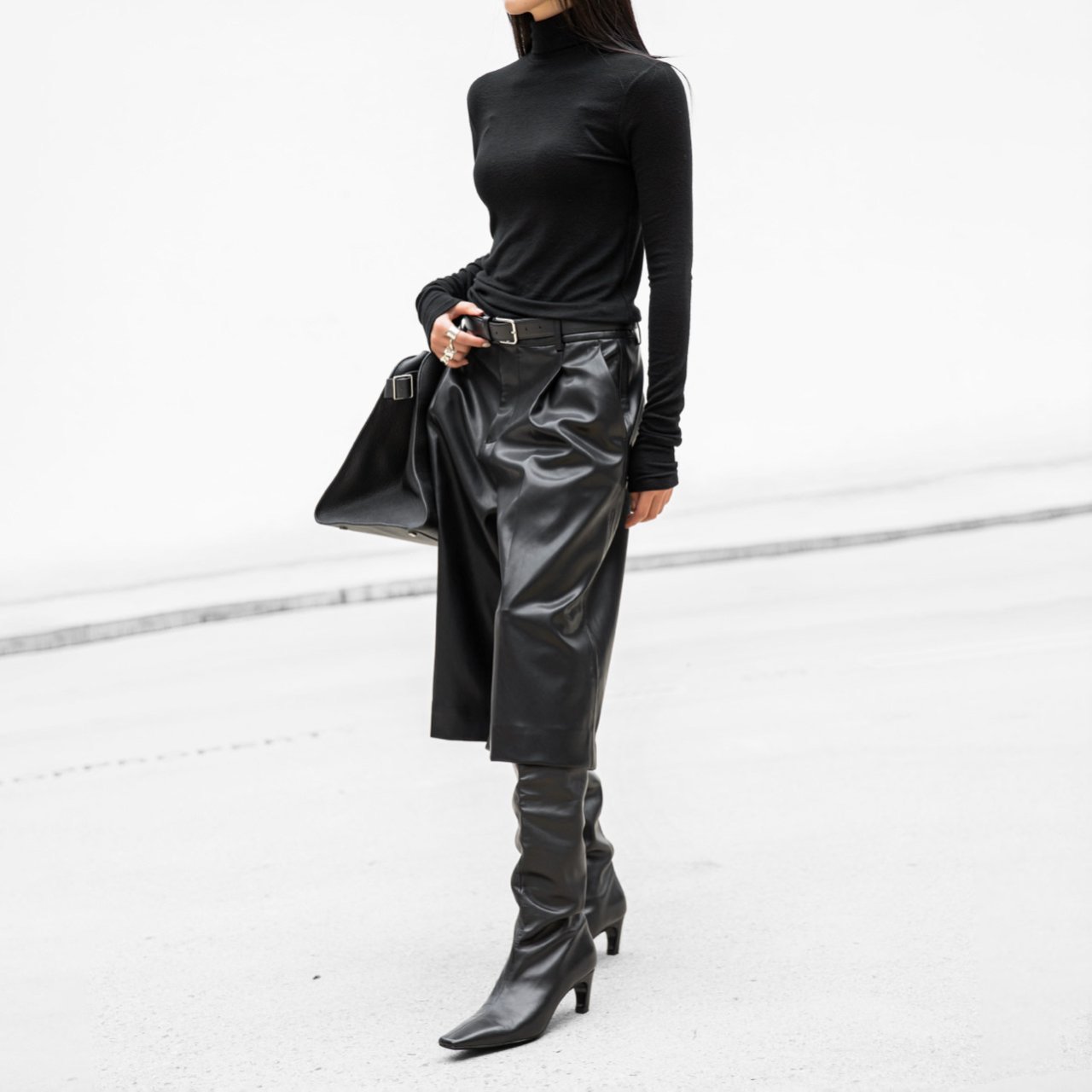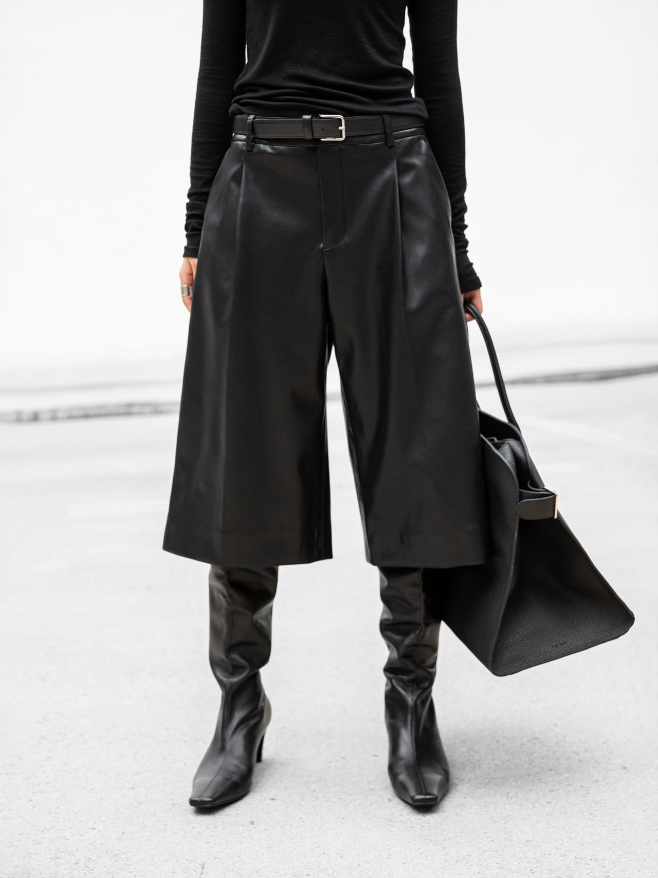(PAPER MOON) CLASSIC WIDE FIT SHINY LEATHER BERMUDA TROUSERS : BLACK