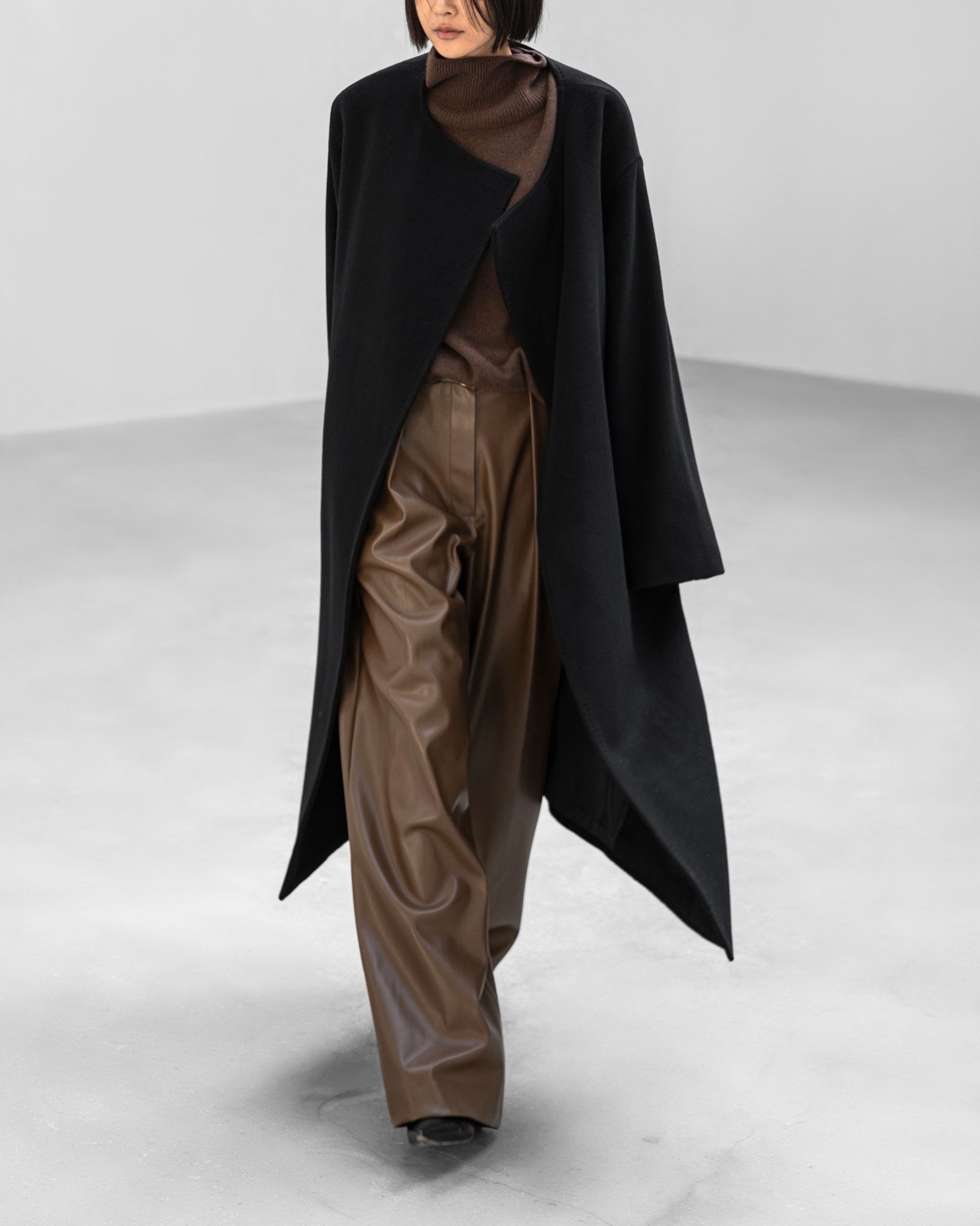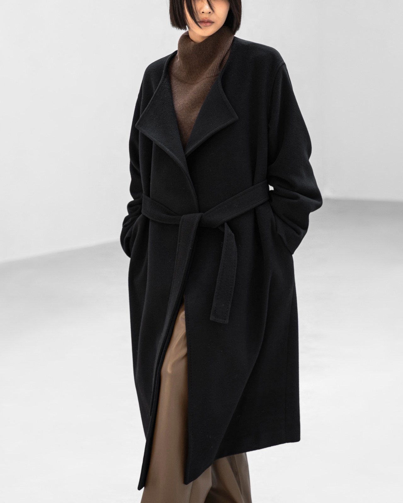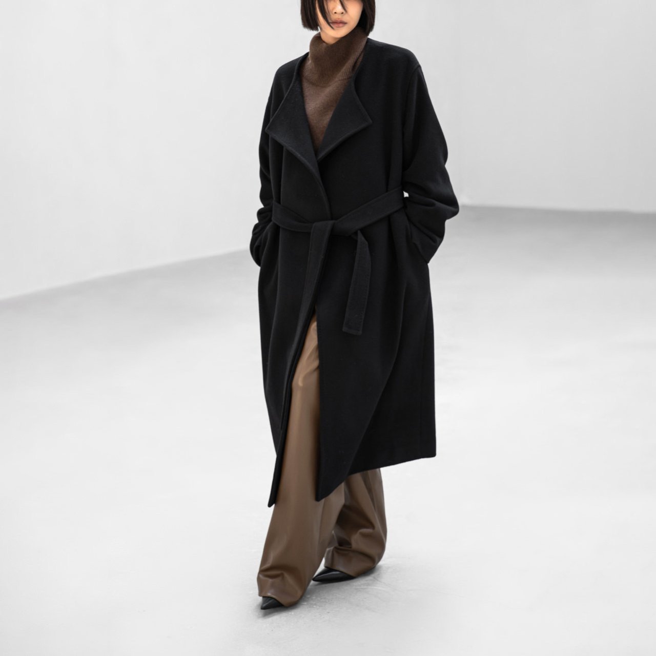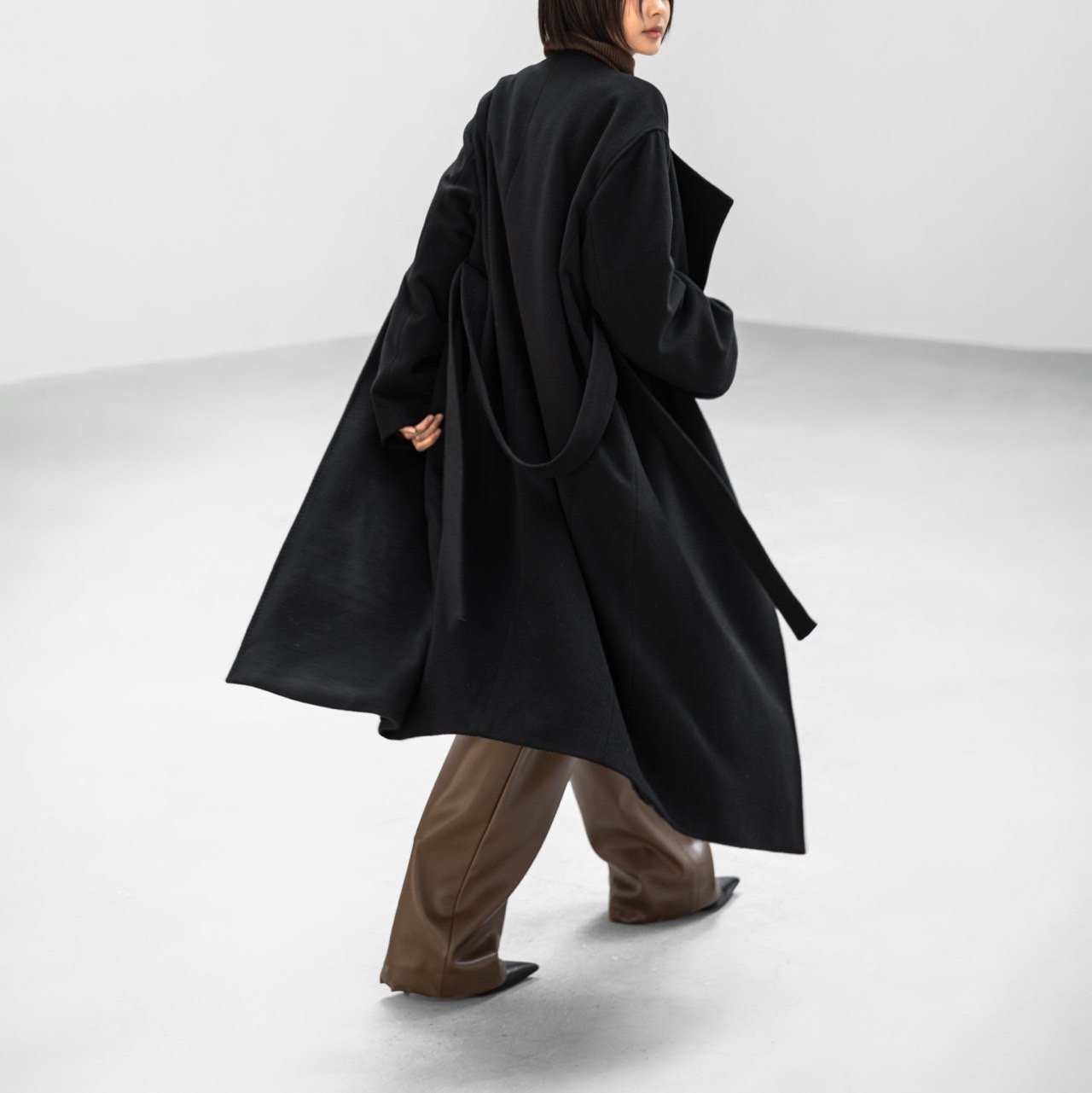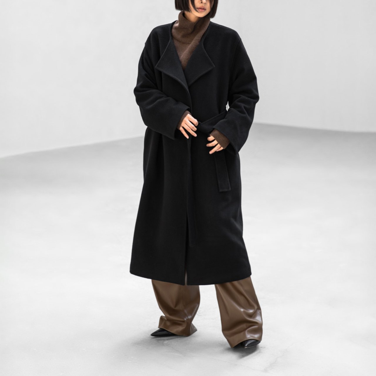(PAPER MOON) LUX CASHMERE WOOL STITCHED POINT ROBE BELTED COAT : BLACK
