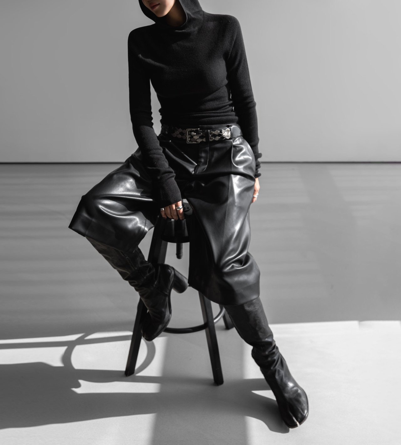 (PAPER MOON) CLASSIC WIDE FIT SHINY LEATHER BERMUDA TROUSERS : BLACK