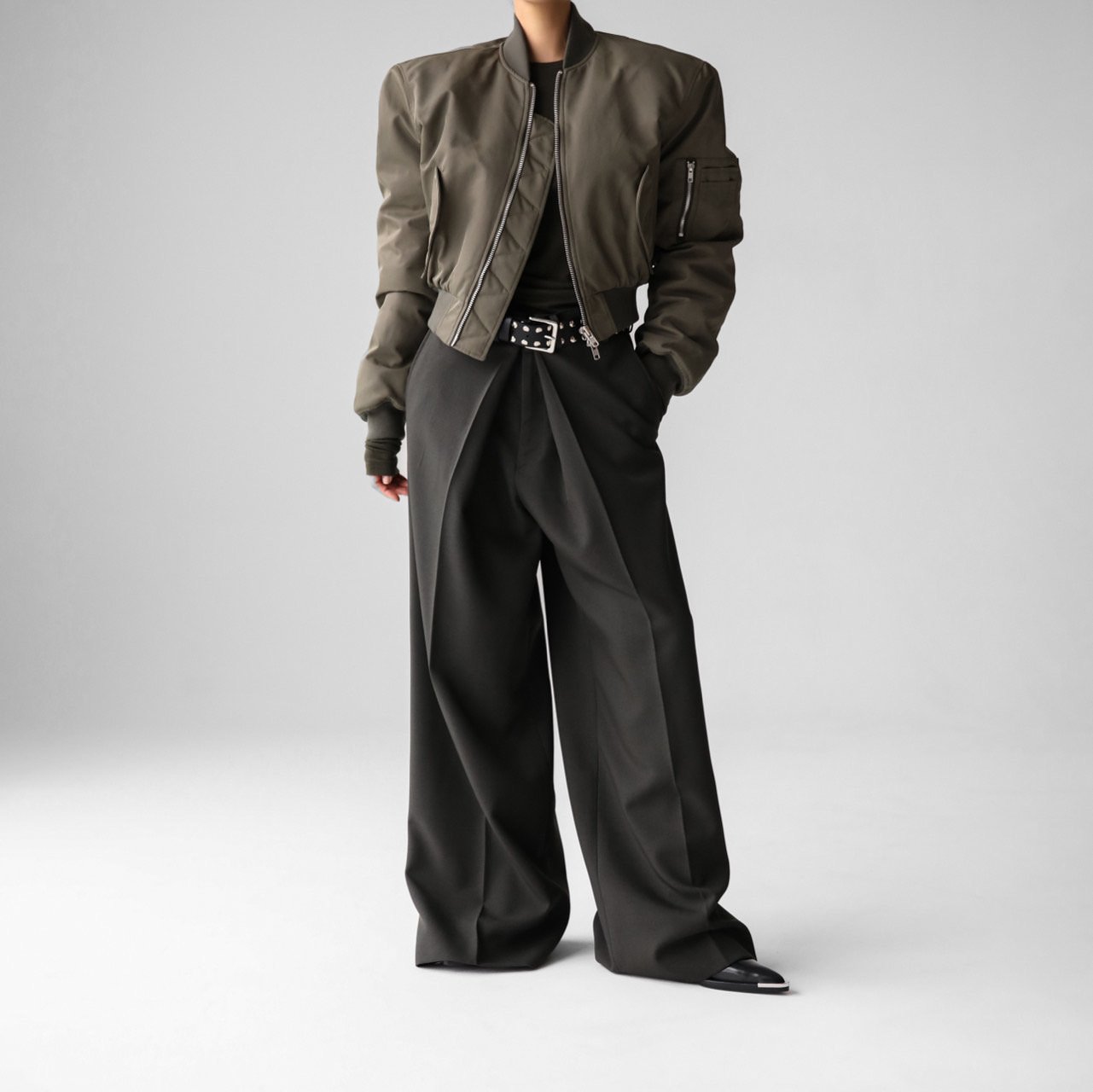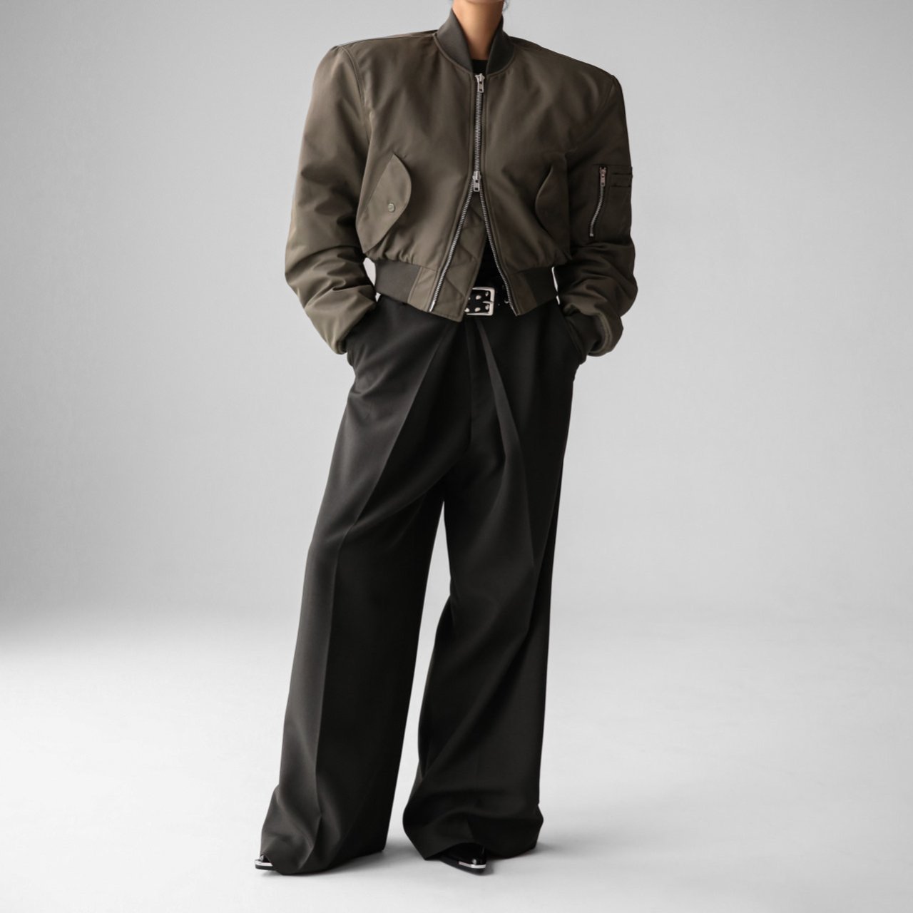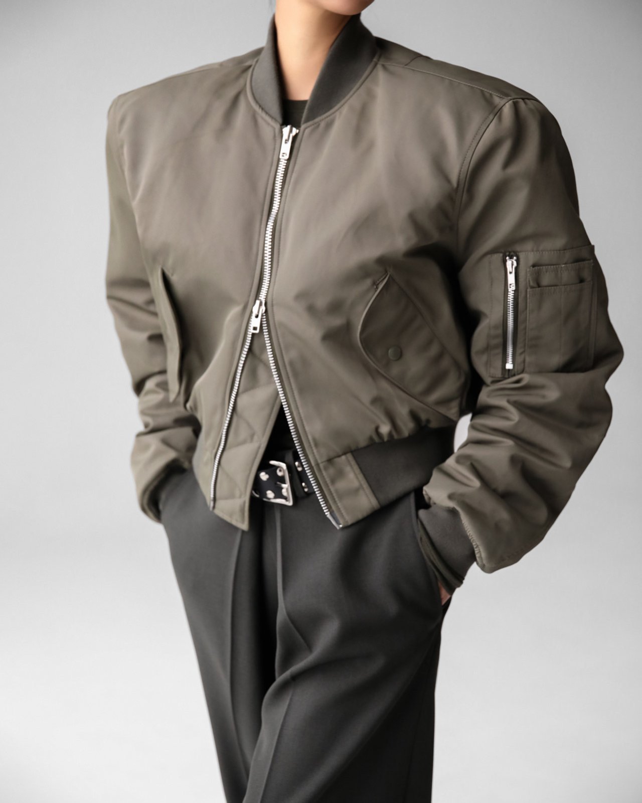 (PAPER MOON) SQUARE SHOULDER PADDED CROPPED BOMBER JACKET : KHAKI