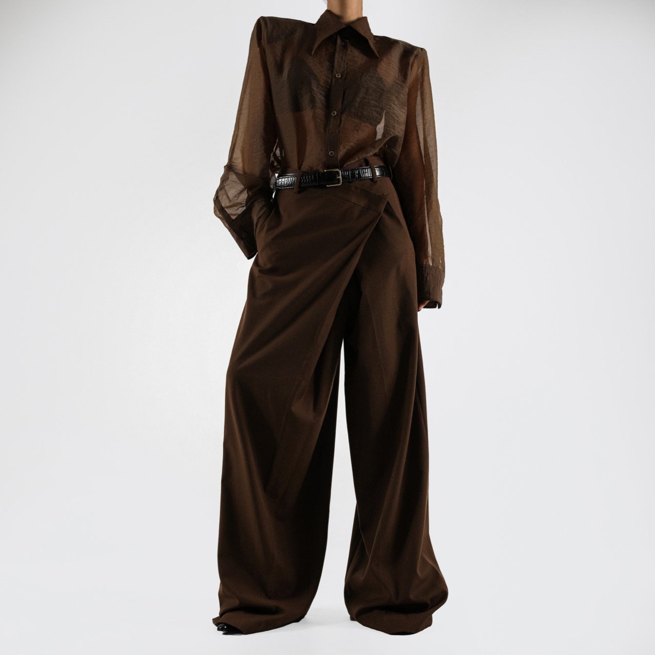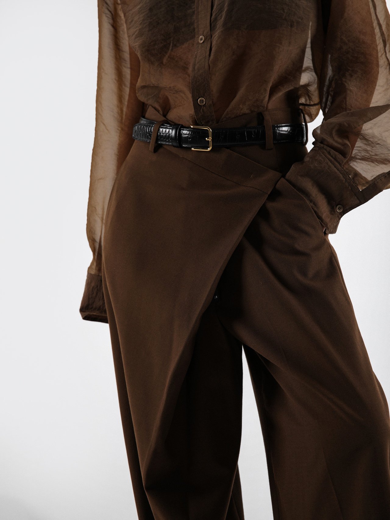 (PAPER MOON) ASYMMETRY PIN TUCK WIDE MAXI TROUSERS : BROWN