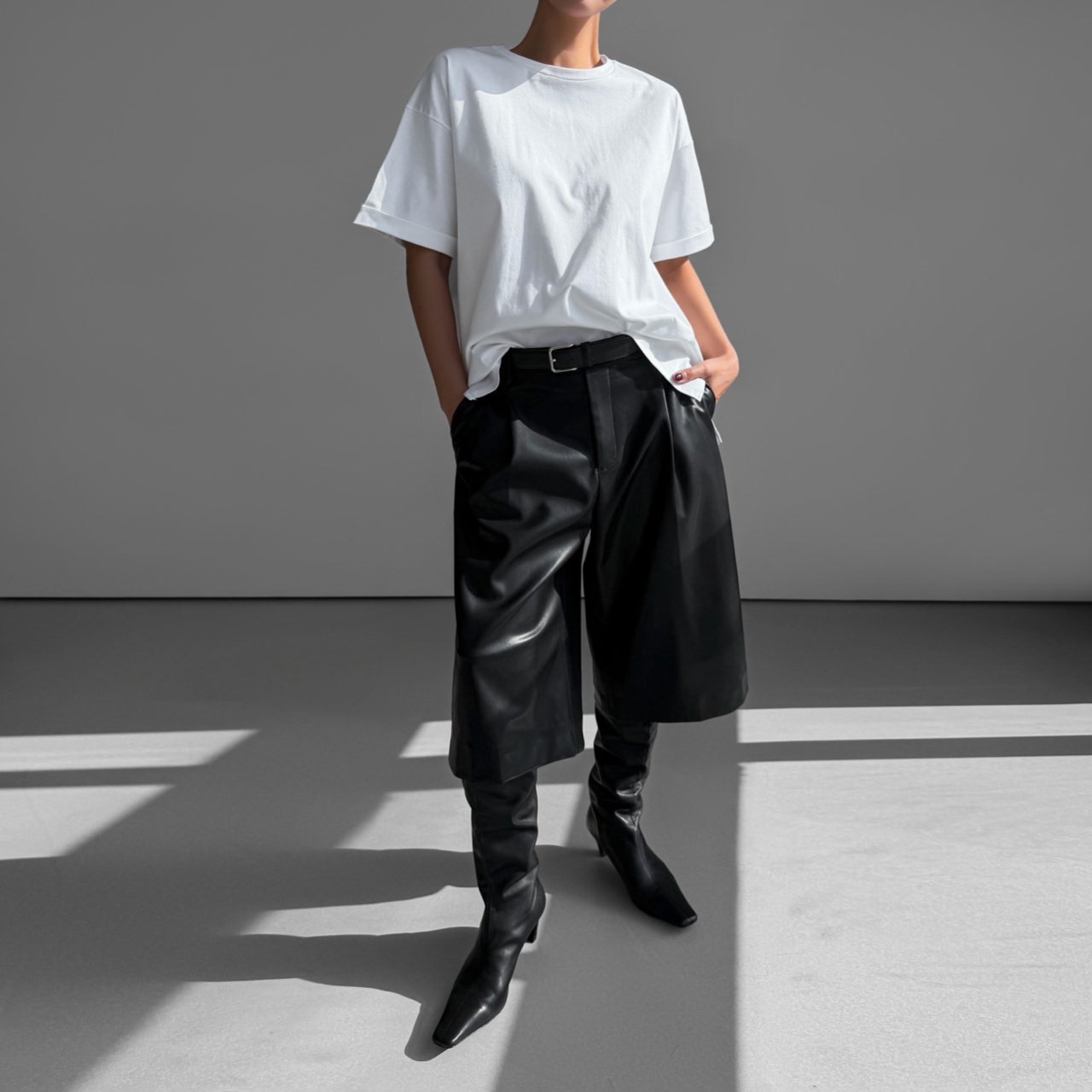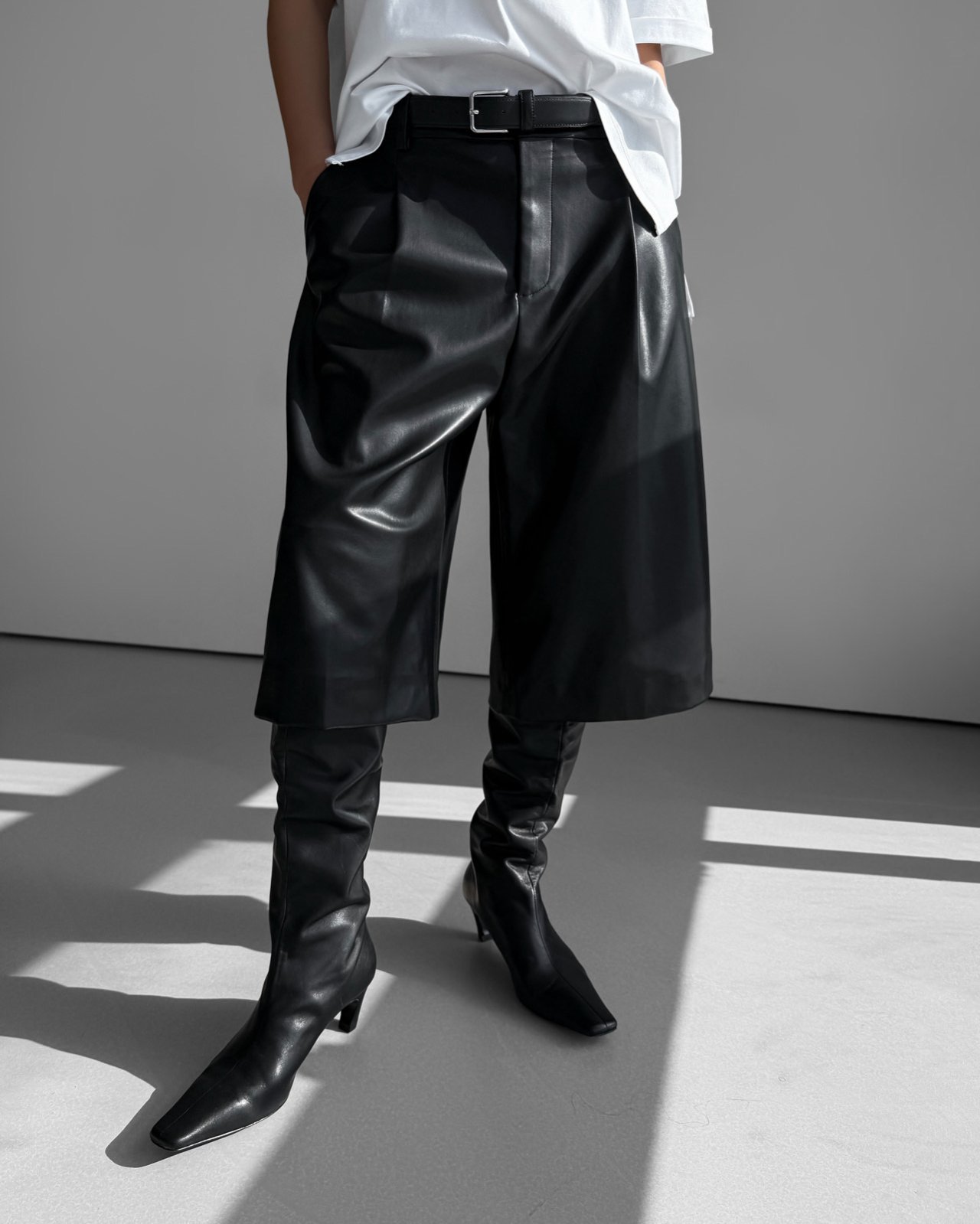 (PAPER MOON) CLASSIC WIDE FIT SHINY LEATHER BERMUDA TROUSERS : BLACK