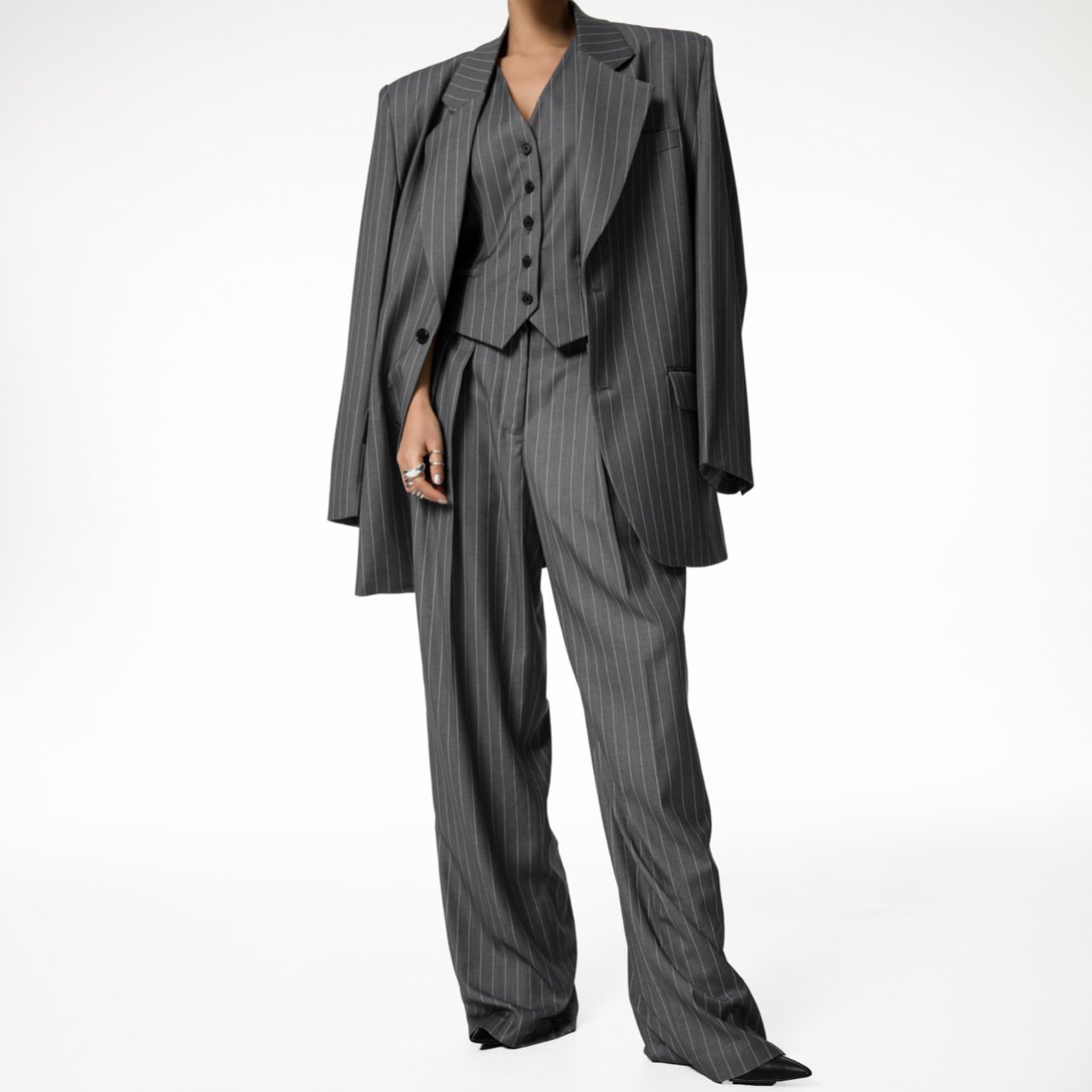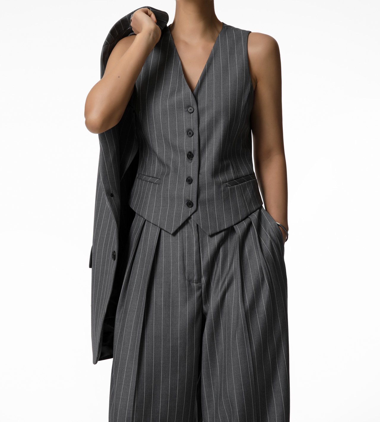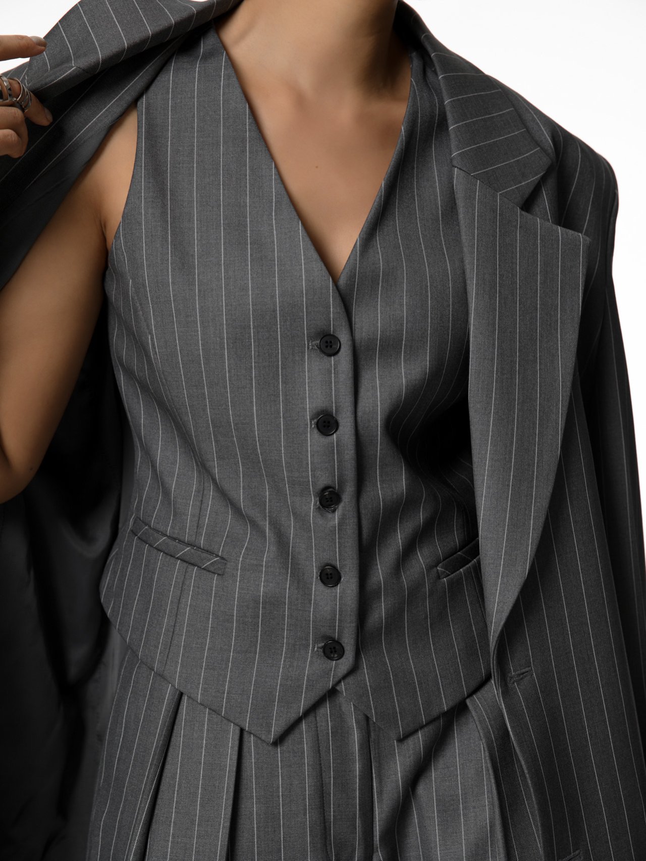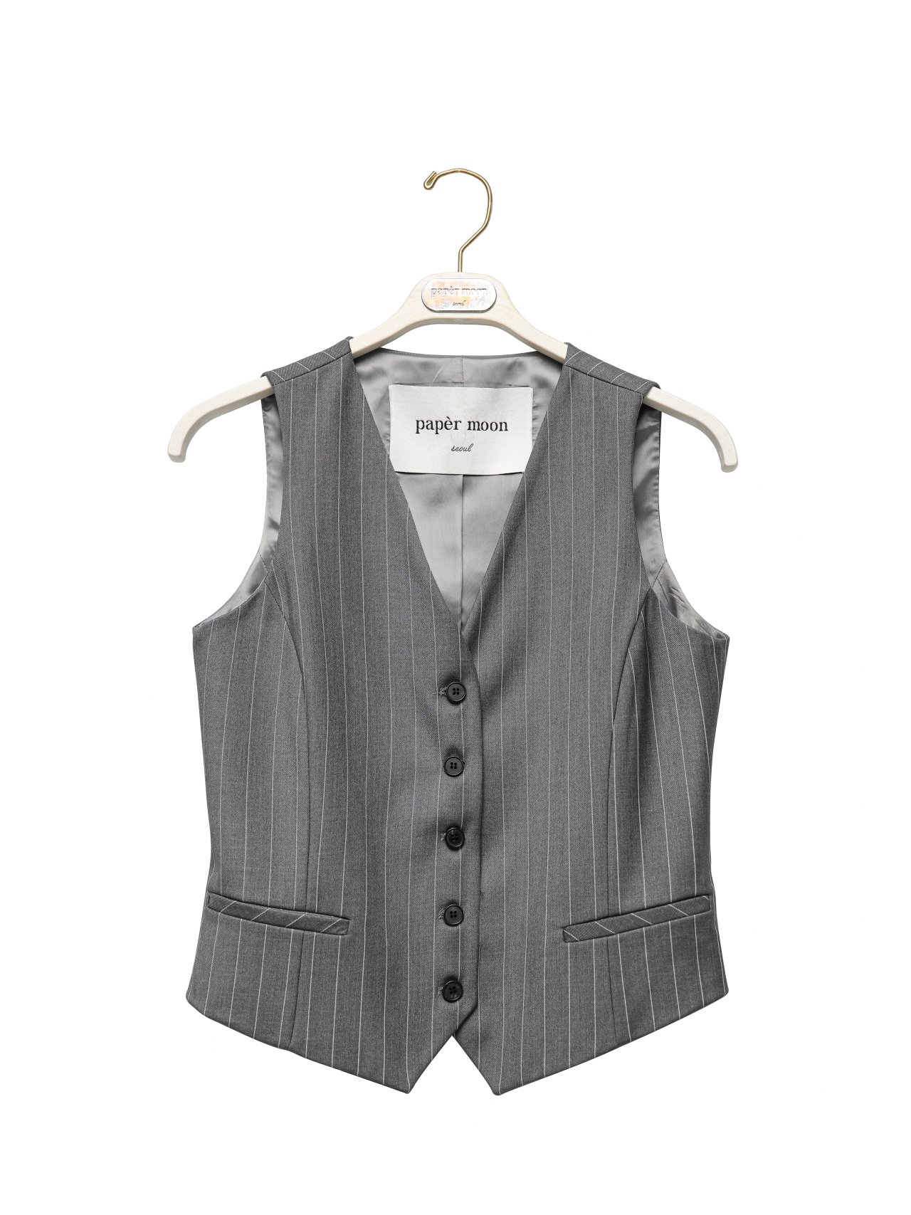 (PAPER MOON) WIDE PIN STRIPE SET UP SUIT VEST : GREY PIN STRIPE