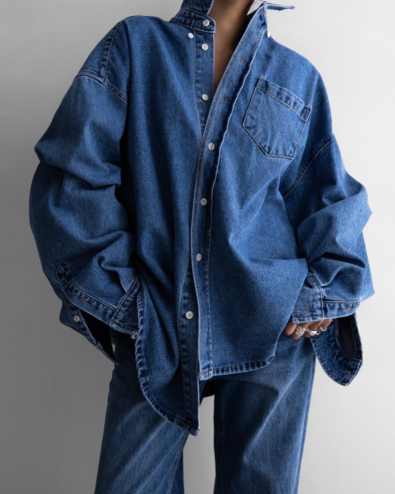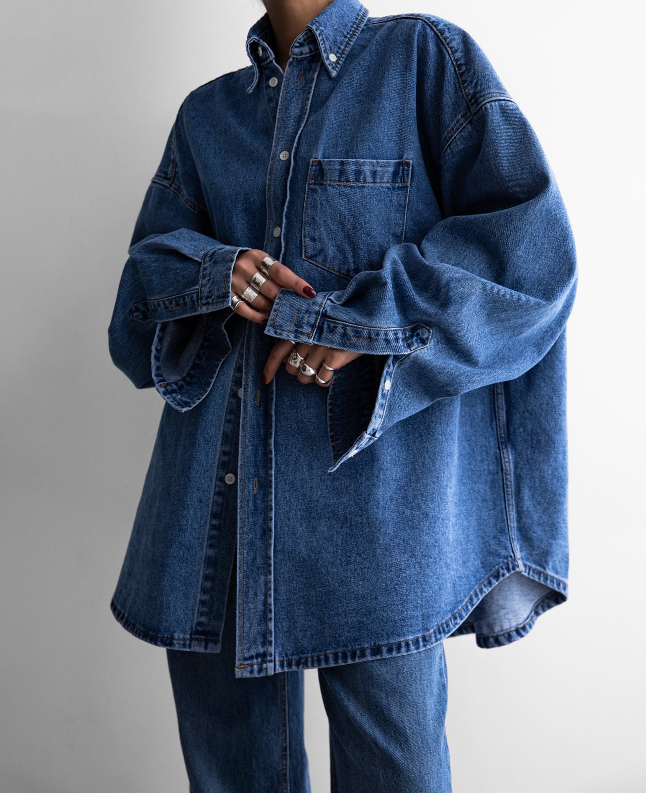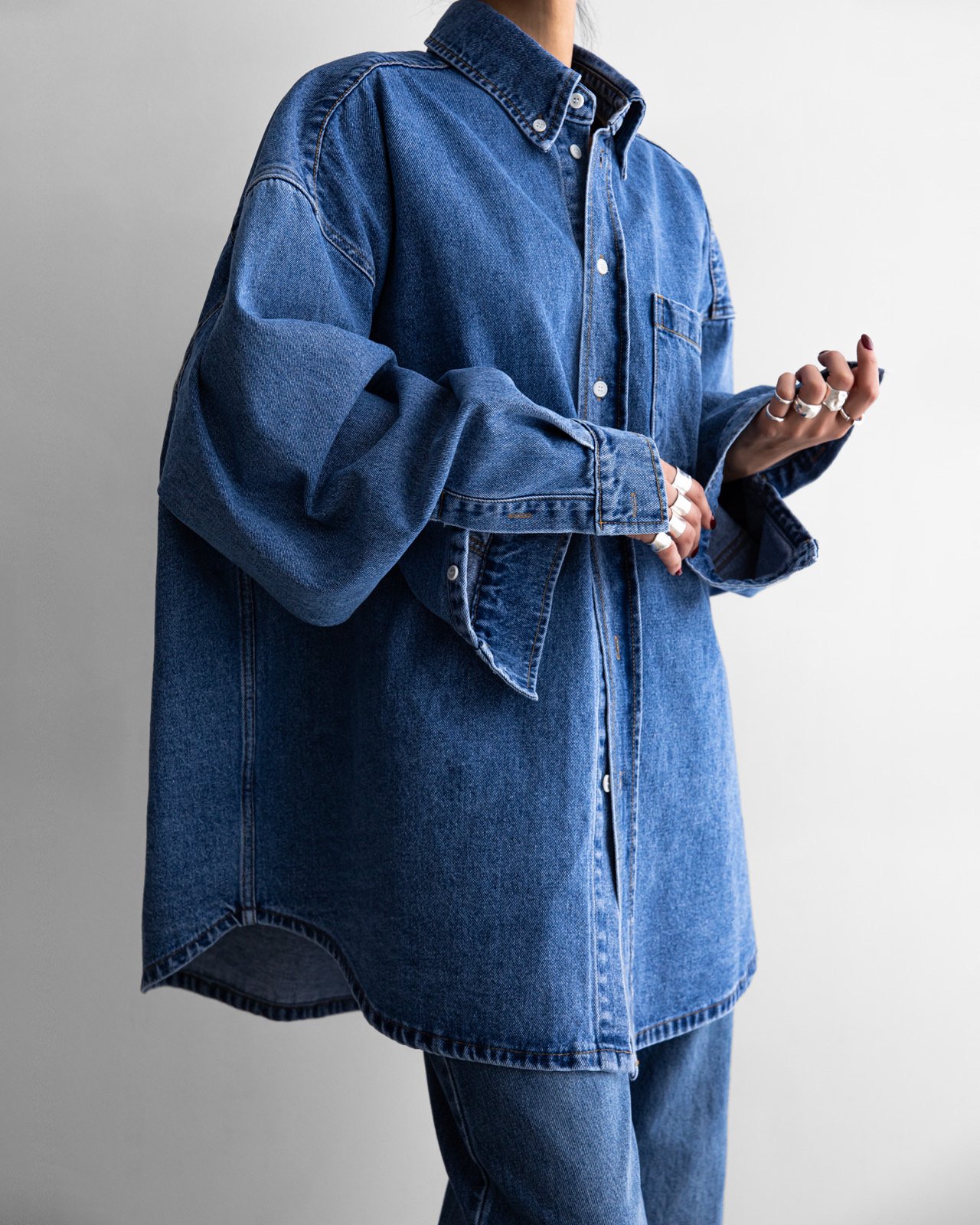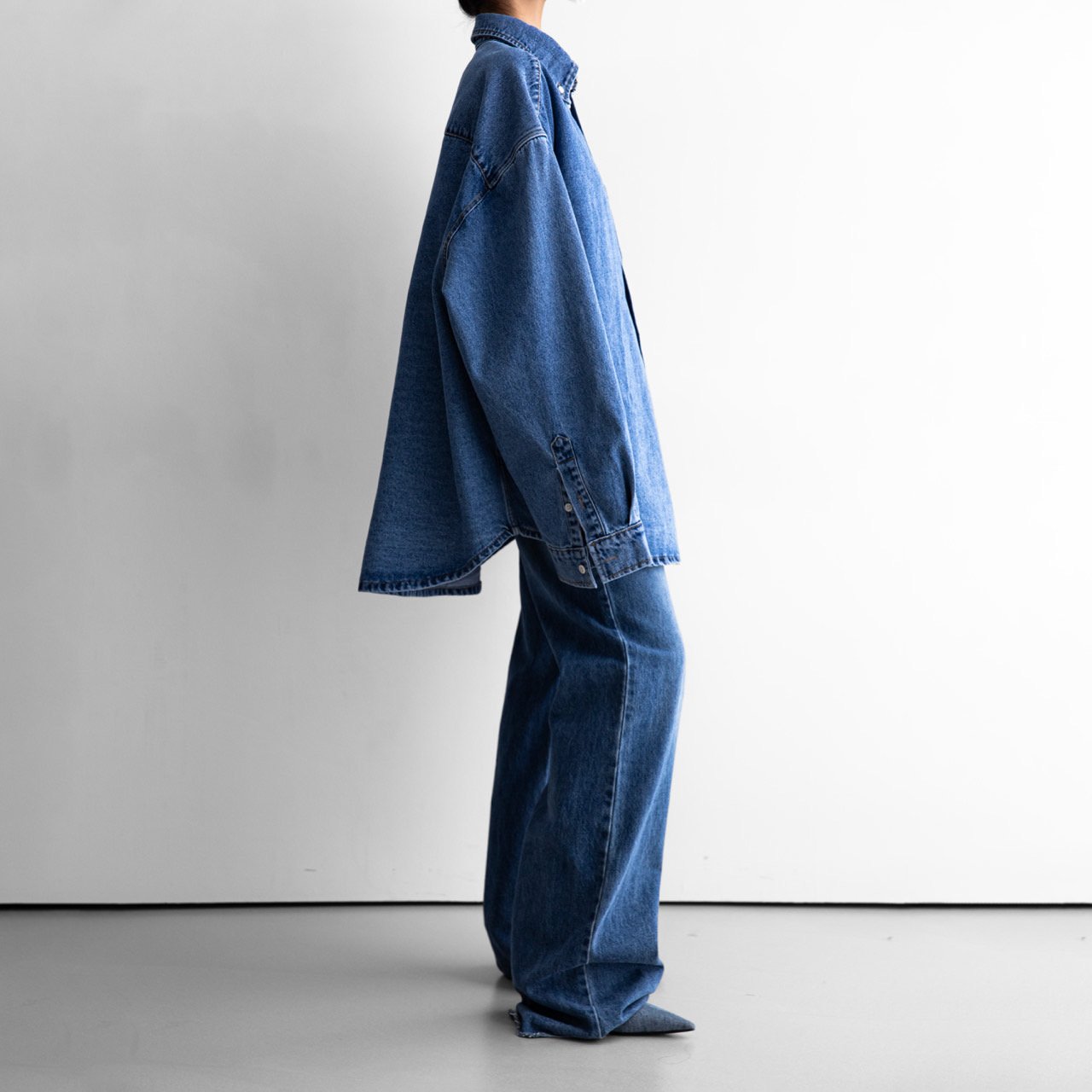 (PAPER MOON) MAXI OVERSIZED WASHED DENIM BUTTON DOWN SHIRT : WASHED MID BLUE