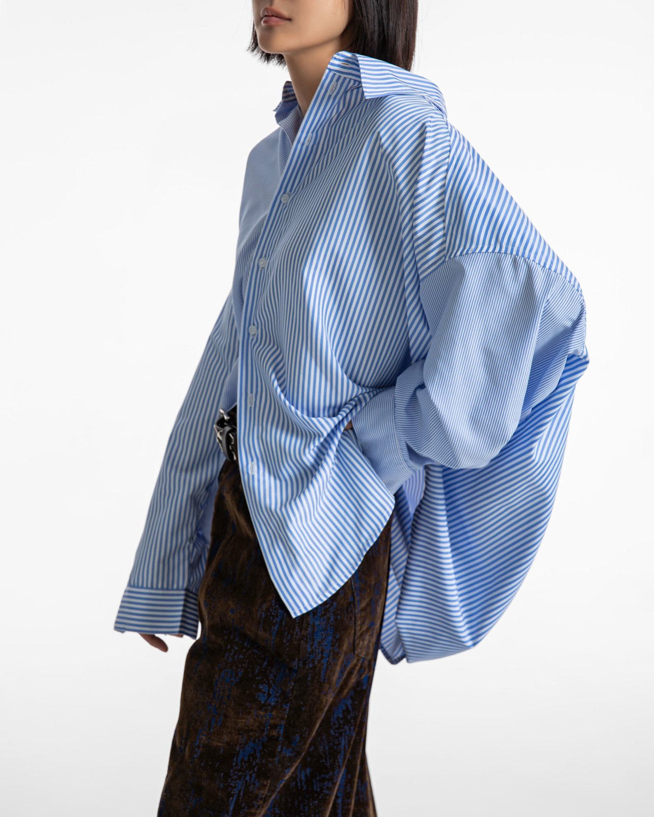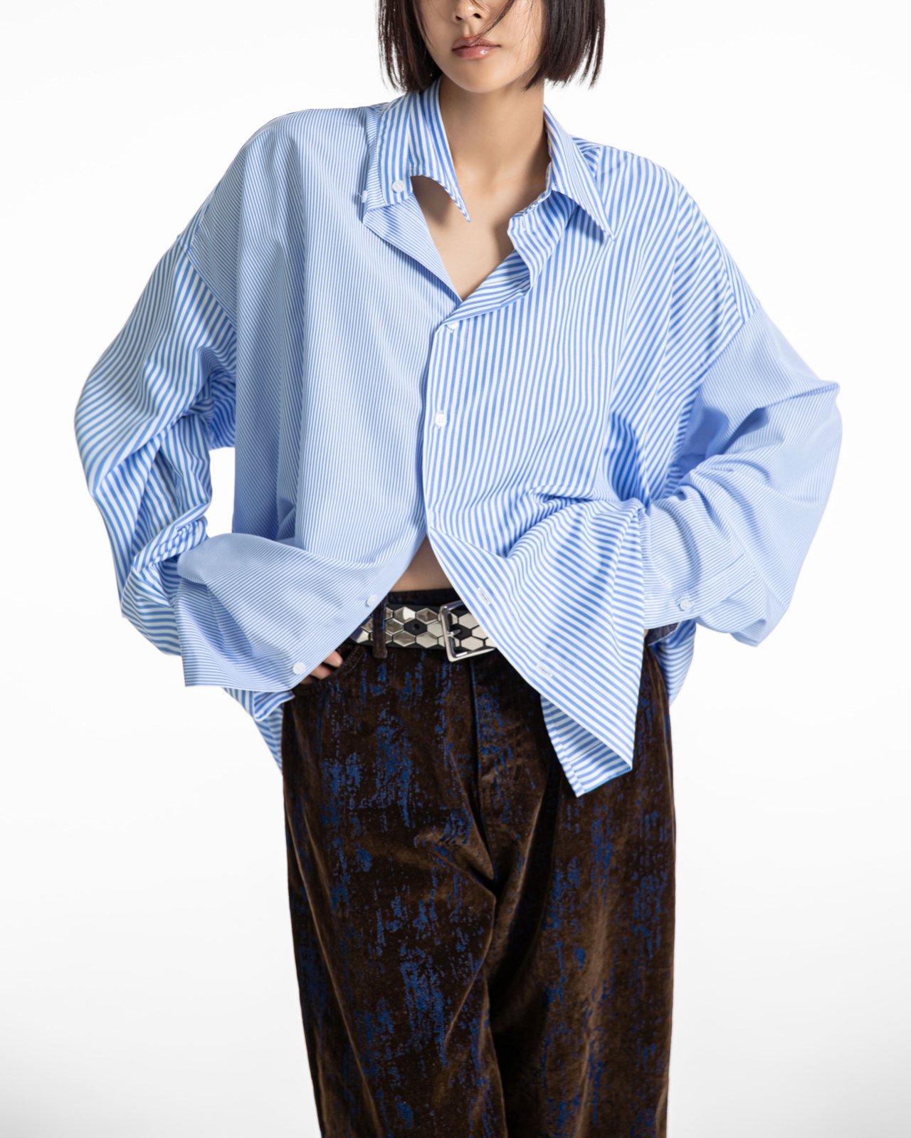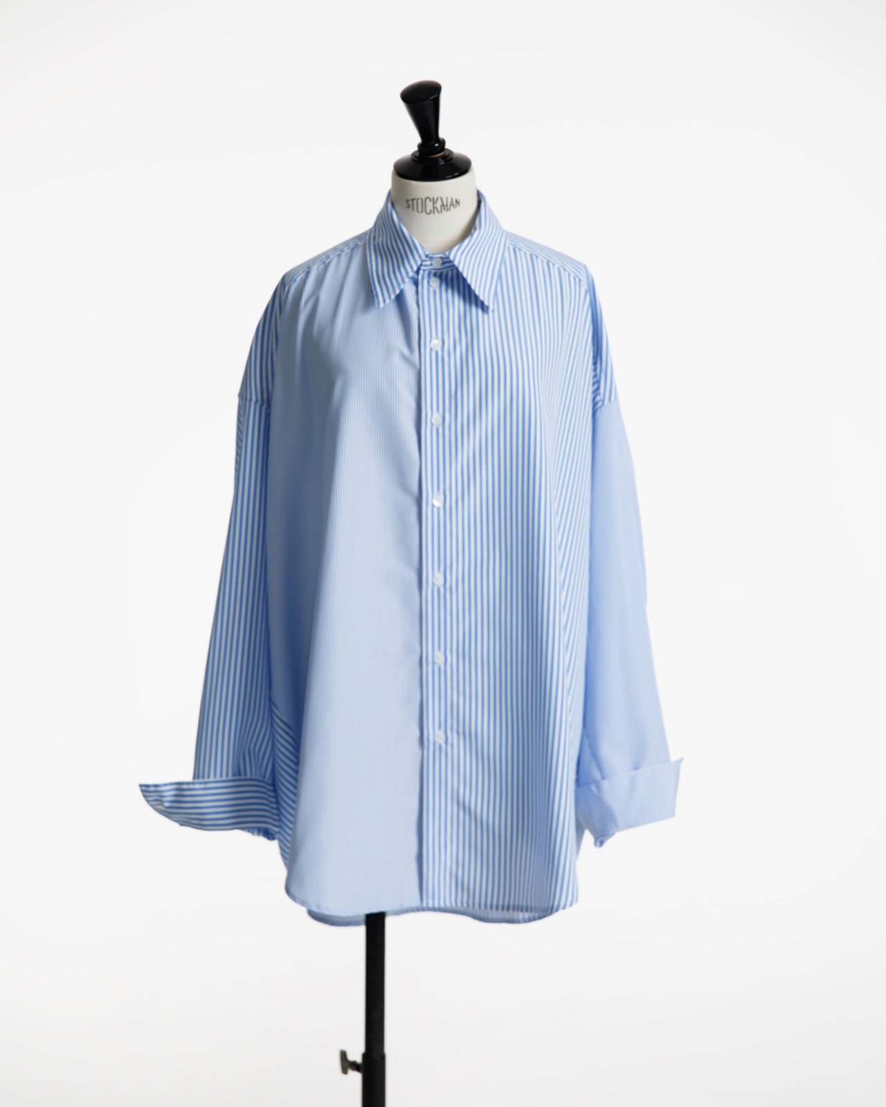 (PAPER MOON) OVERSIZED STRIPED COMBI BUTTON DOWN SHIRT : BLUE STRIPED