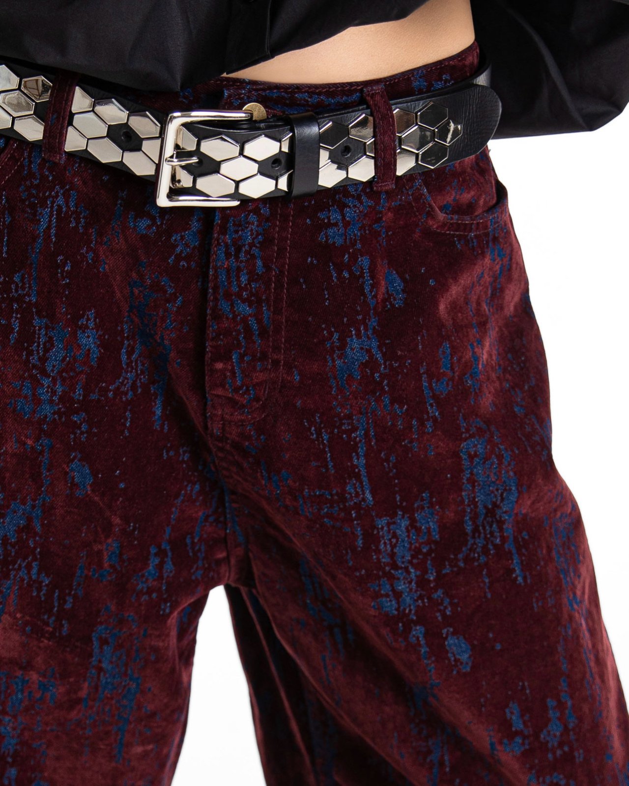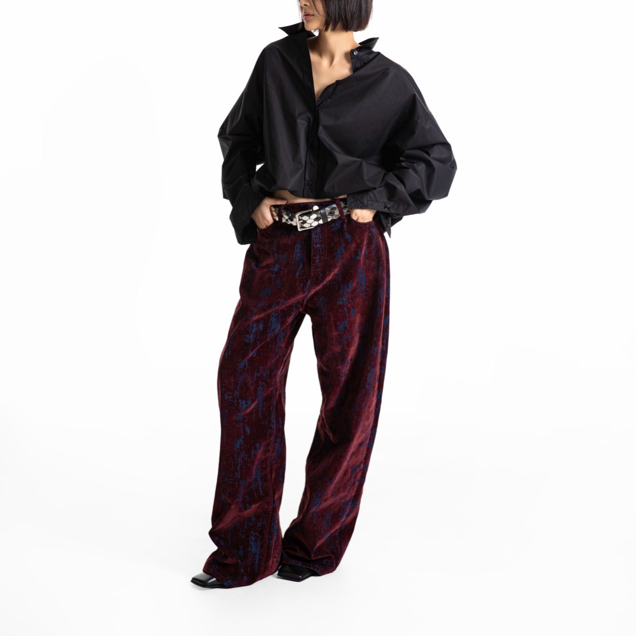 (PAPER MOON) VELVET CRACK DETAIL DENIM WIDE PANTS : BURGUNDY