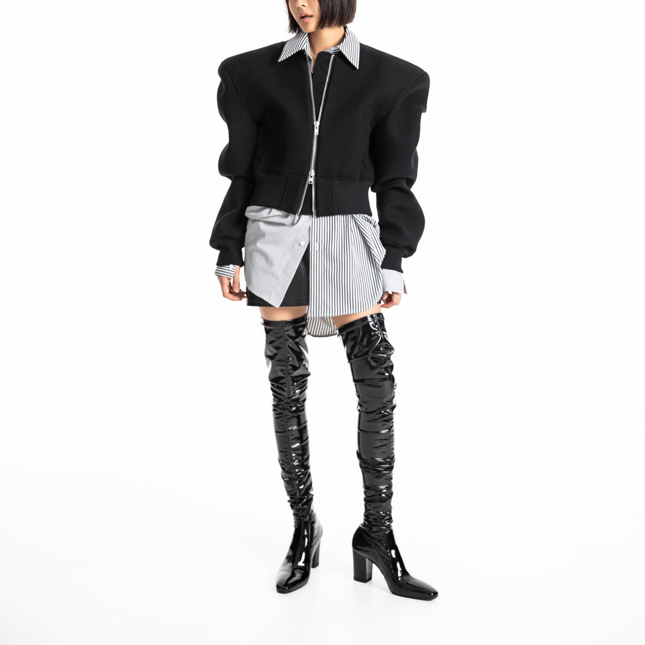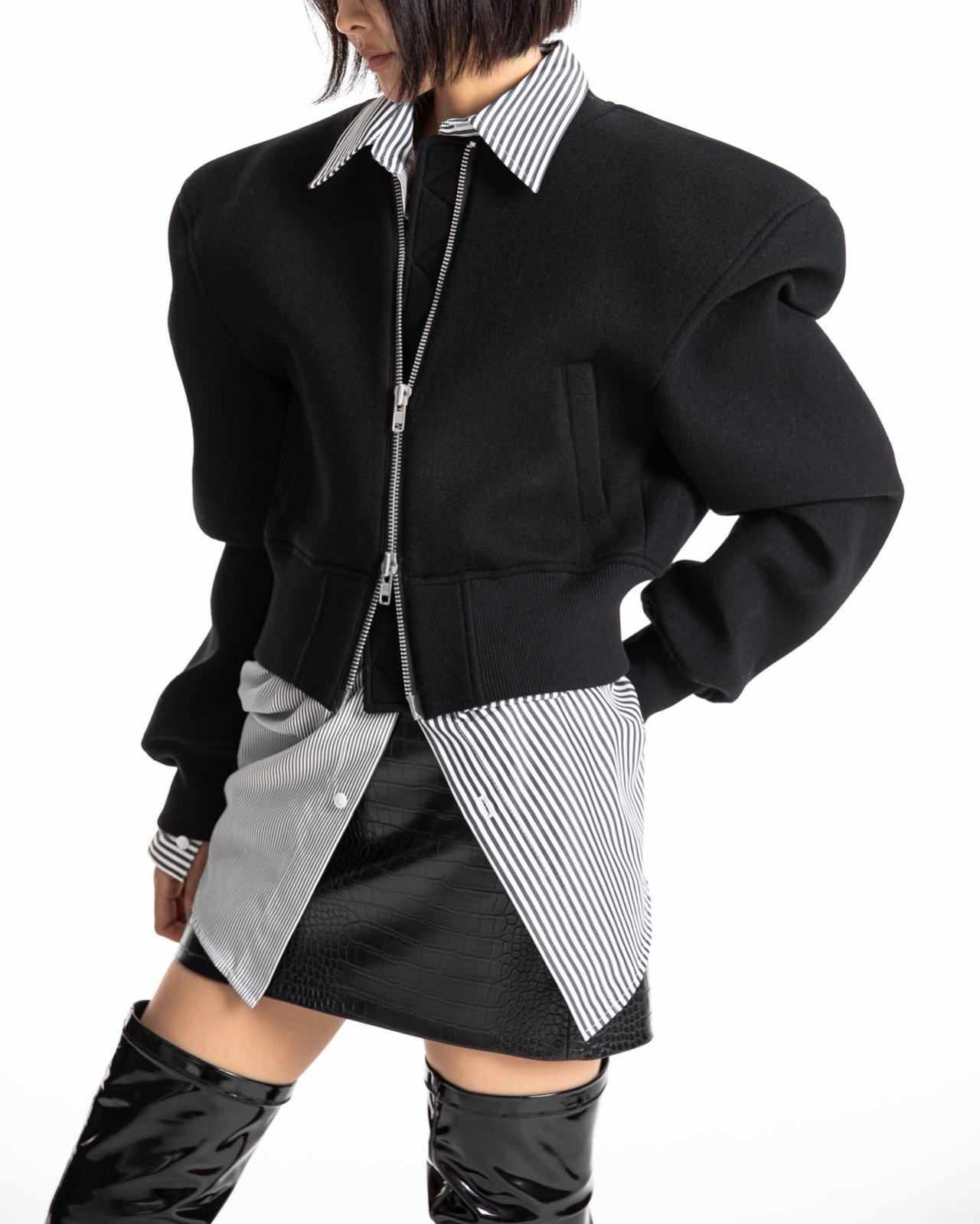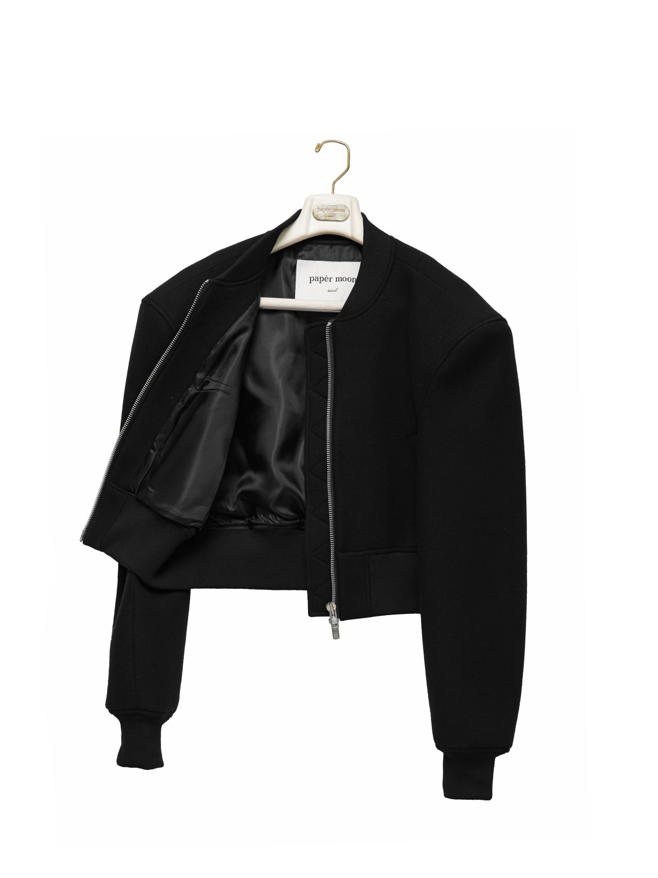 (PAPER MOON) CUSHIONED FABRIC PADDED SHOULDER POINT DETAIL BOMBER JACKET : BLACK