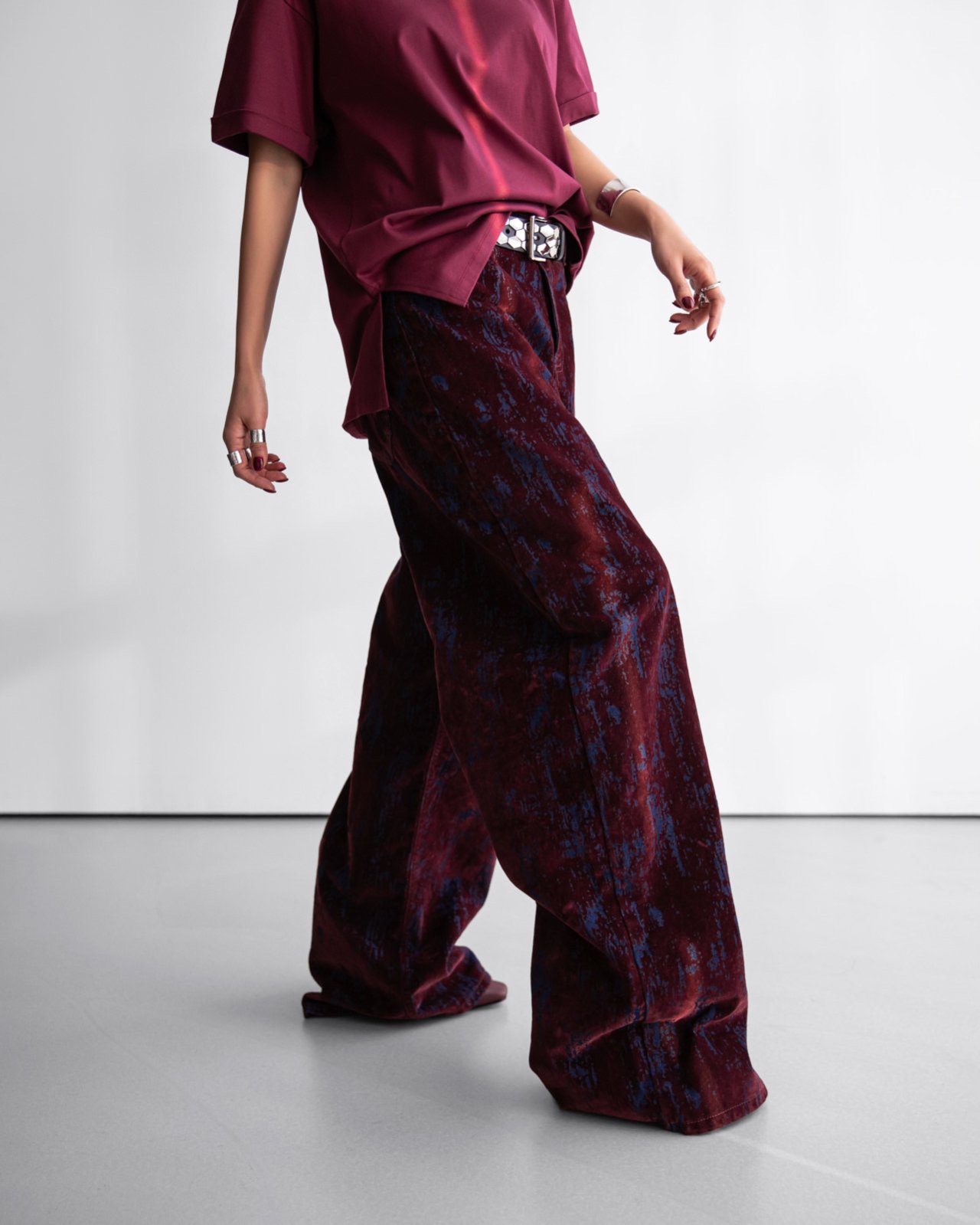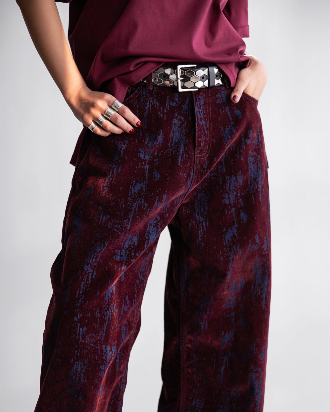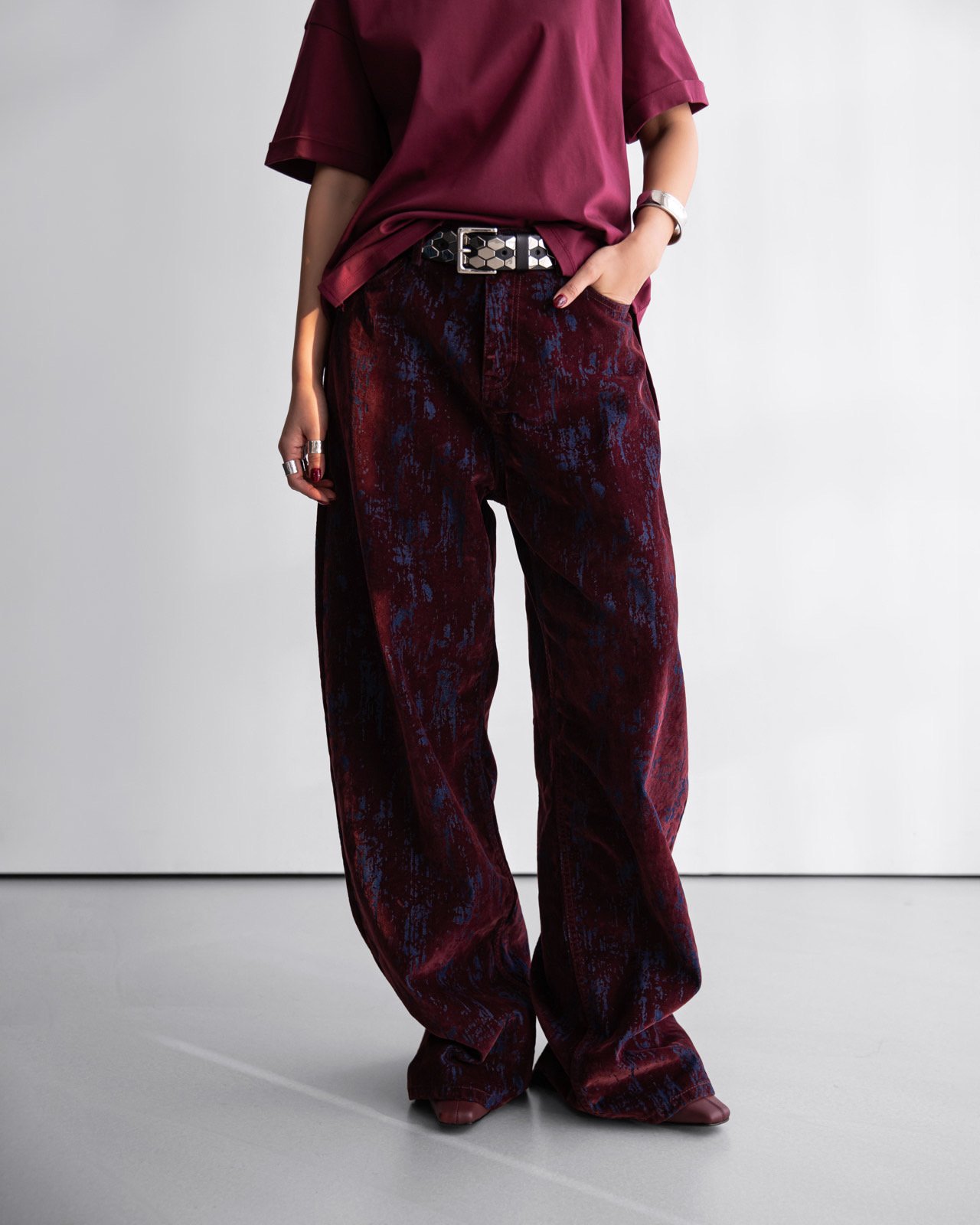 (PAPER MOON) VELVET CRACK DETAIL DENIM WIDE PANTS : BURGUNDY