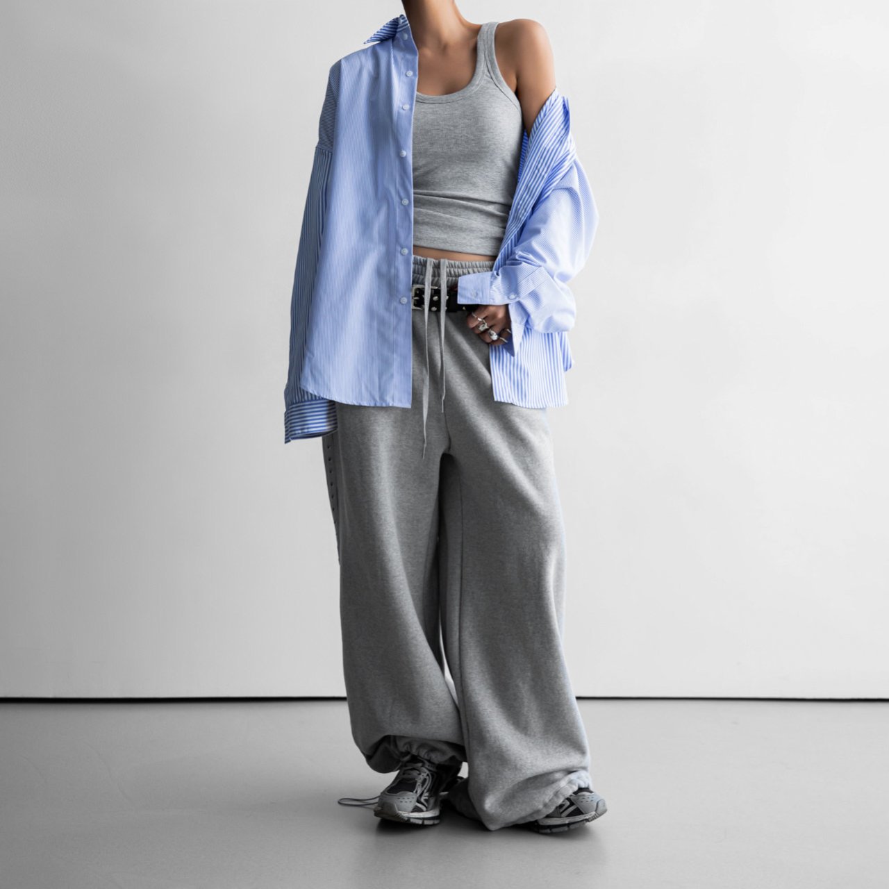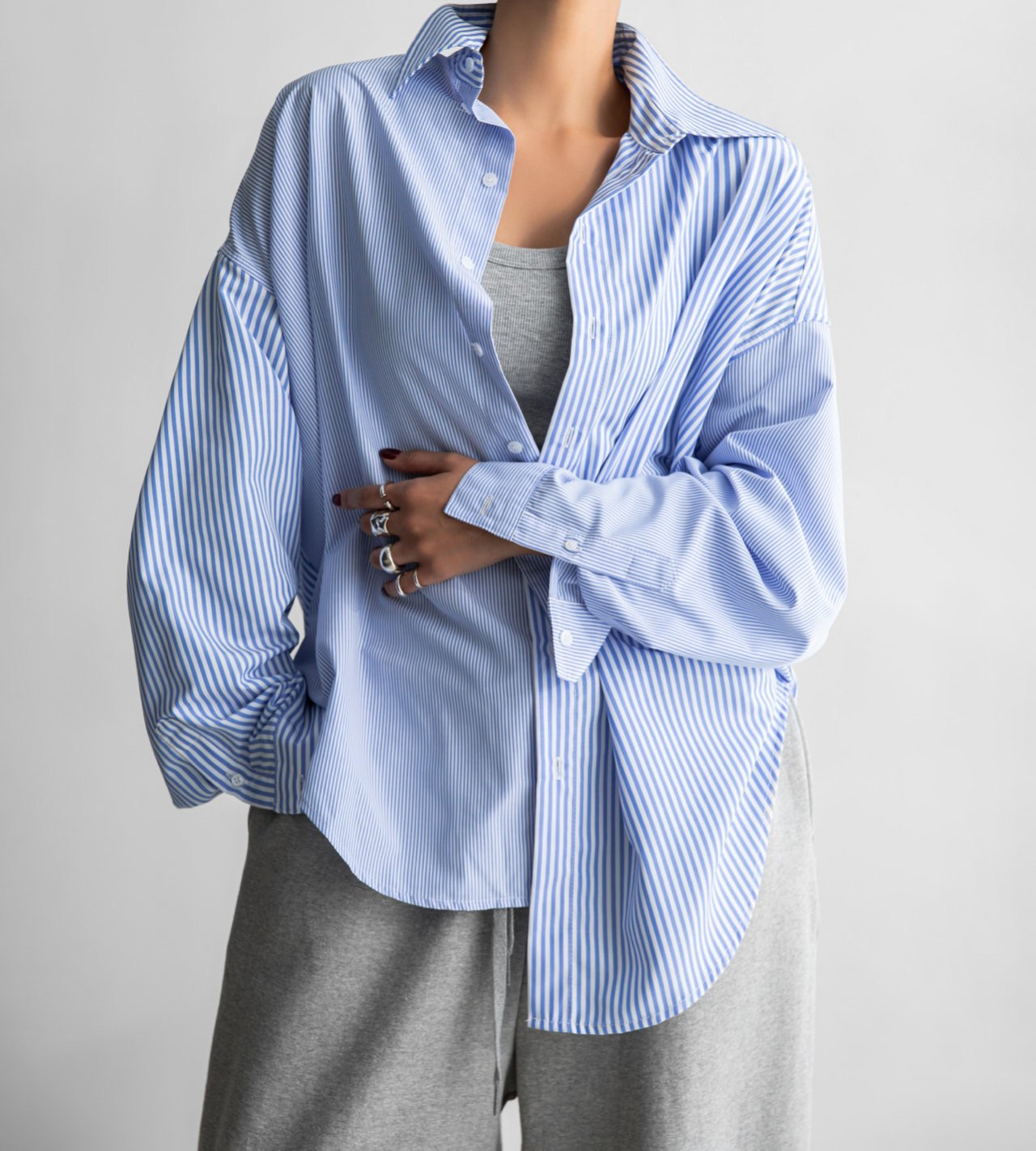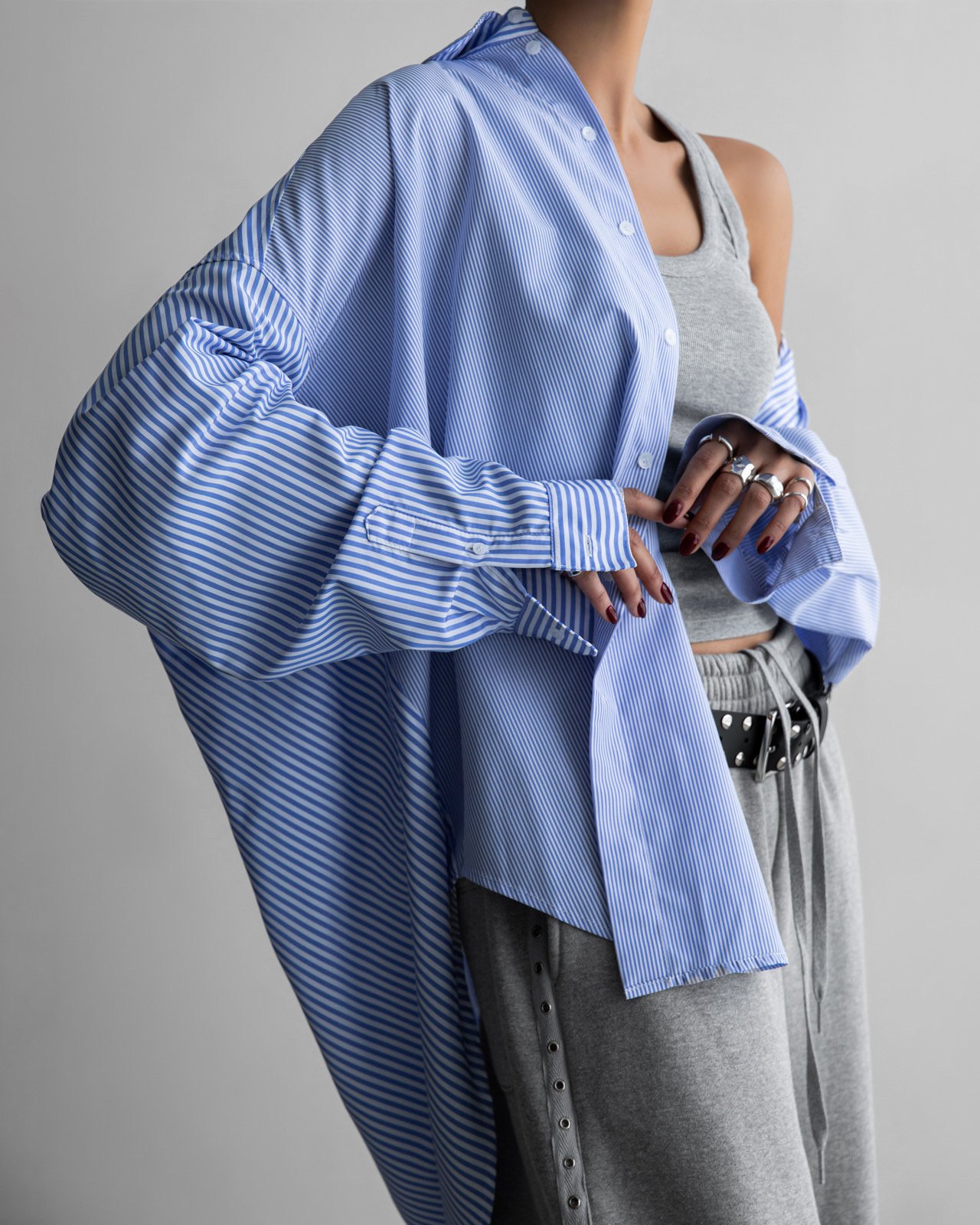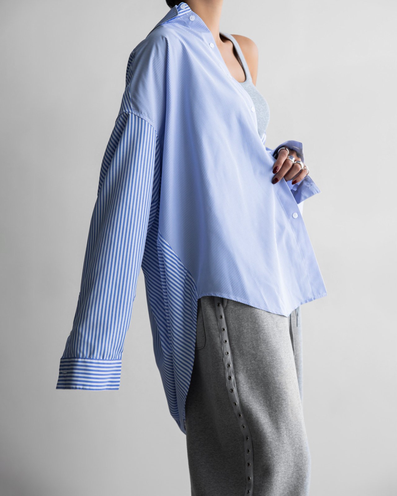 (PAPER MOON) OVERSIZED STRIPED COMBI BUTTON DOWN SHIRT : BLUE STRIPED