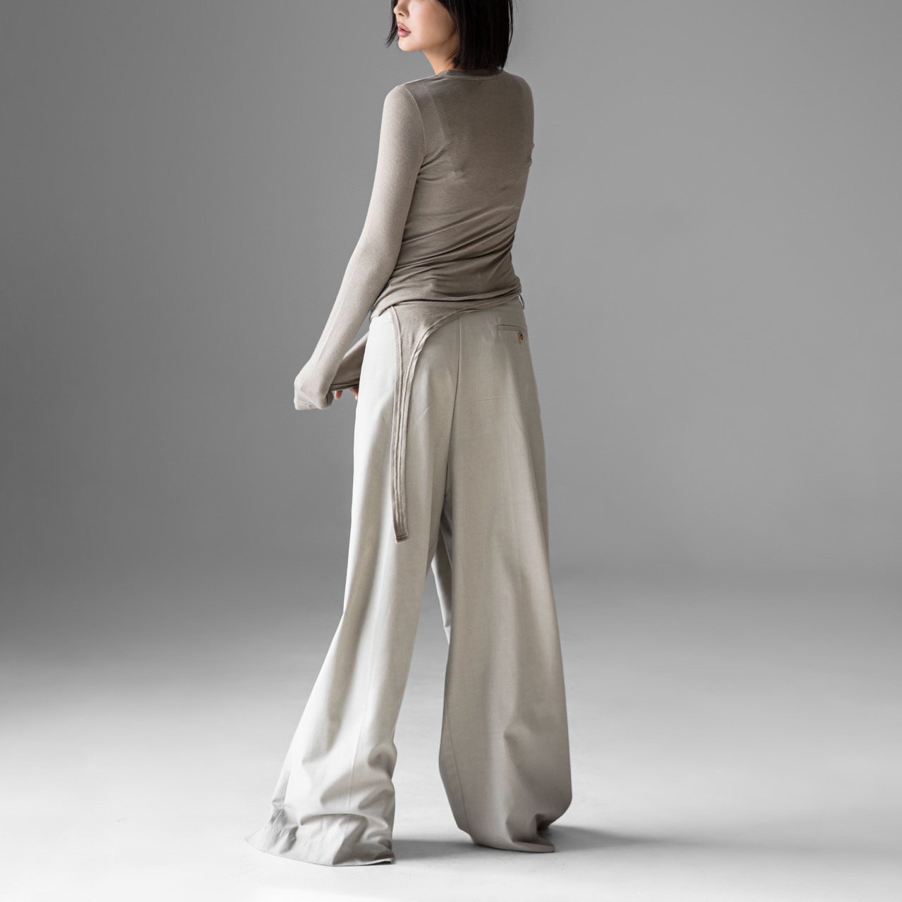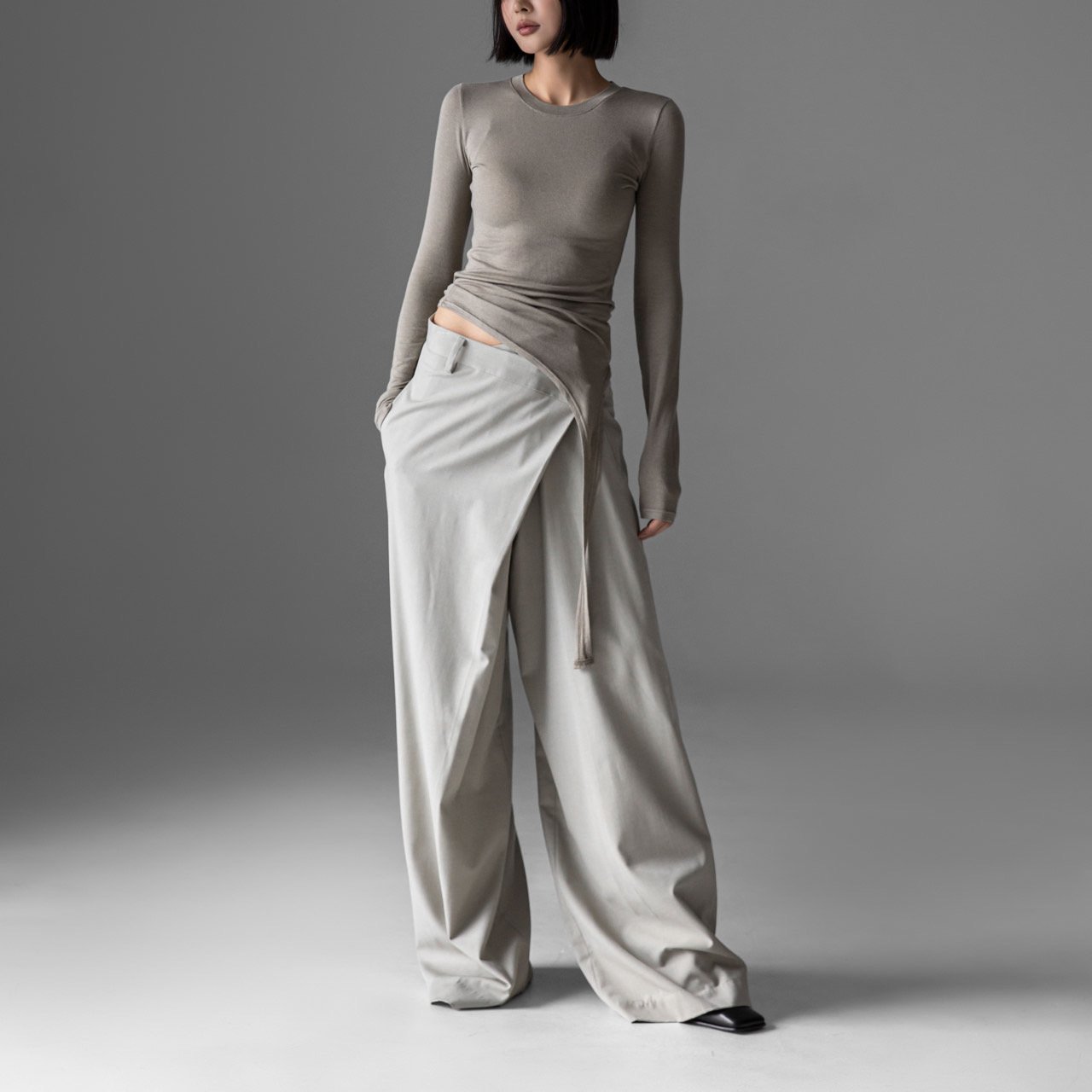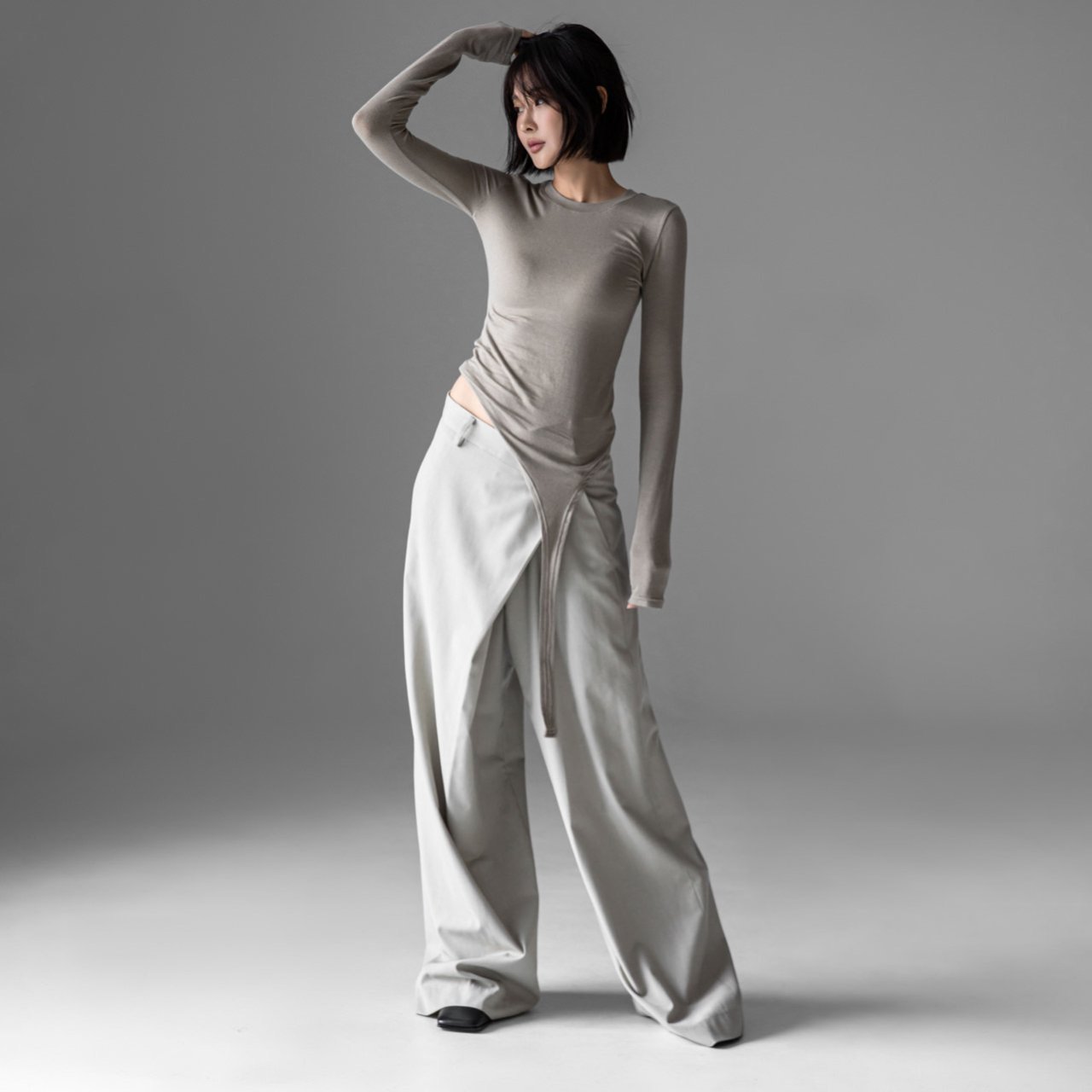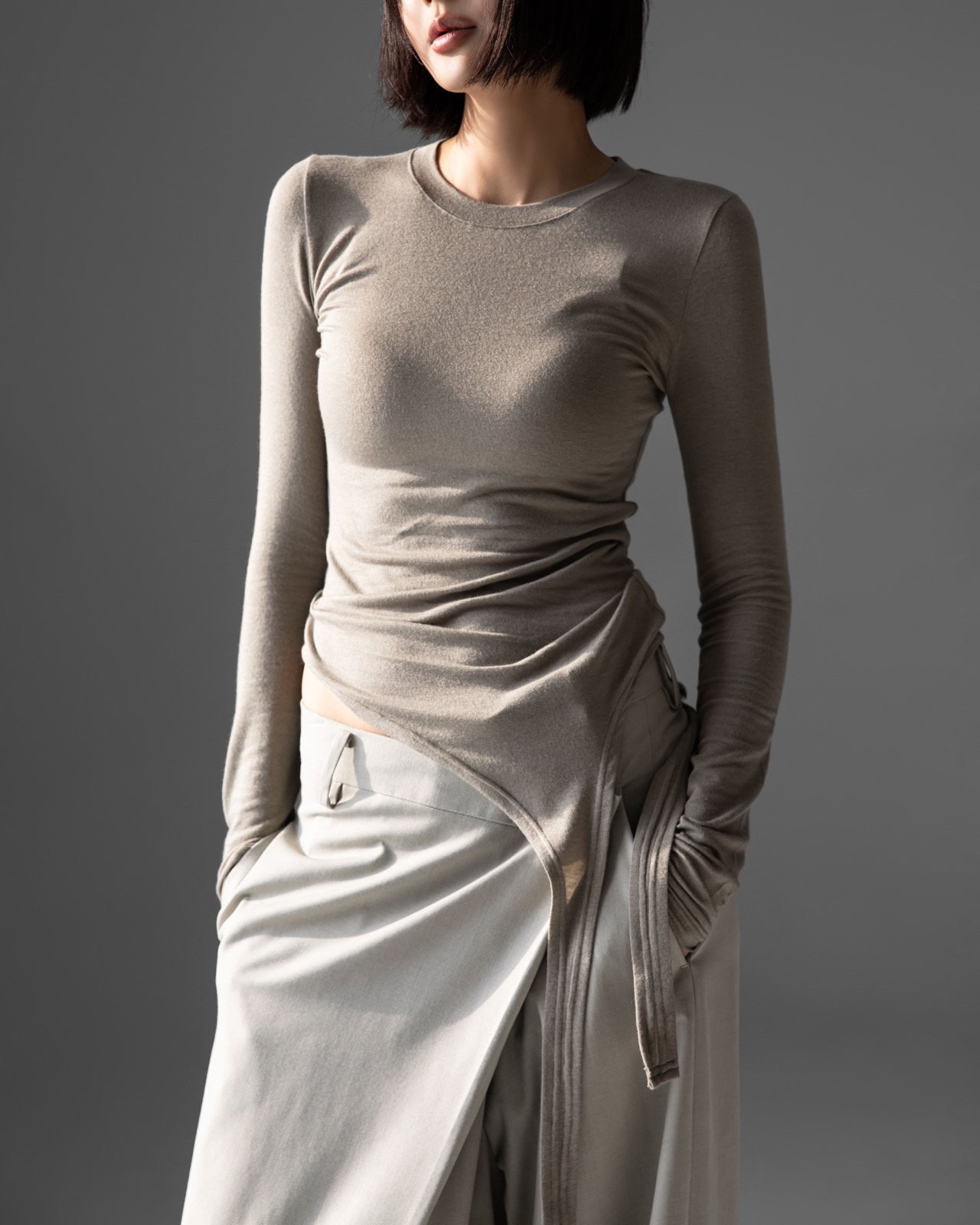 (PAPER MOON) UNBALANCED HEM LINE DETAIL SLIM LONG SLEEVED TEE : HEATHER GREY