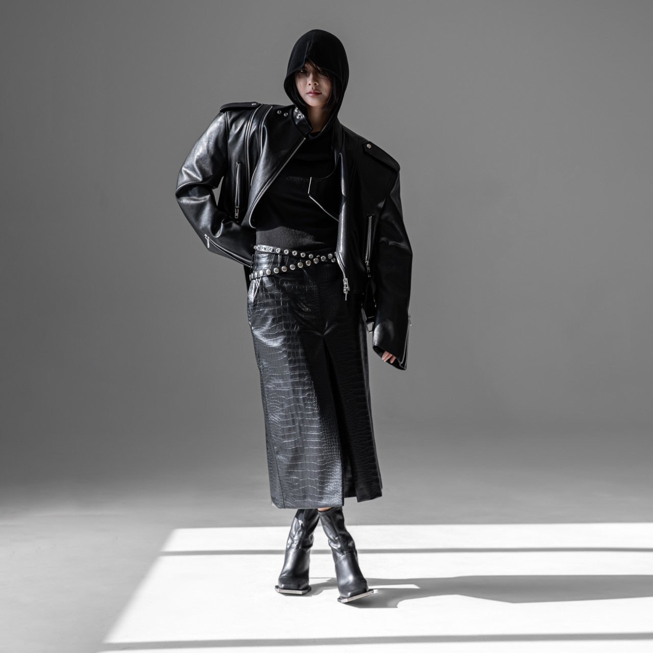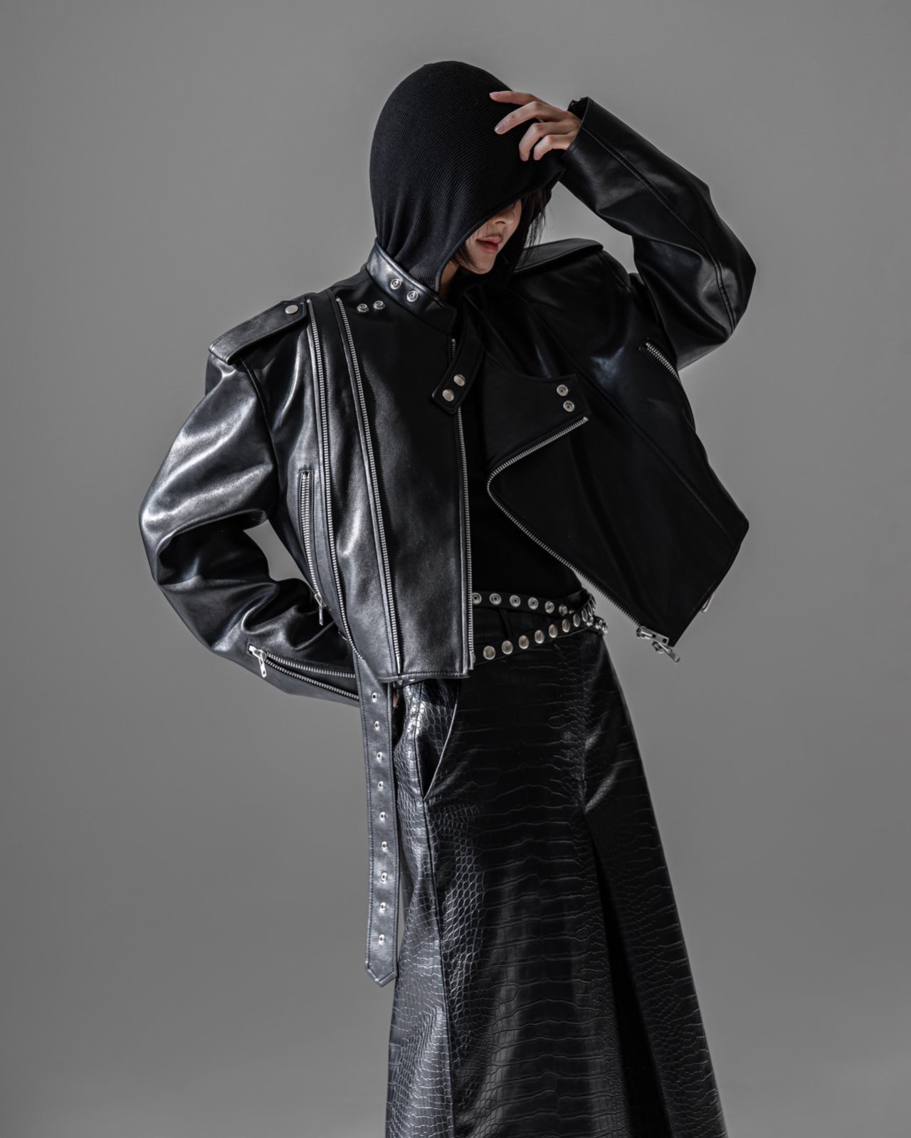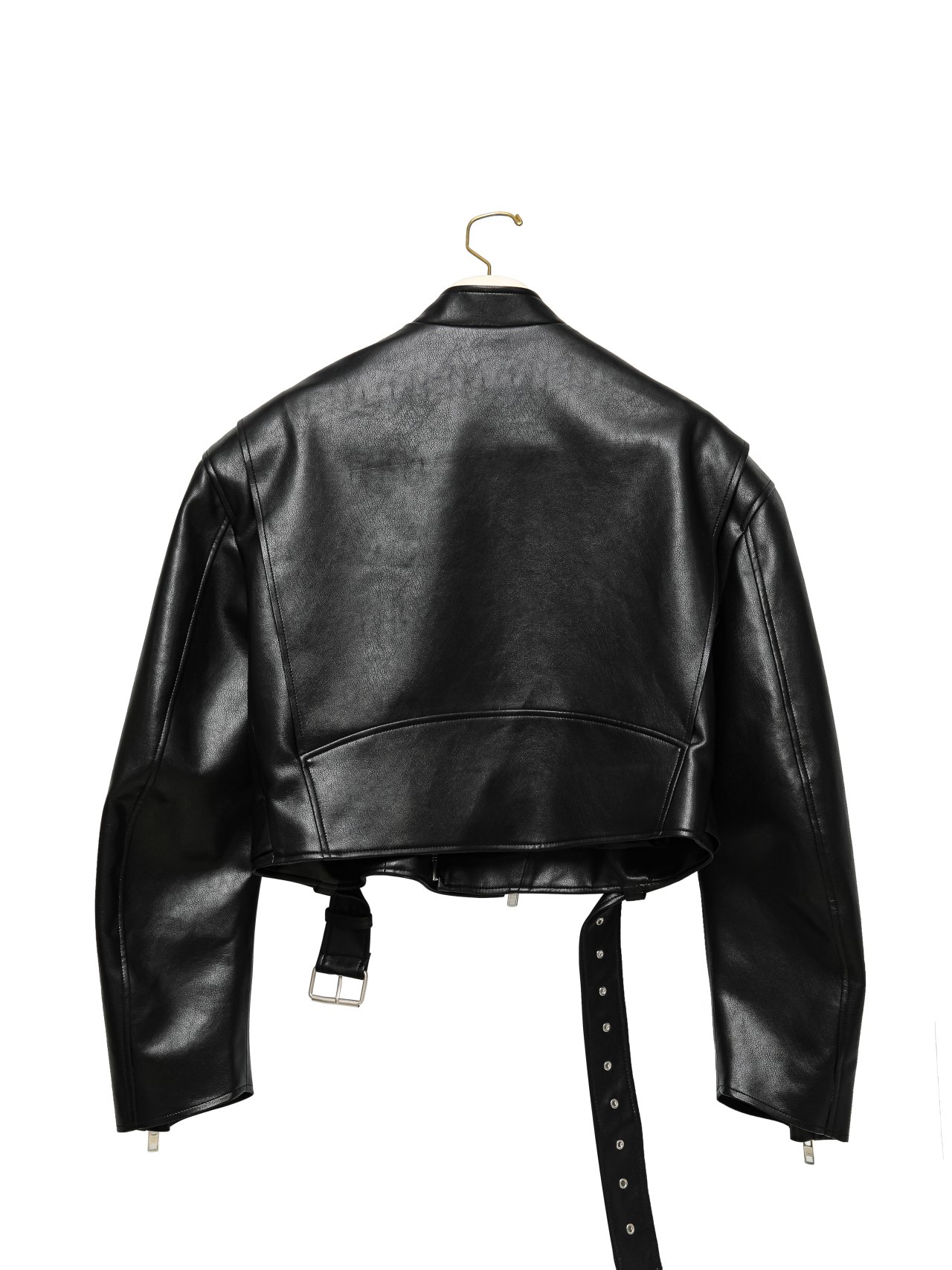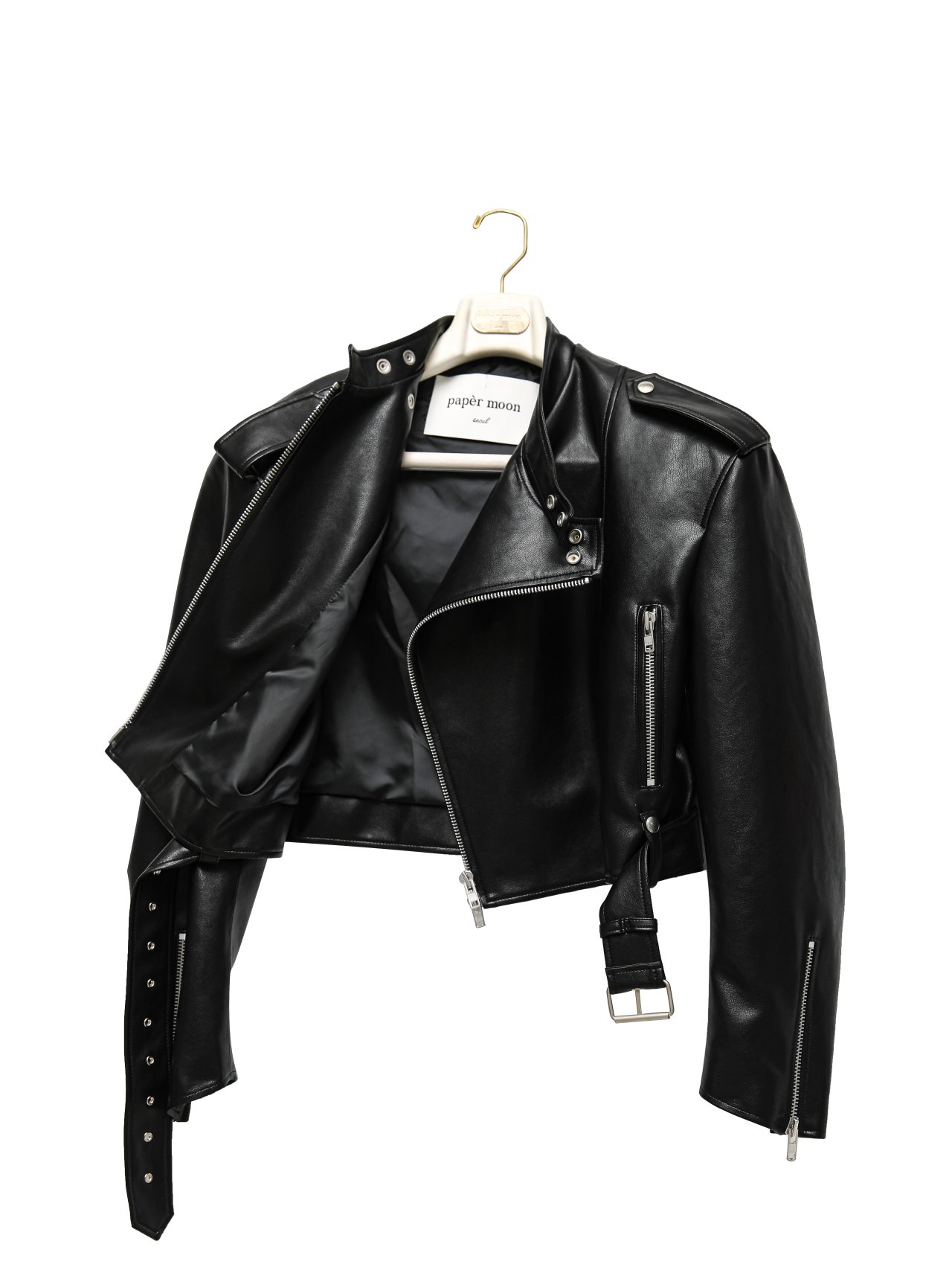 (PAPER MOON) DOUBLE ZIPPED DETAIL VEGAN LEATHER BUCKLE BELTED BIKER JACKET : BLACK