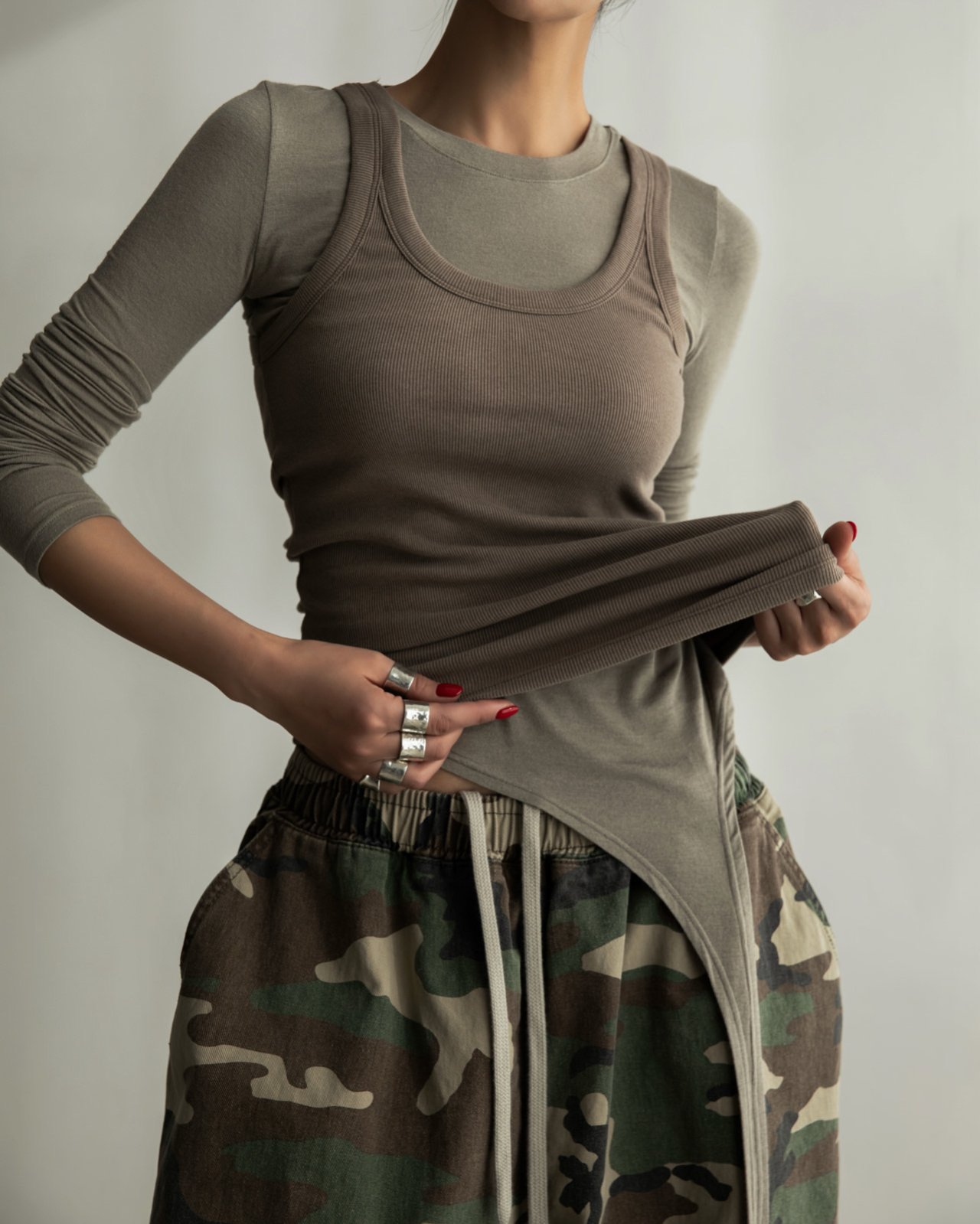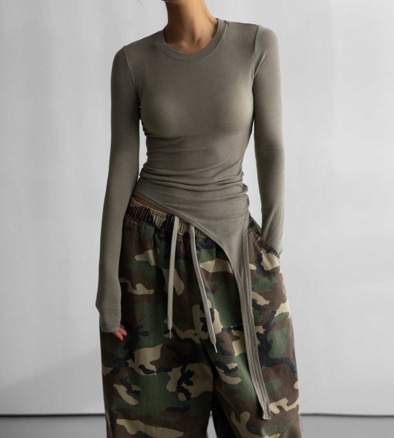 (PAPER MOON) UNBALANCED HEM LINE DETAIL SLIM LONG SLEEVED TEE : HEATHER GREY