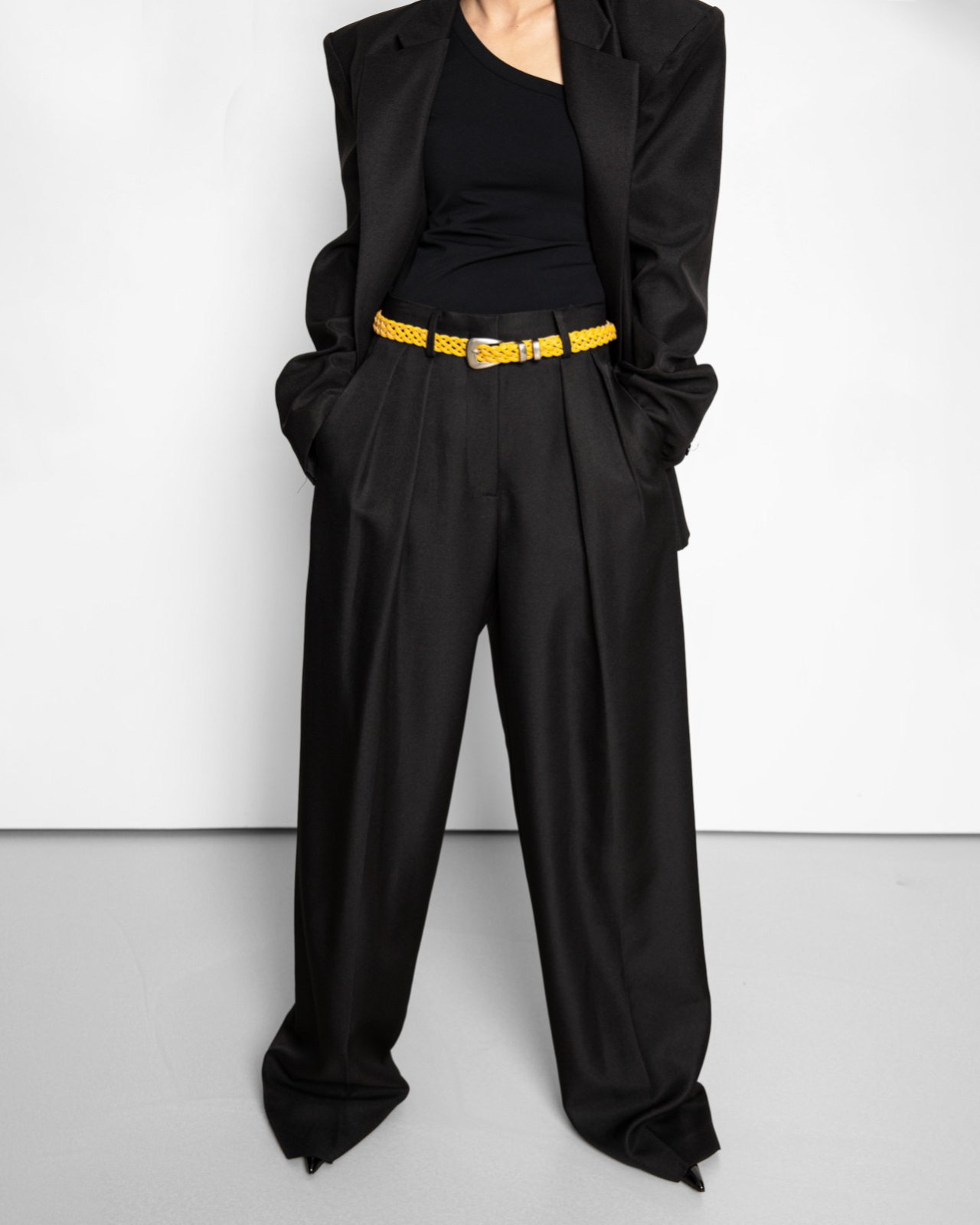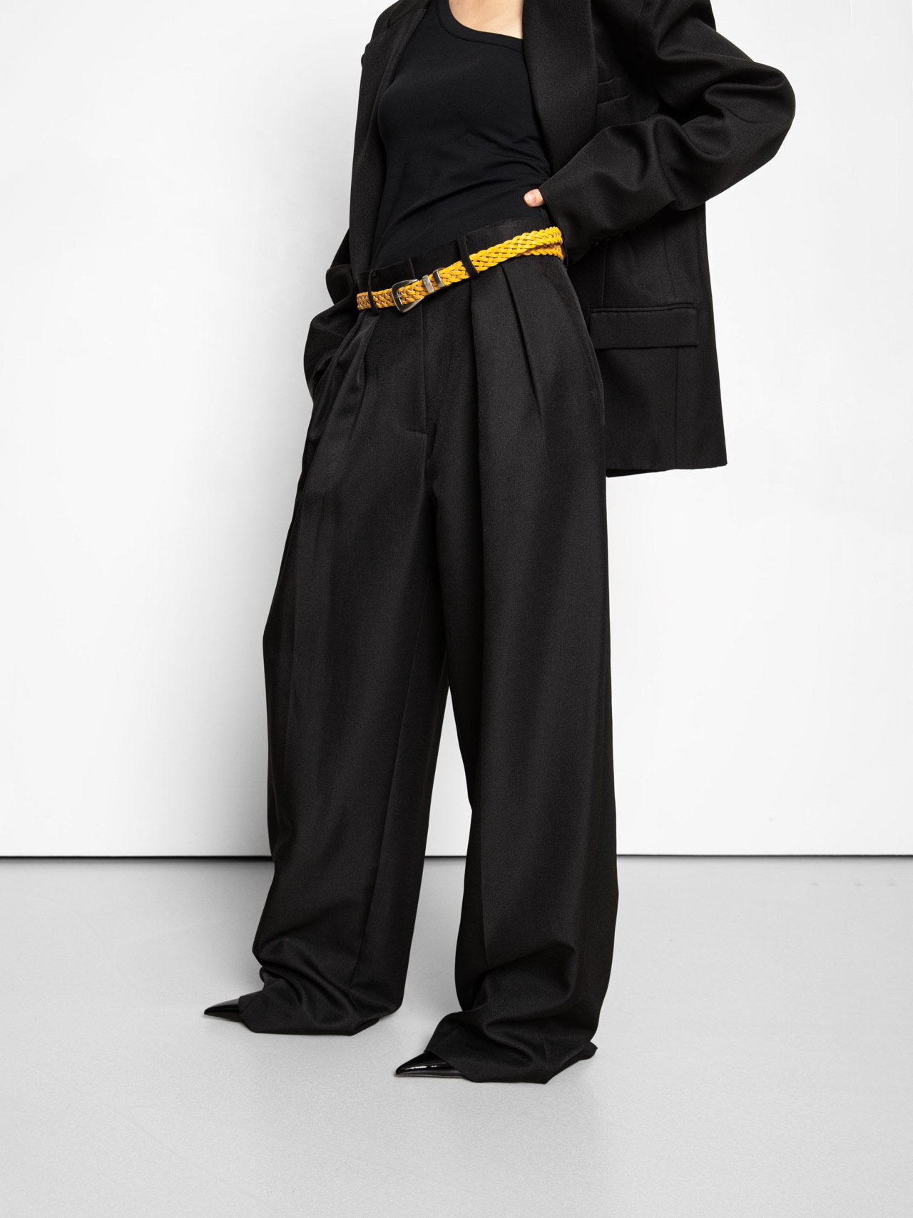 (PAPER MOON) TWILL TEXTURE LOW WAISTED DOUBLE PLEATS WIDE TROUSERS : BLACK