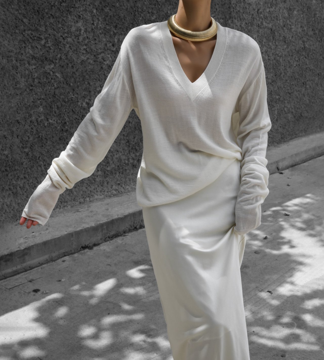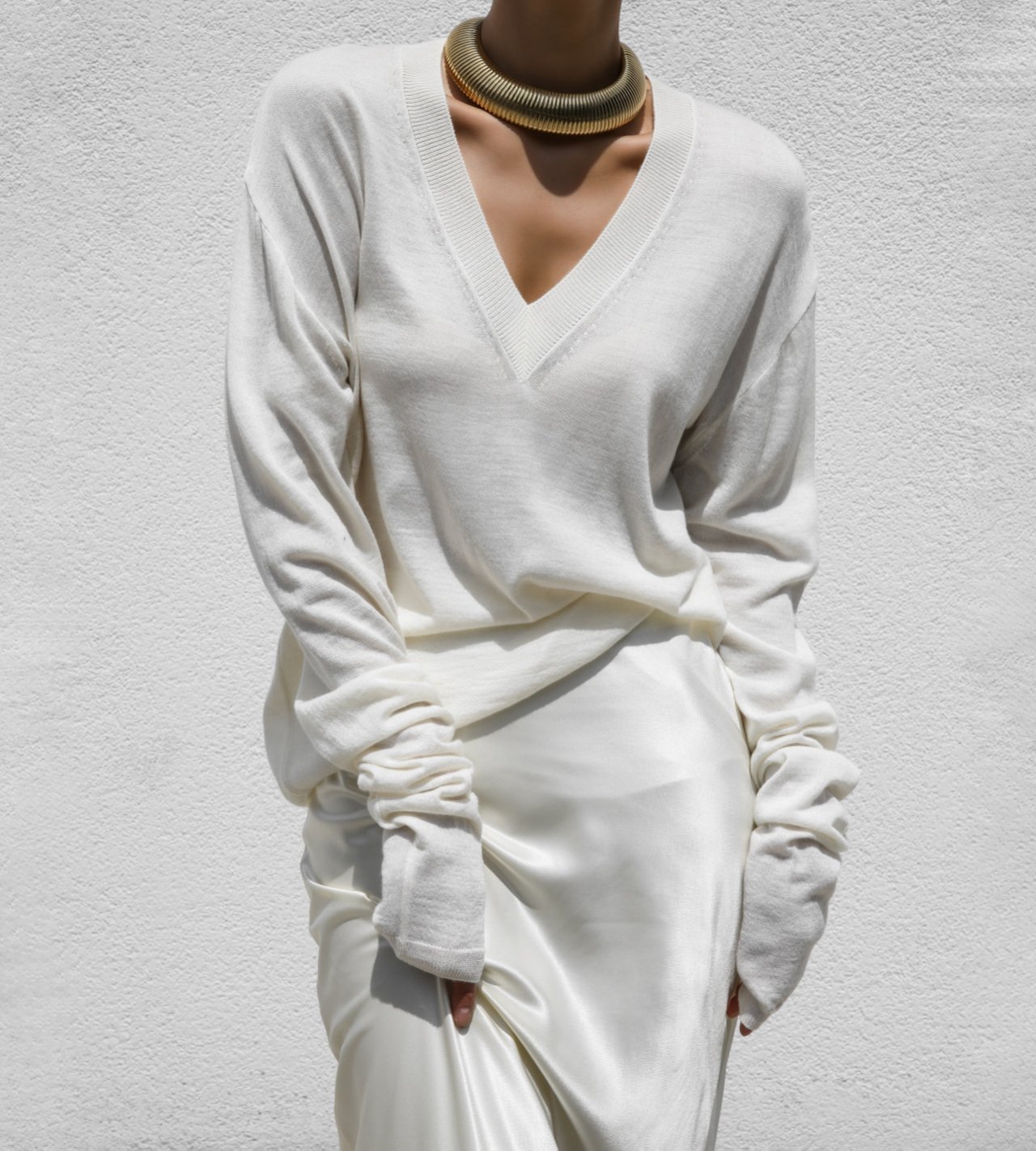 (PAPER MOON) WOOL SILK DEEP V - NECK LONG SLEEVED KNIT : CREAM