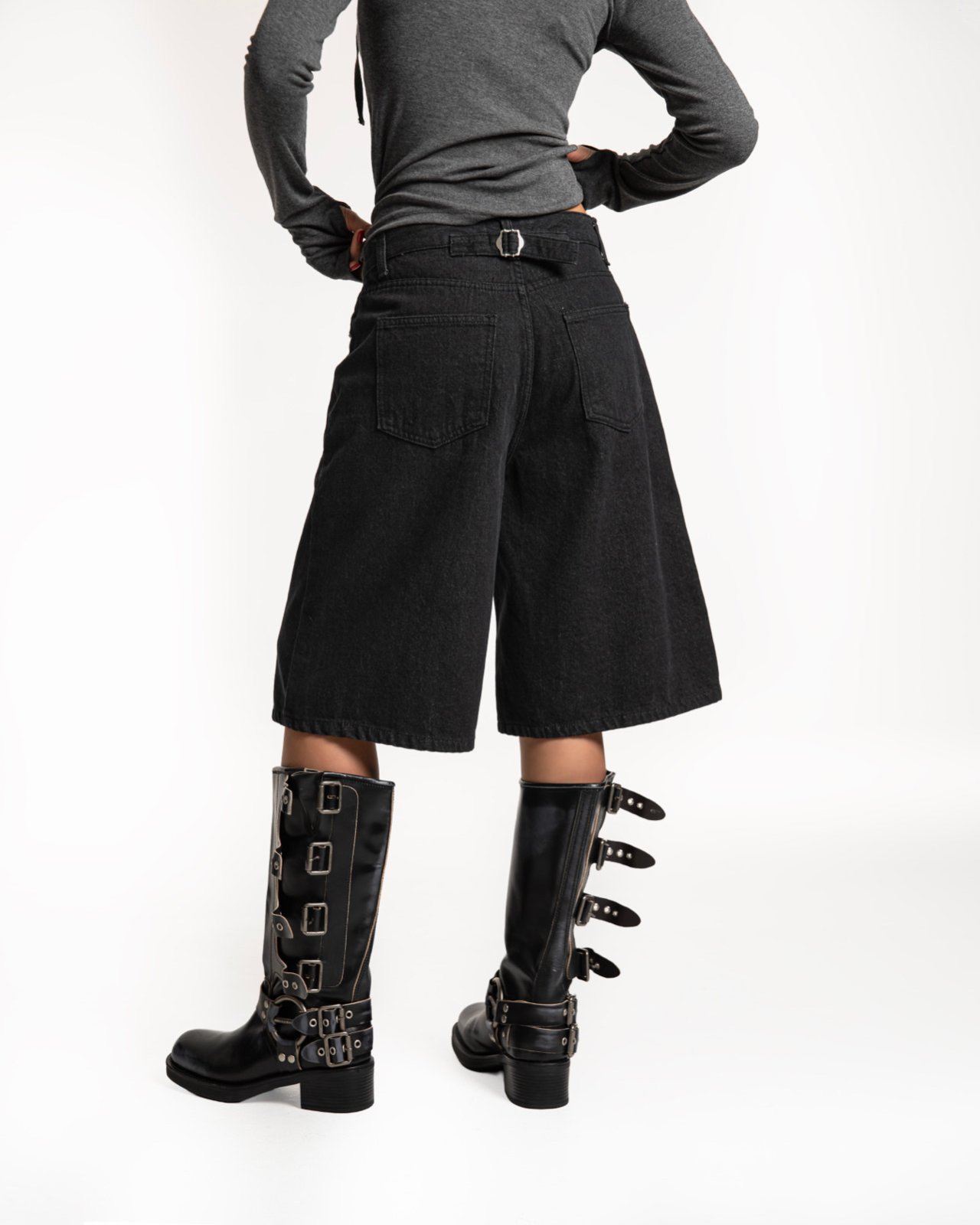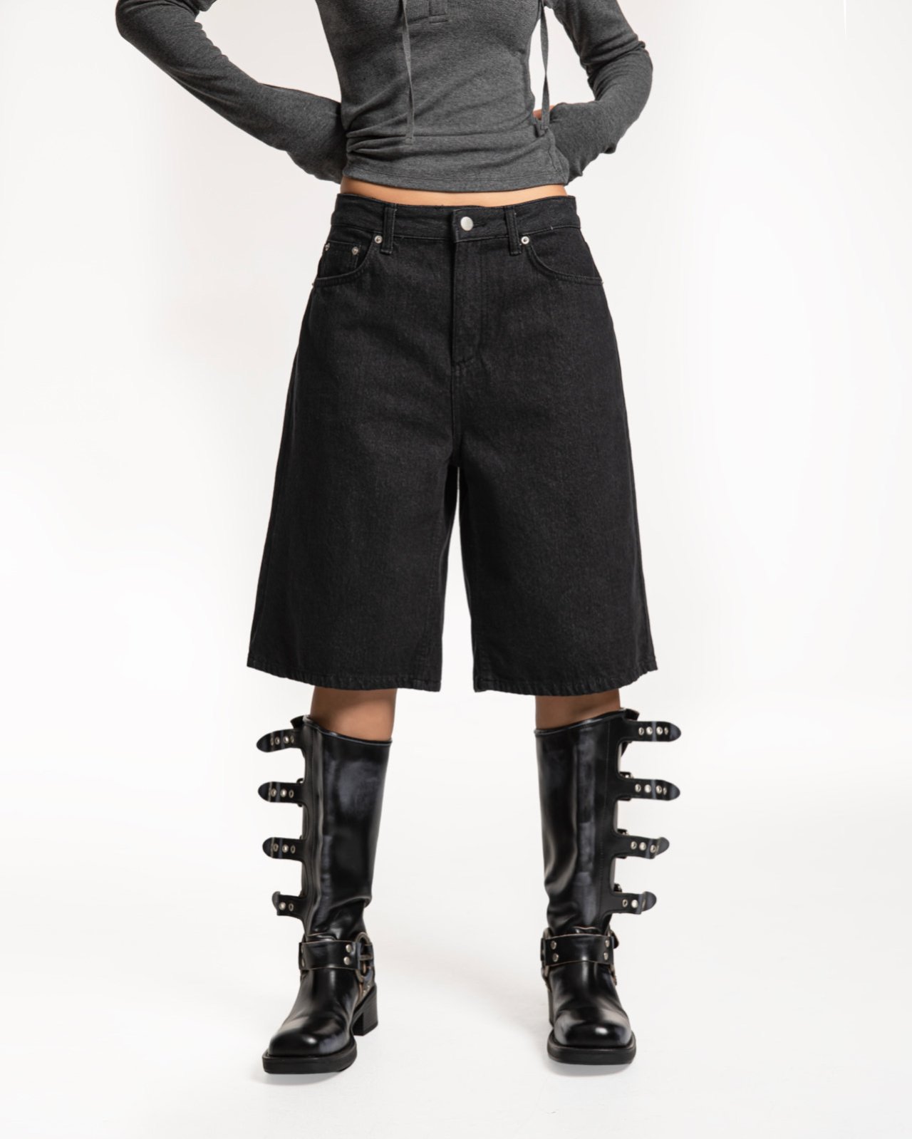 (PAPER MOON) CLASSIC WIDE BERMUDA WASHED BLACK DENIM TROUSERS : WASHED BLACK