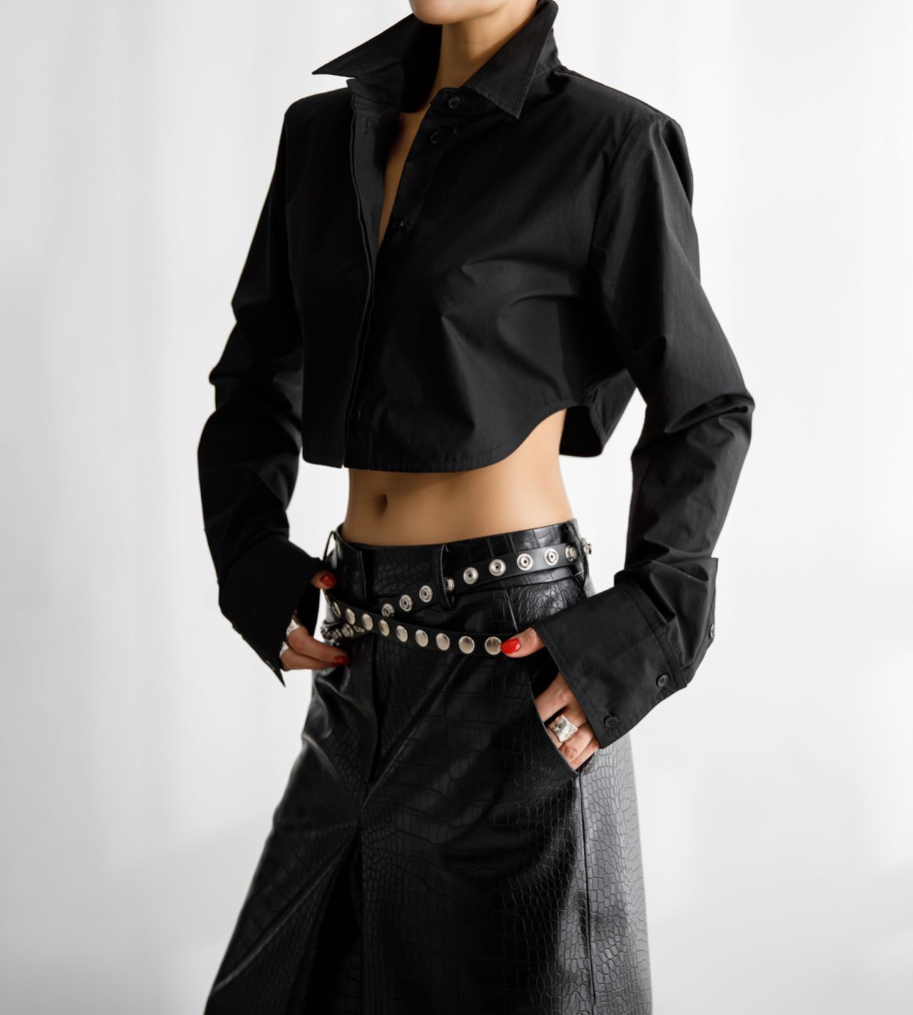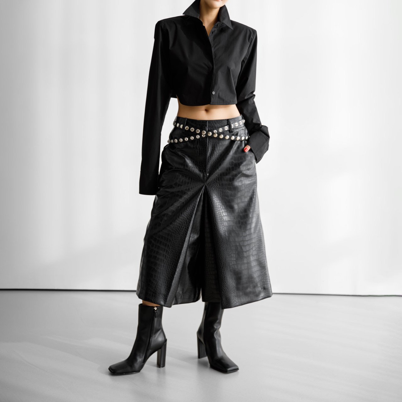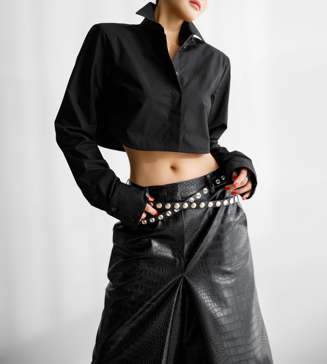 (PAPER MOON) CLASSIC SHOULDER PAD CROPPED BUTTON DOWN SHIRT : BLACK