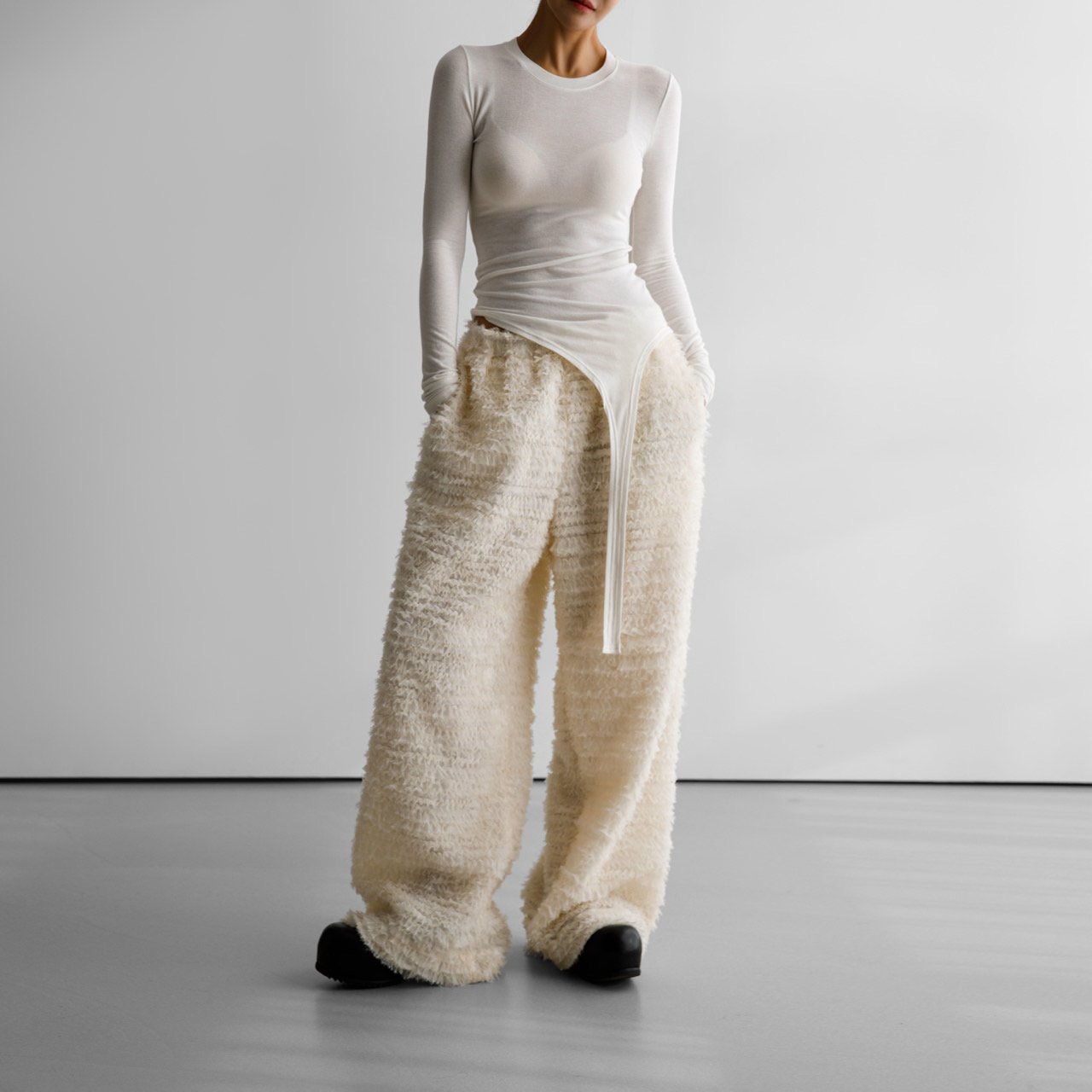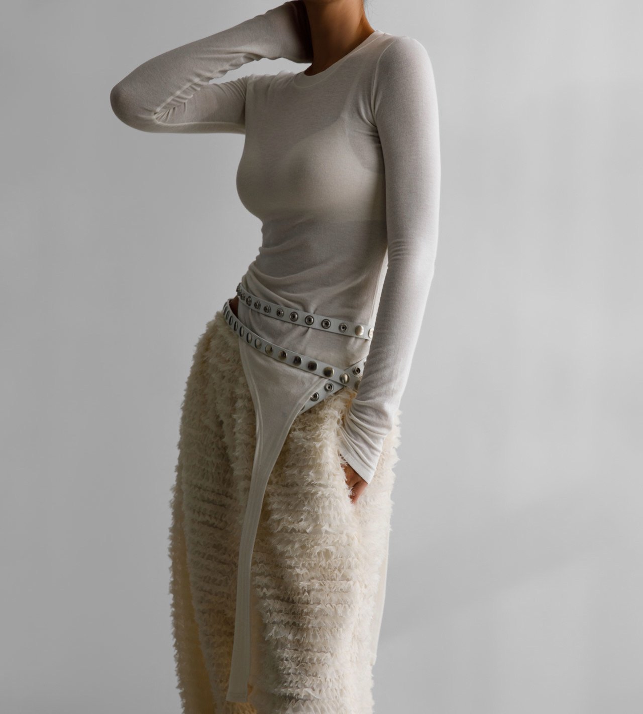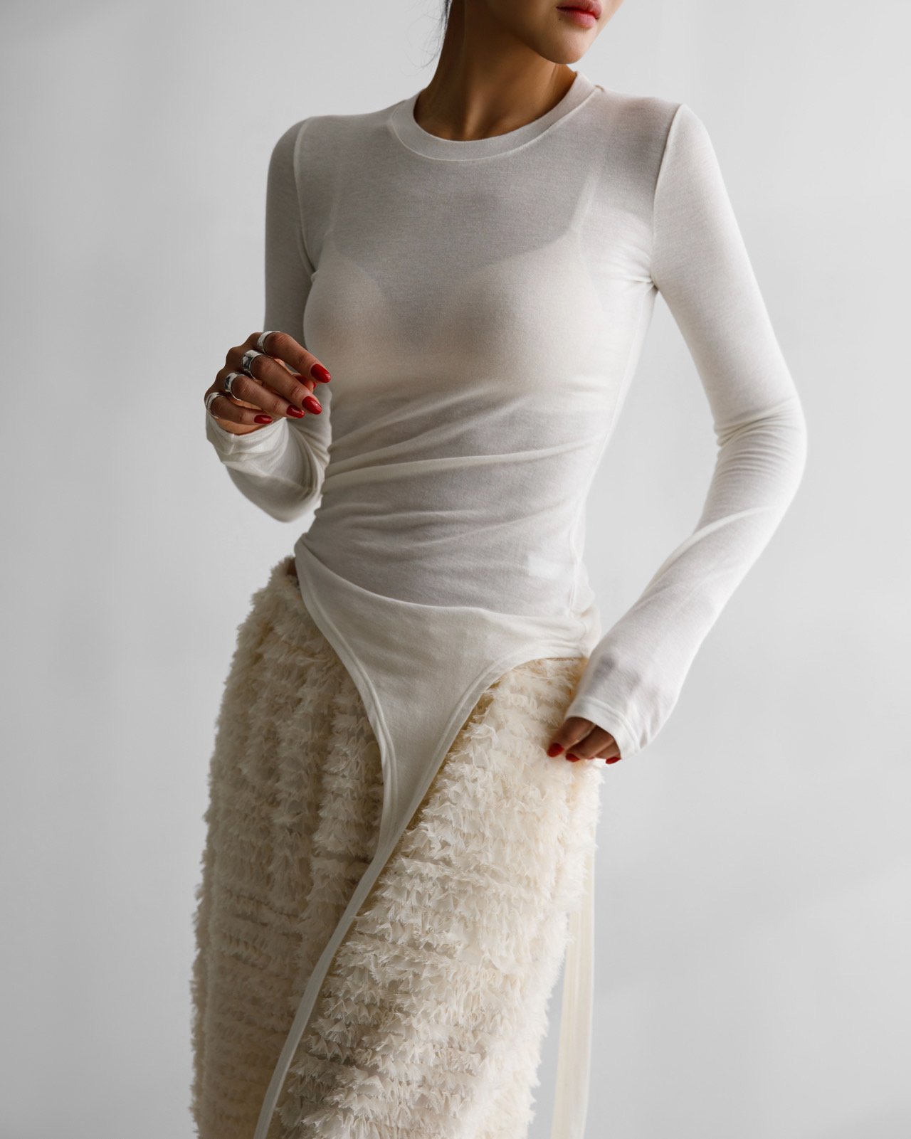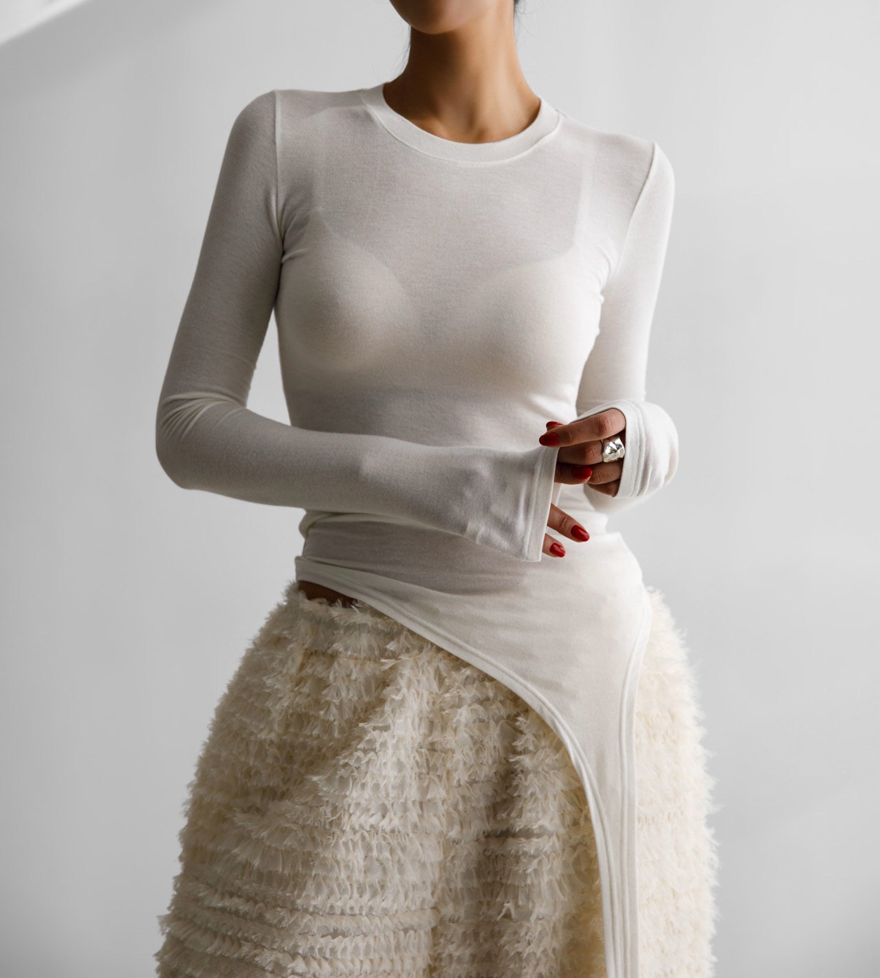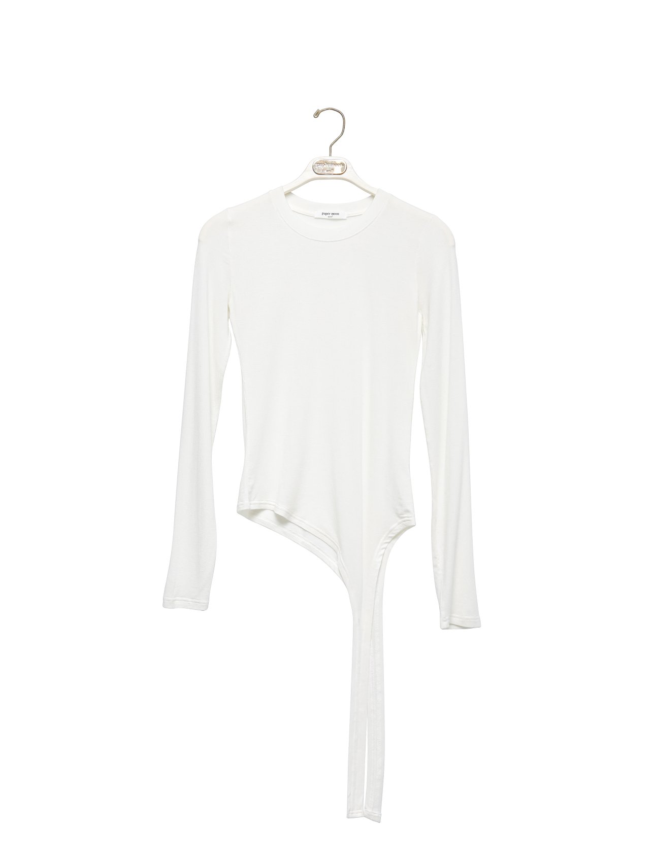 (PAPER MOON) UNBALANCED HEM LINE DETAIL SLIM LONG SLEEVED TEE : WHITE
