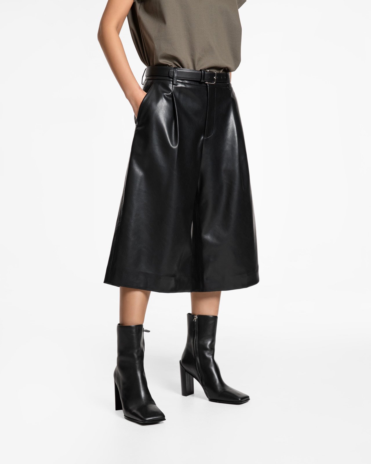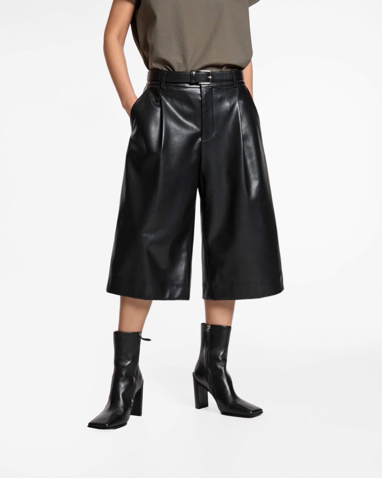 (PAPER MOON) CLASSIC WIDE FIT SHINY LEATHER BERMUDA TROUSERS : BLACK