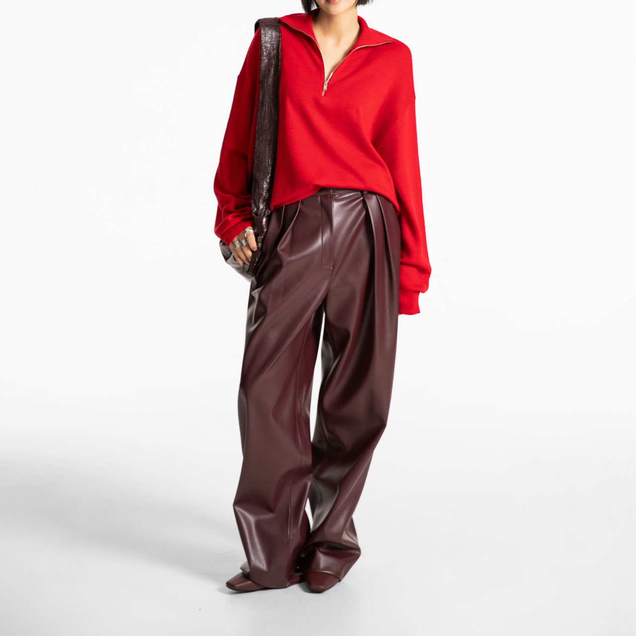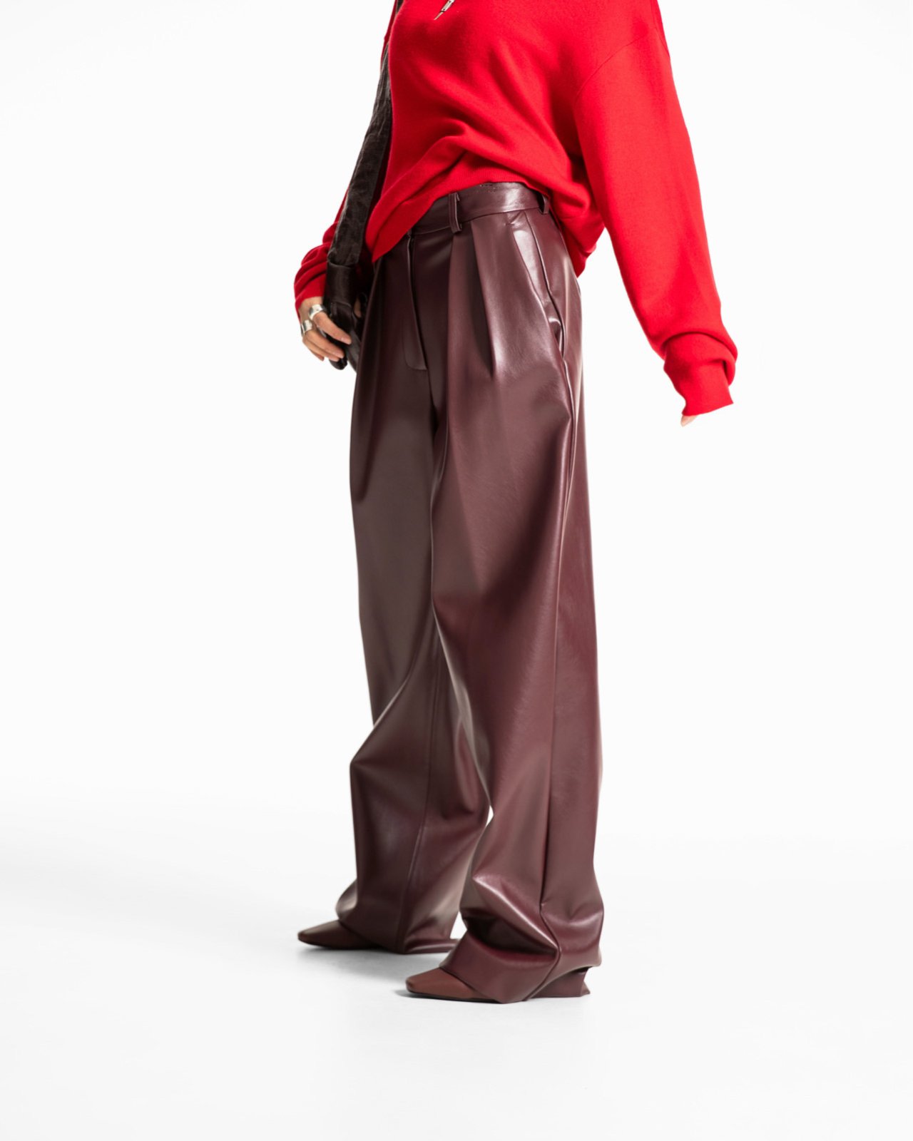 (PAPER MOON) LEATHER LOW WAISTED DOUBLE PLEATS WIDE TROUSERS : BURGUNDY
