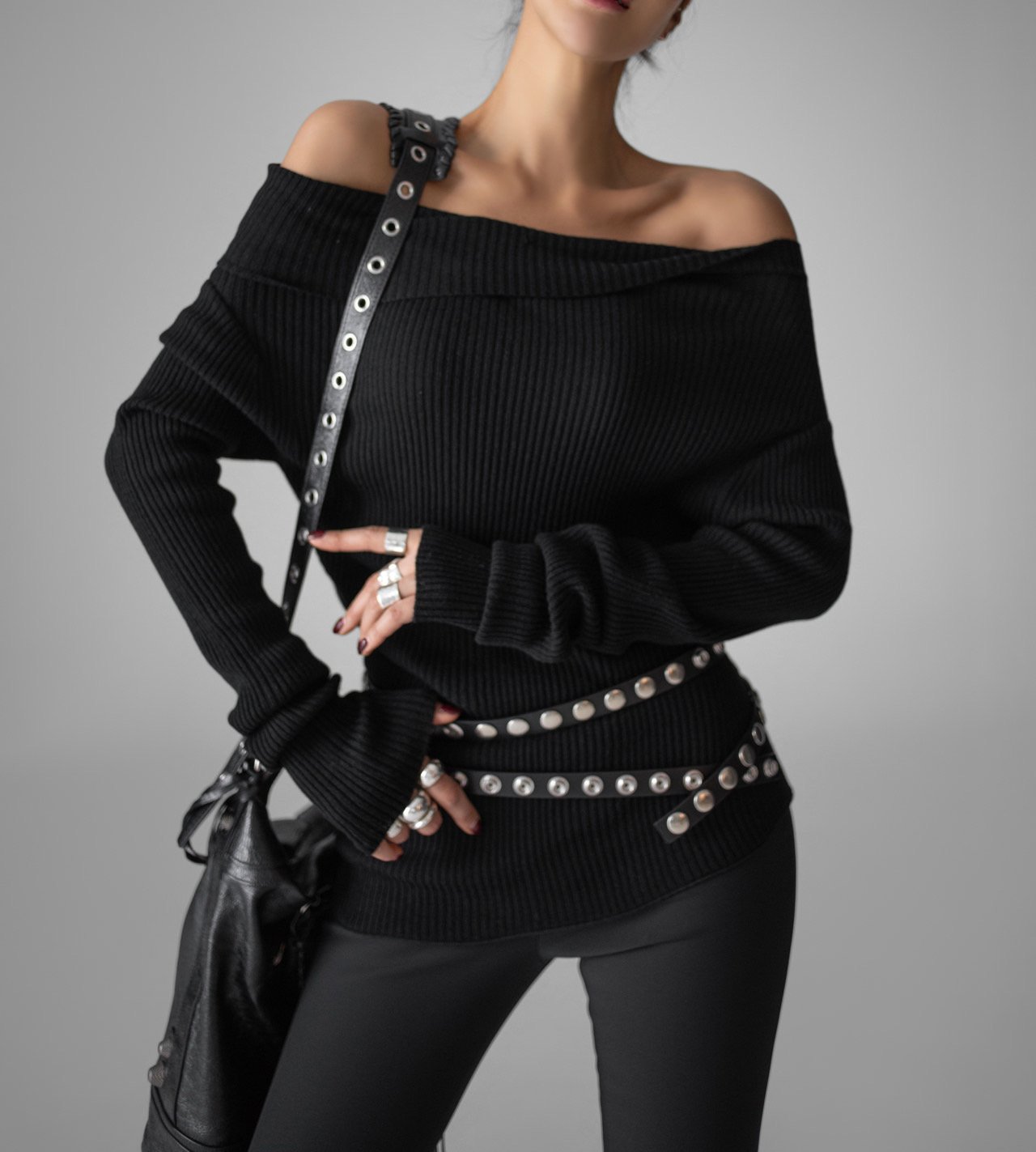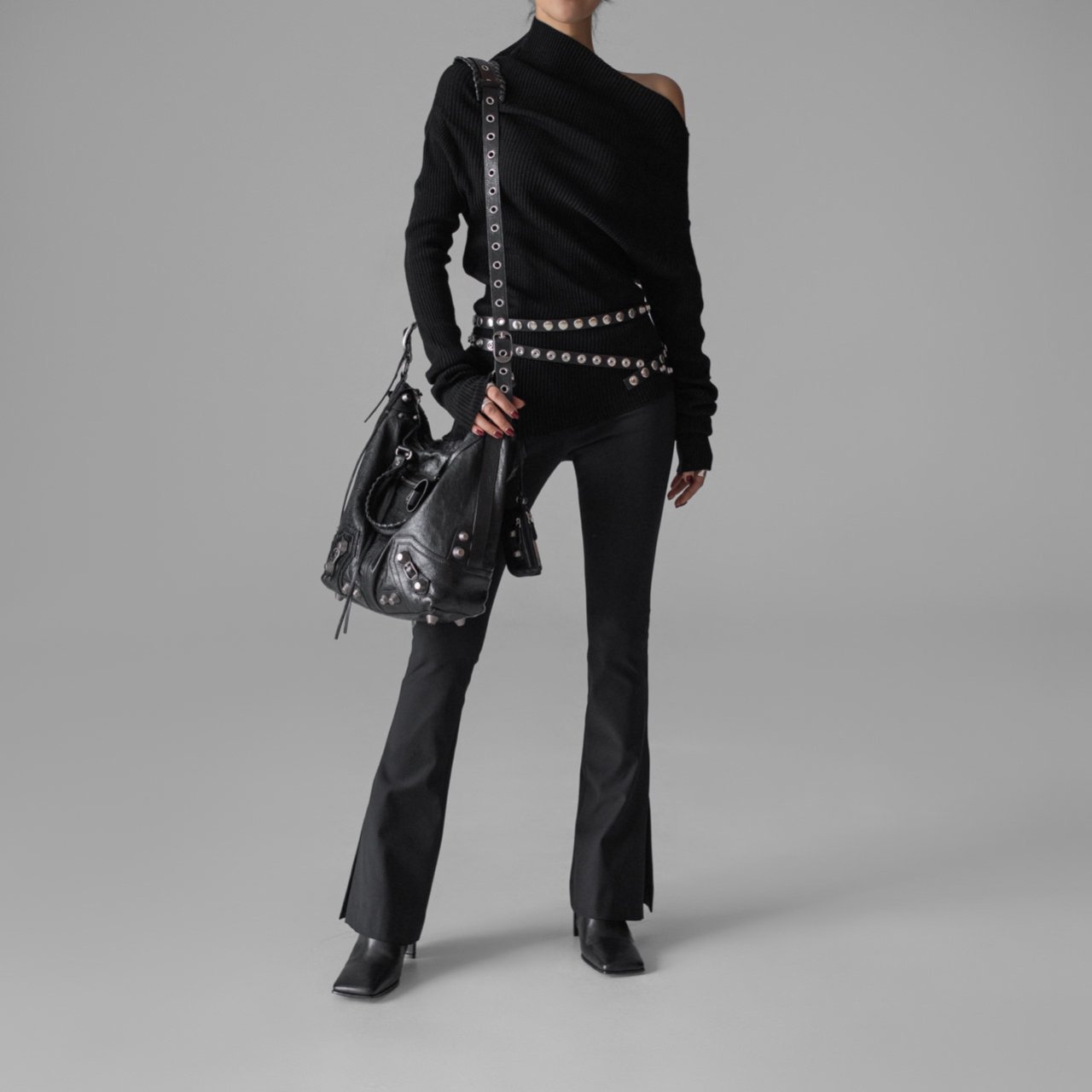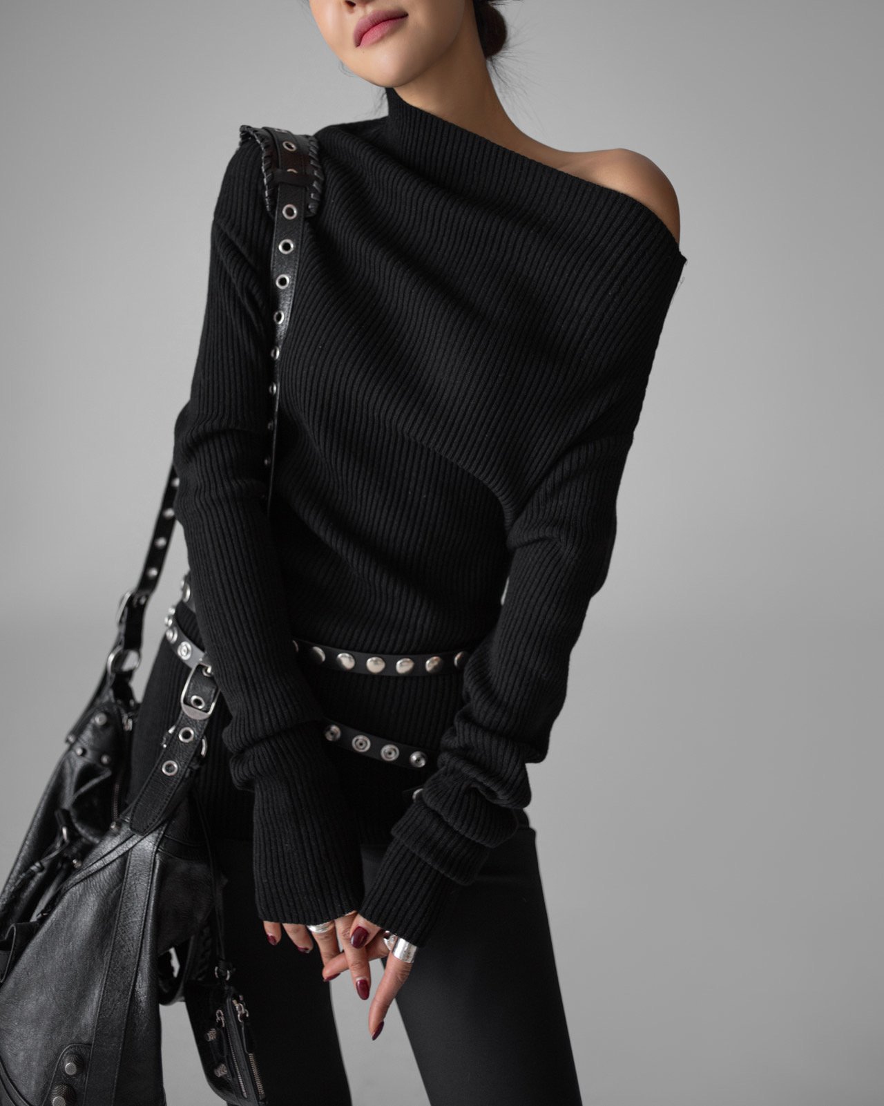 (PAPER MOON) ASYMMETRIC LINE RIBBED KNIT TOP : BLACK