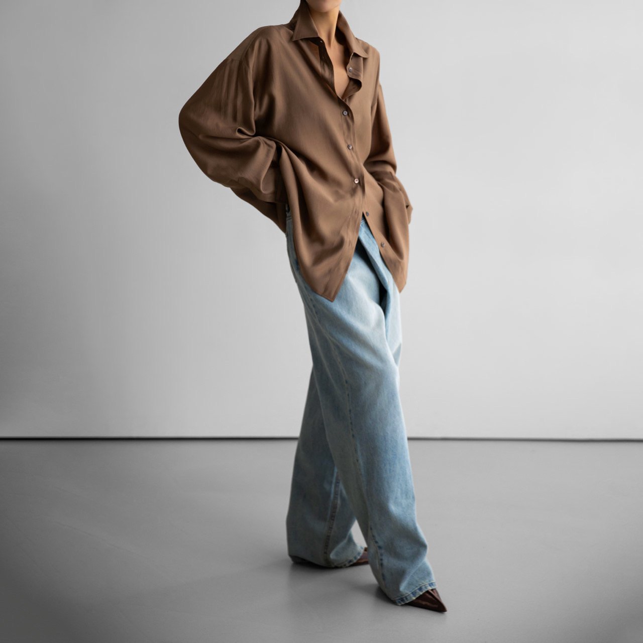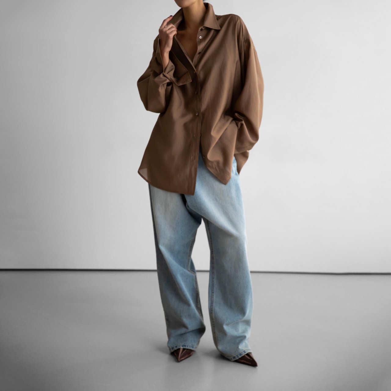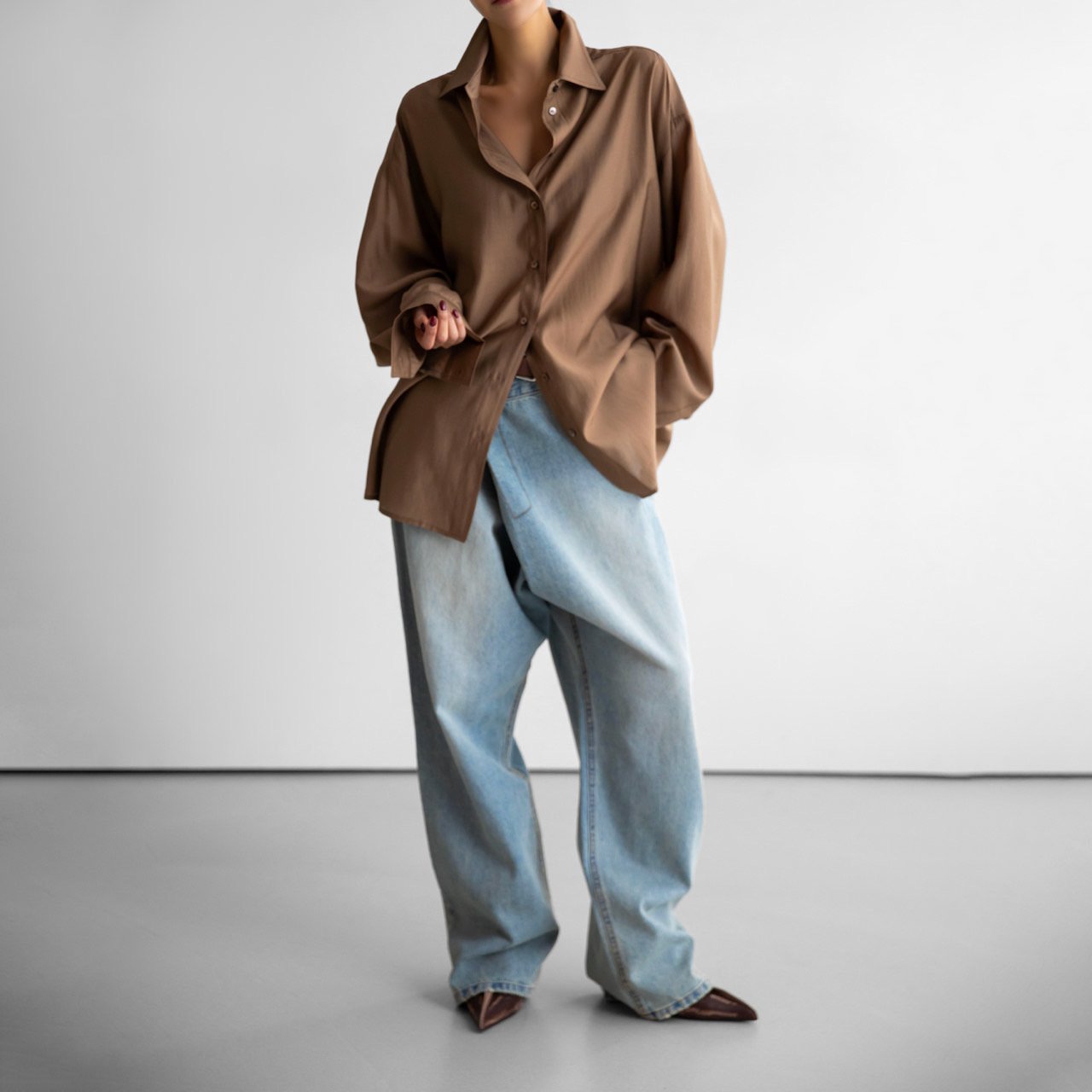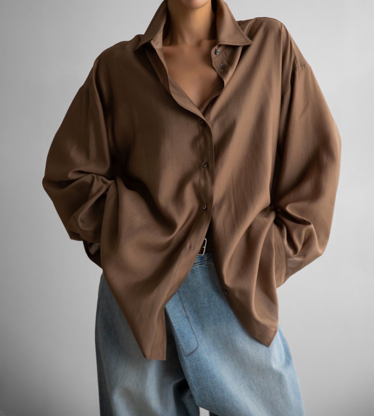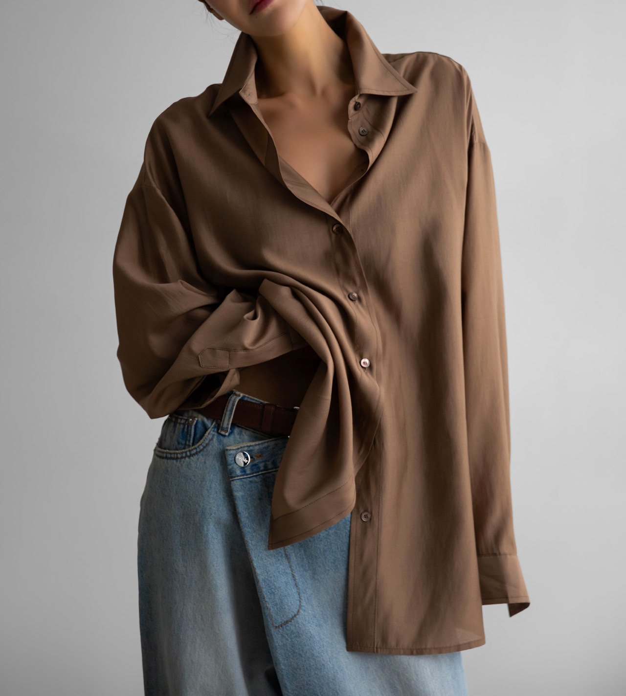 (PAPER MOON) SHEER SILKY CLASSIC BUTTON DOWN SHIRT : BROWN