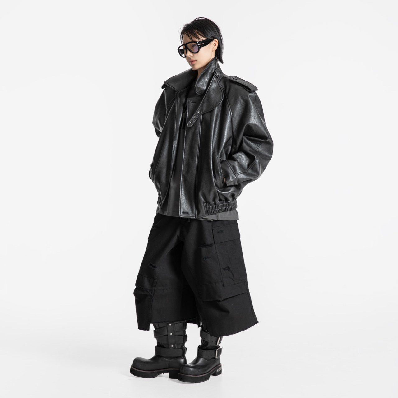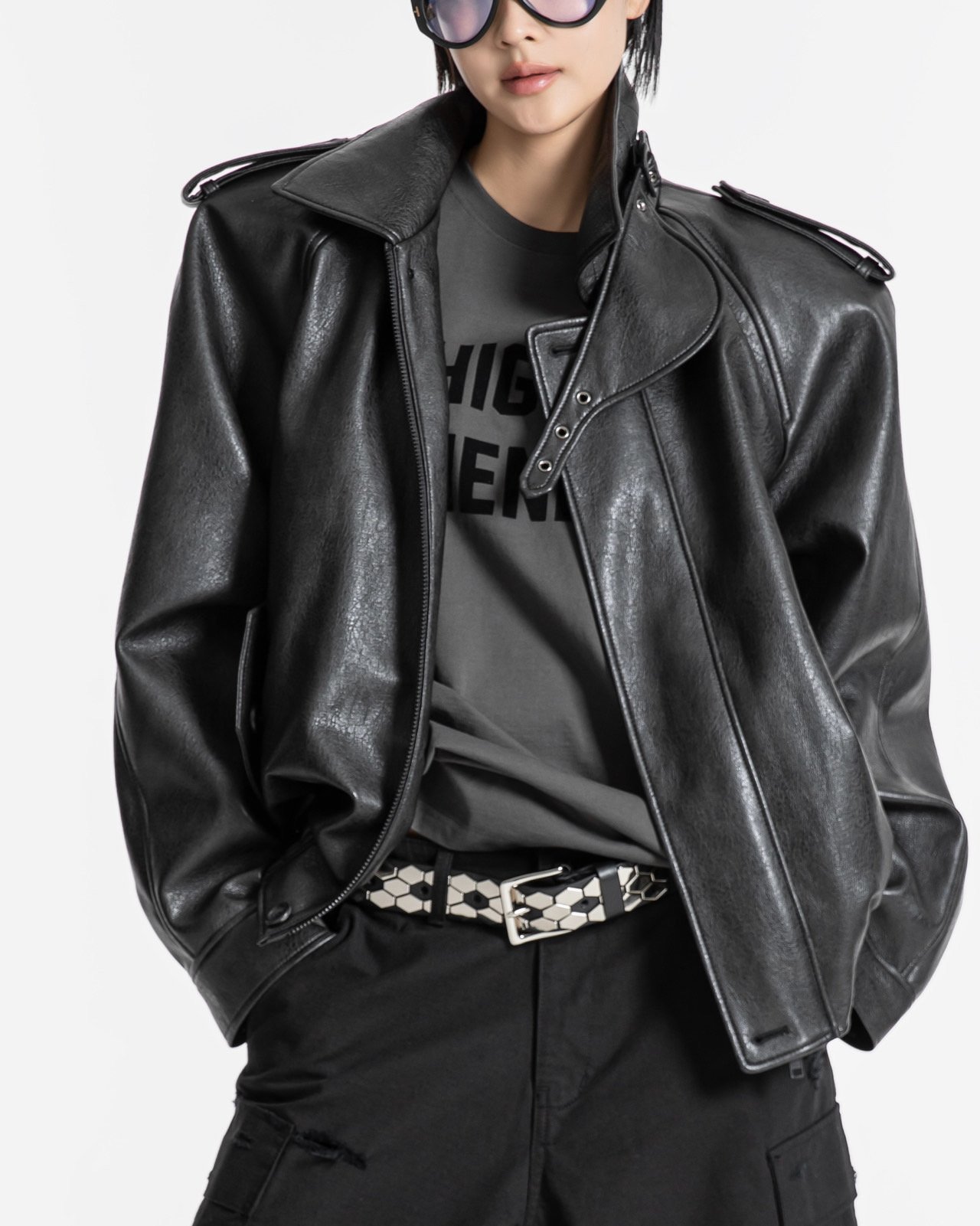 (PAPER MOON) OVERSIZIED VEGAN LEATHER BUTTON UP BOMBER JACKET : BLACK