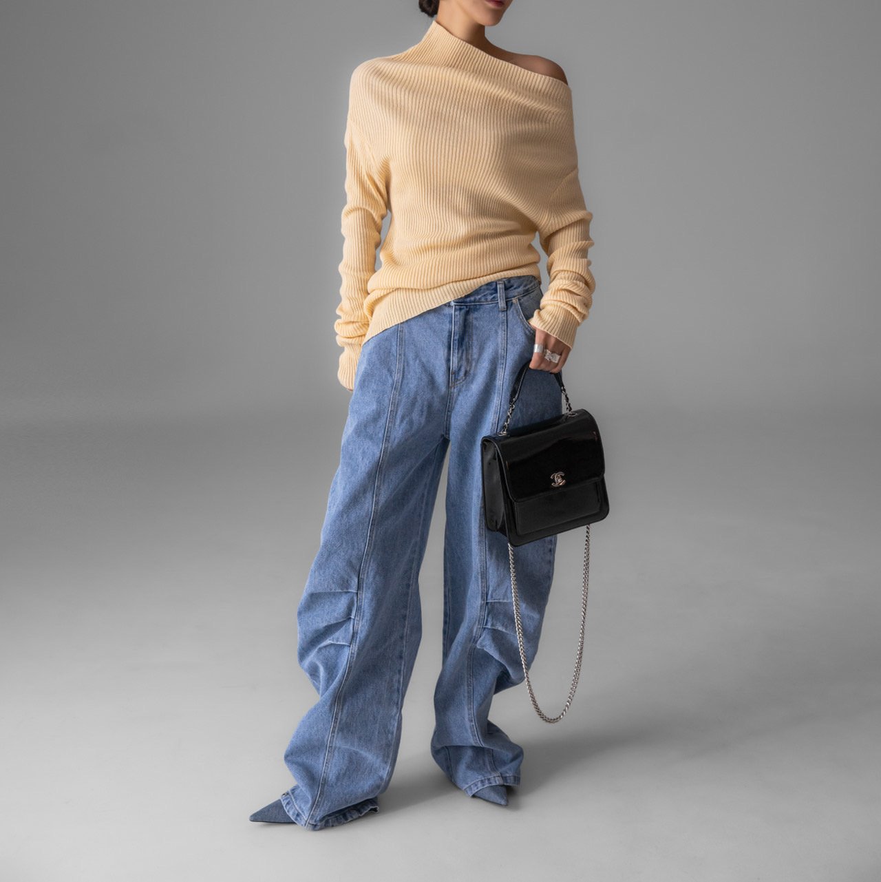 (PAPER MOON) VOLUME PINTUCK DENIM PANTS : WASHED MID BLUE